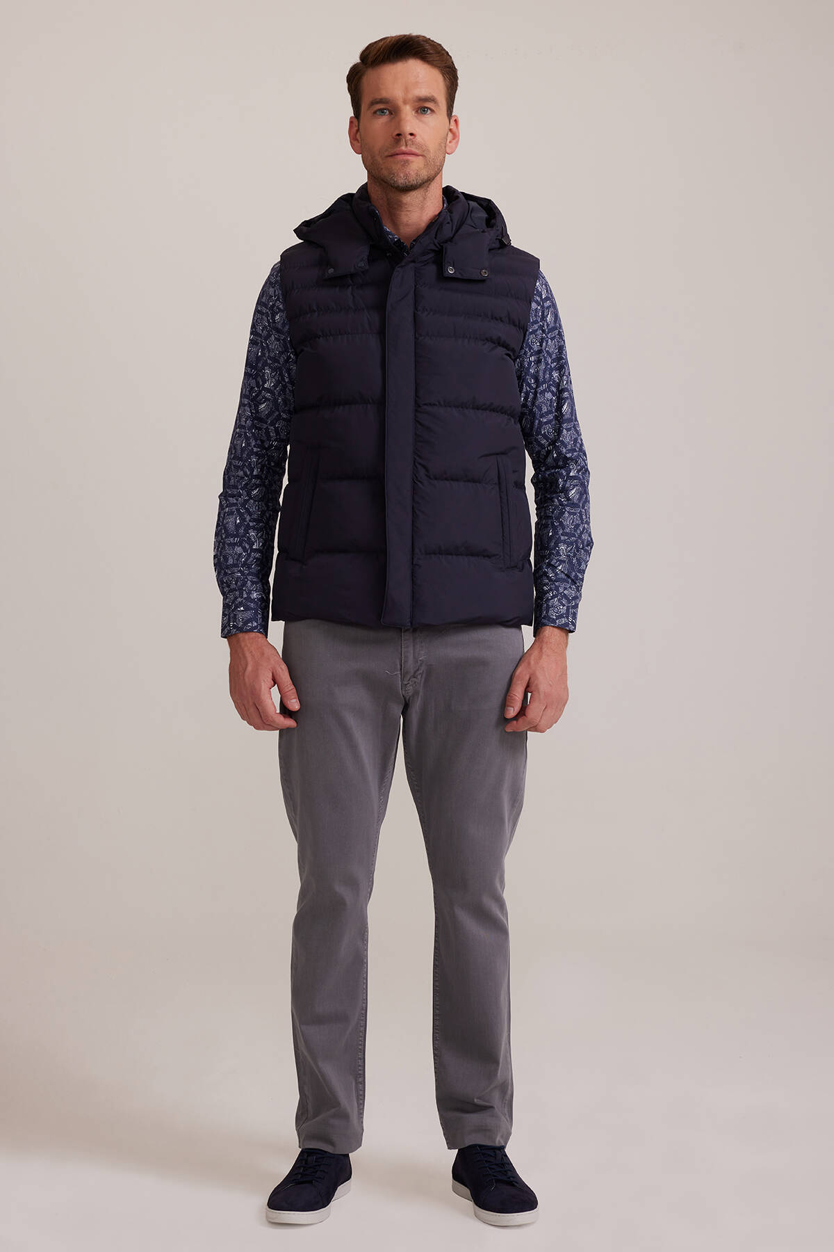 Basic ve zamansız tasarımın lüks detaylarla zenginleştirildiği erkek lacivert desenli yelek, özellikle geçiş mevsimlerinde güçlü ve karizmatik bir stile kavuşmanızı sağlar. Casual veya smart-casual parçalarla aradığınız havalı görünümü vadeden bu şık ürün, gri kot pantolon, desenli mavi gömlek ve siyah sneaker ayakkabı modelleri ile tamamlanabilir. Hafta sonu görünümünüz için tişörtler ve sweatshirtlerle ekstra sıcaklık katmanı oluşturabilir. YSF Giyim’in eşsiz tecrübesine dayanarak hazırlanan dış giyim koleksiyonunda gustosu yüksek erkeklere uygun lüks tasarımlar yer alır. Siz de erkek dış giyim modelleri ile modayı yakından takip eden ve hatta yön veren YSF Giyim’in özel fiyatları ve alışveriş ayrıcalıkları ile gardırobunuzu dört mevsime hazırlayabilirsiniz.