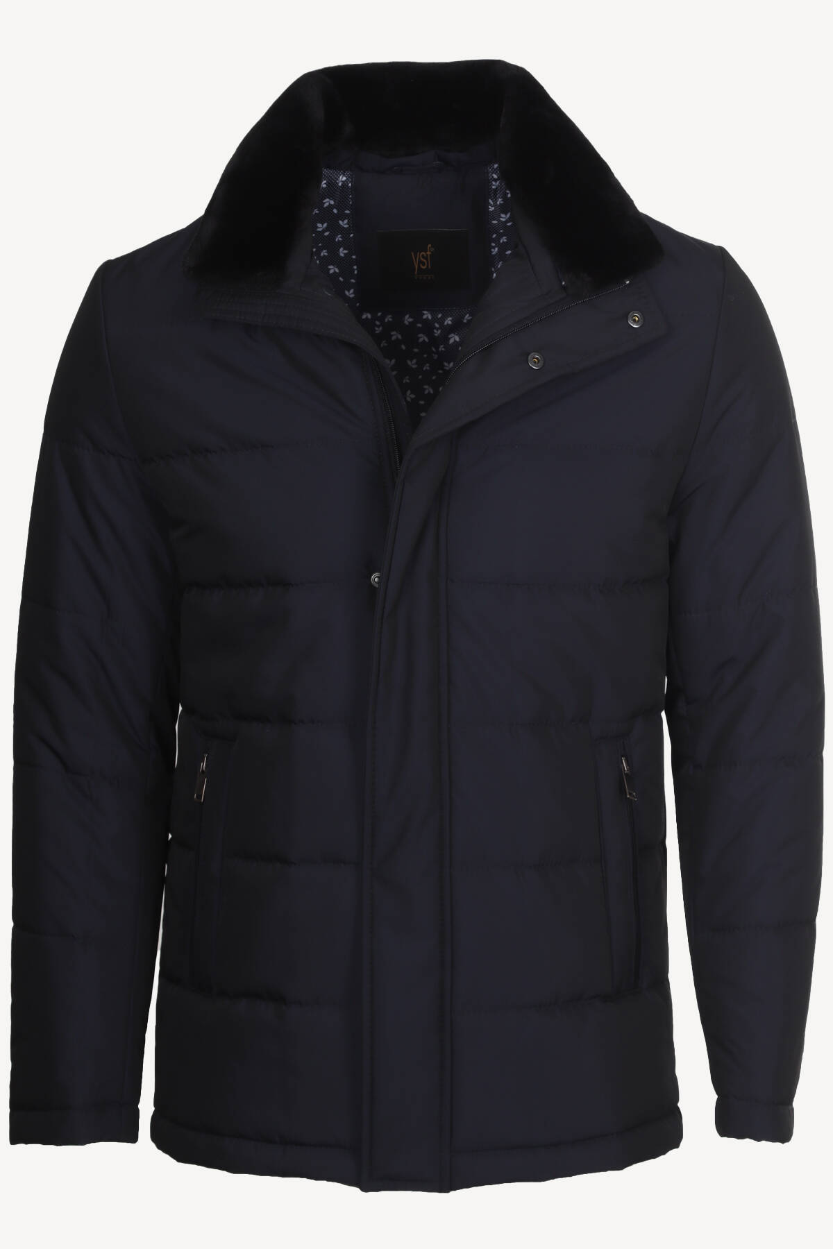 Erkek Lacivert Sarı Kürklü Yaka Klasik Kaban