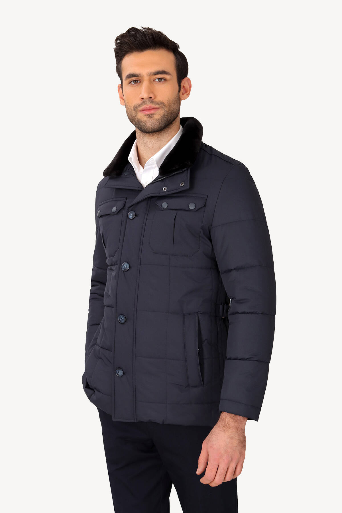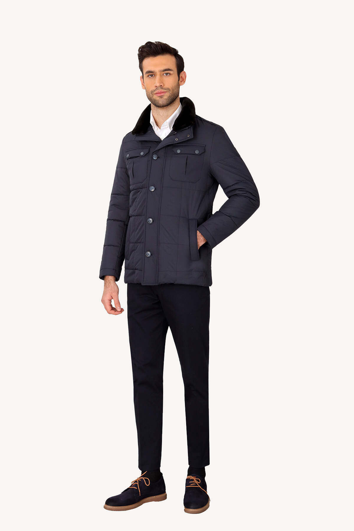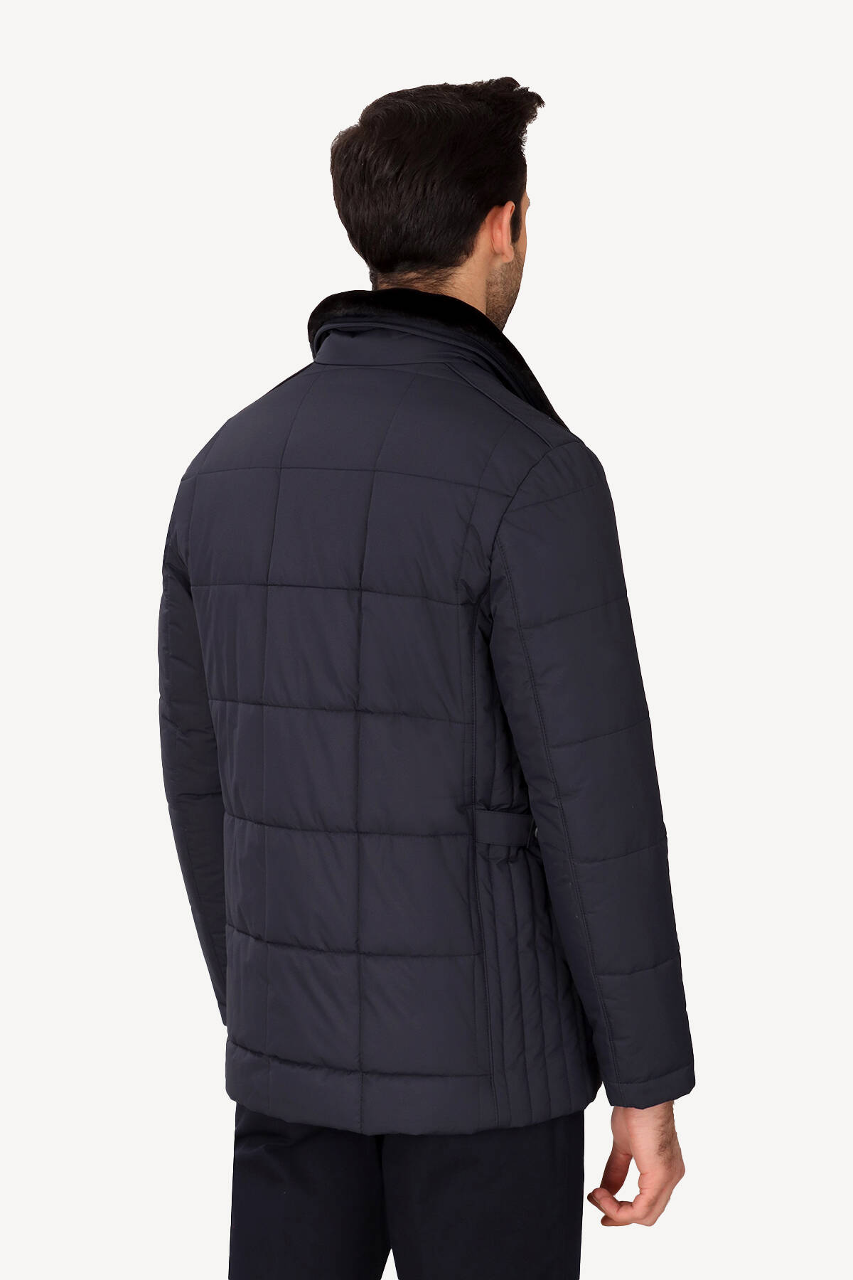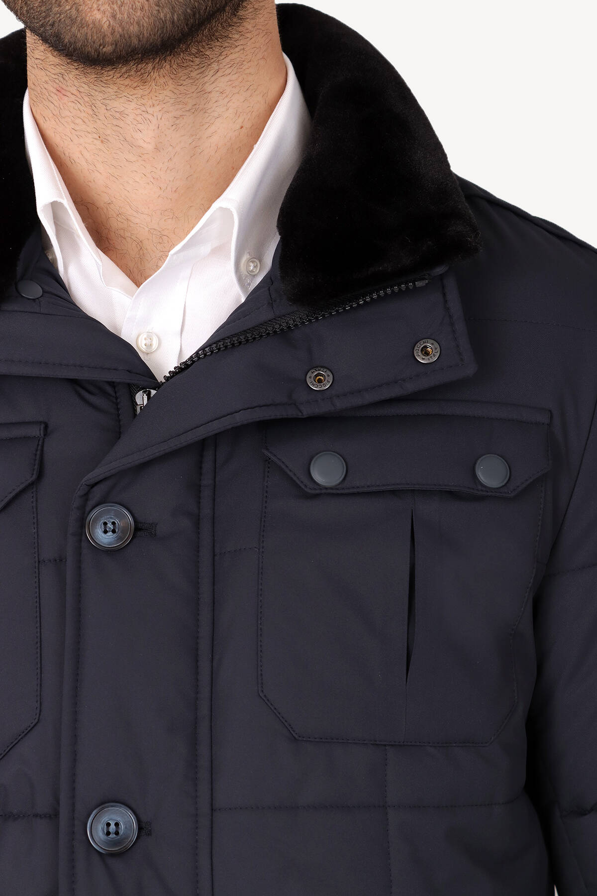 Erkek Lacivert Kürklü Yaka Klasik Kaban