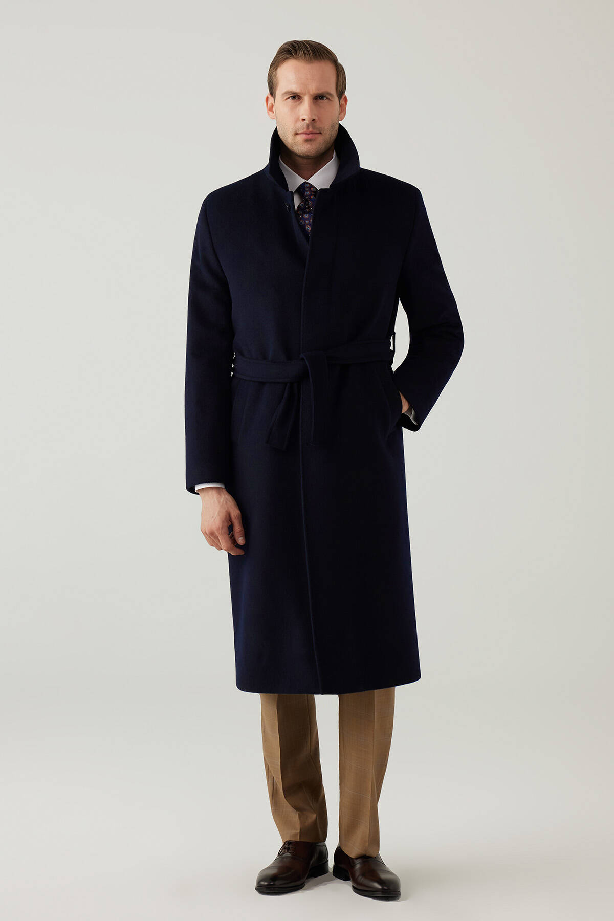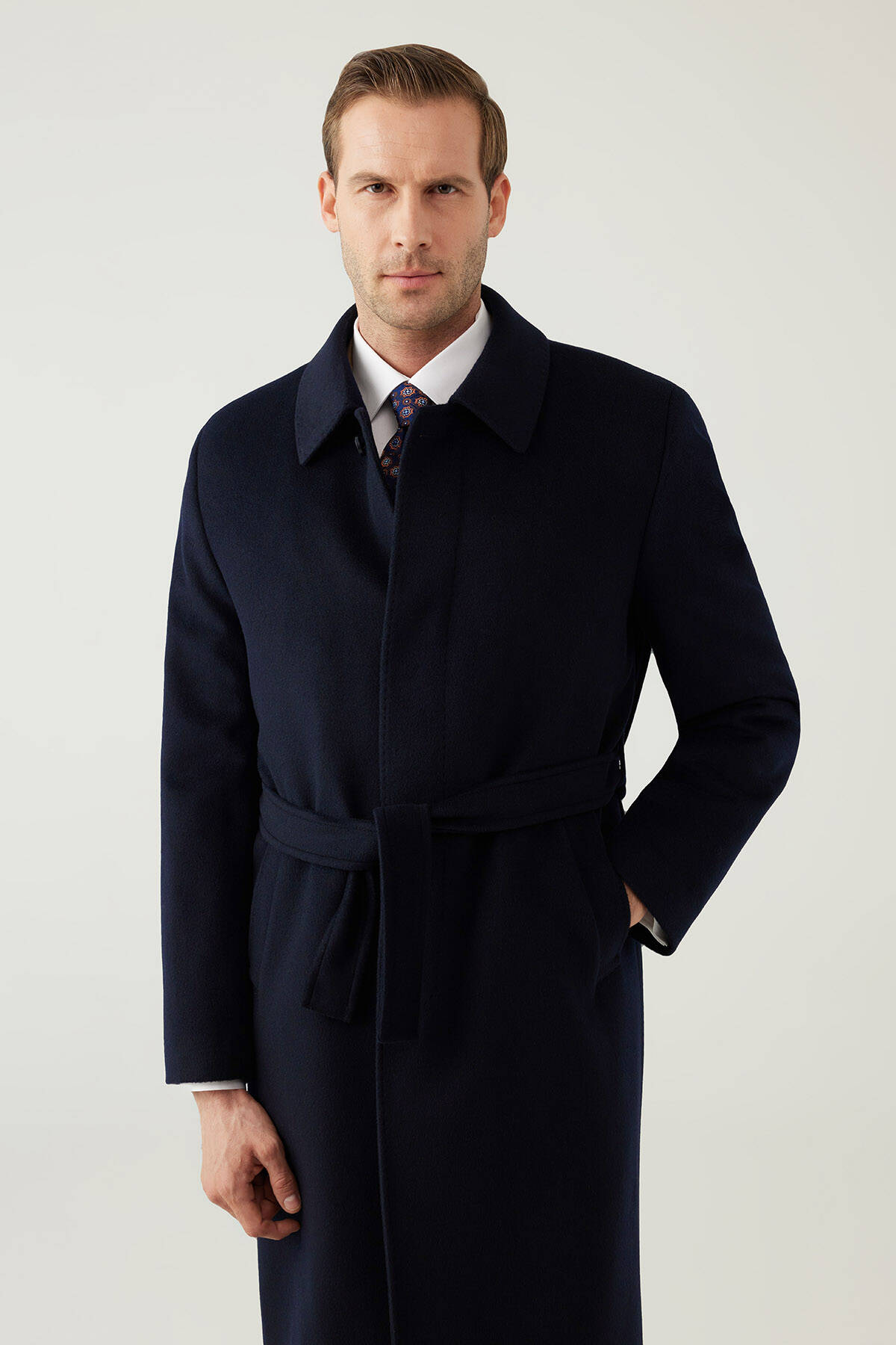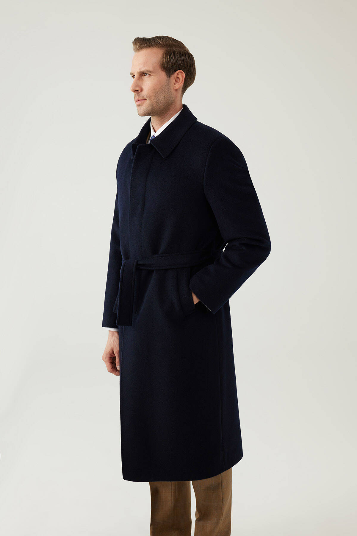 parçalarından biri olan Erkek Lacivert Regular Fit Kaşmir Uzun Kuşaklı Palto, elegan ve sofistike bir tavrı tercih eden erkekler için idealdir. Kaşmir ve yün ipliklerinin özel karışımından üretilmiş uzun bir tasarıma sahiptir.