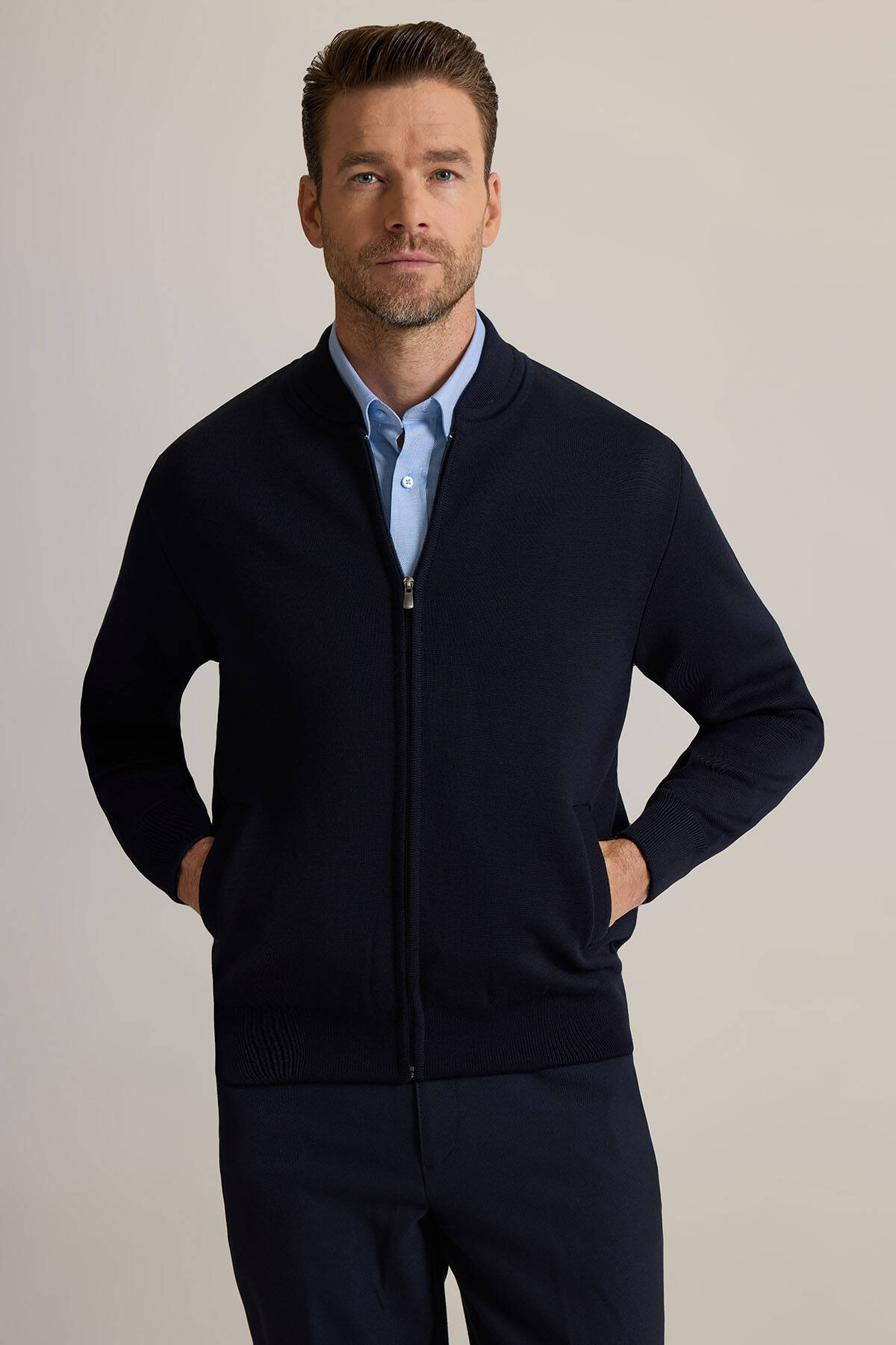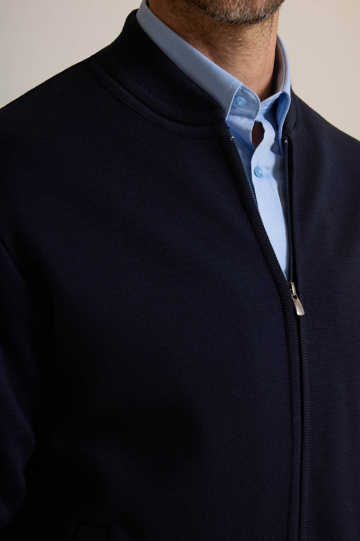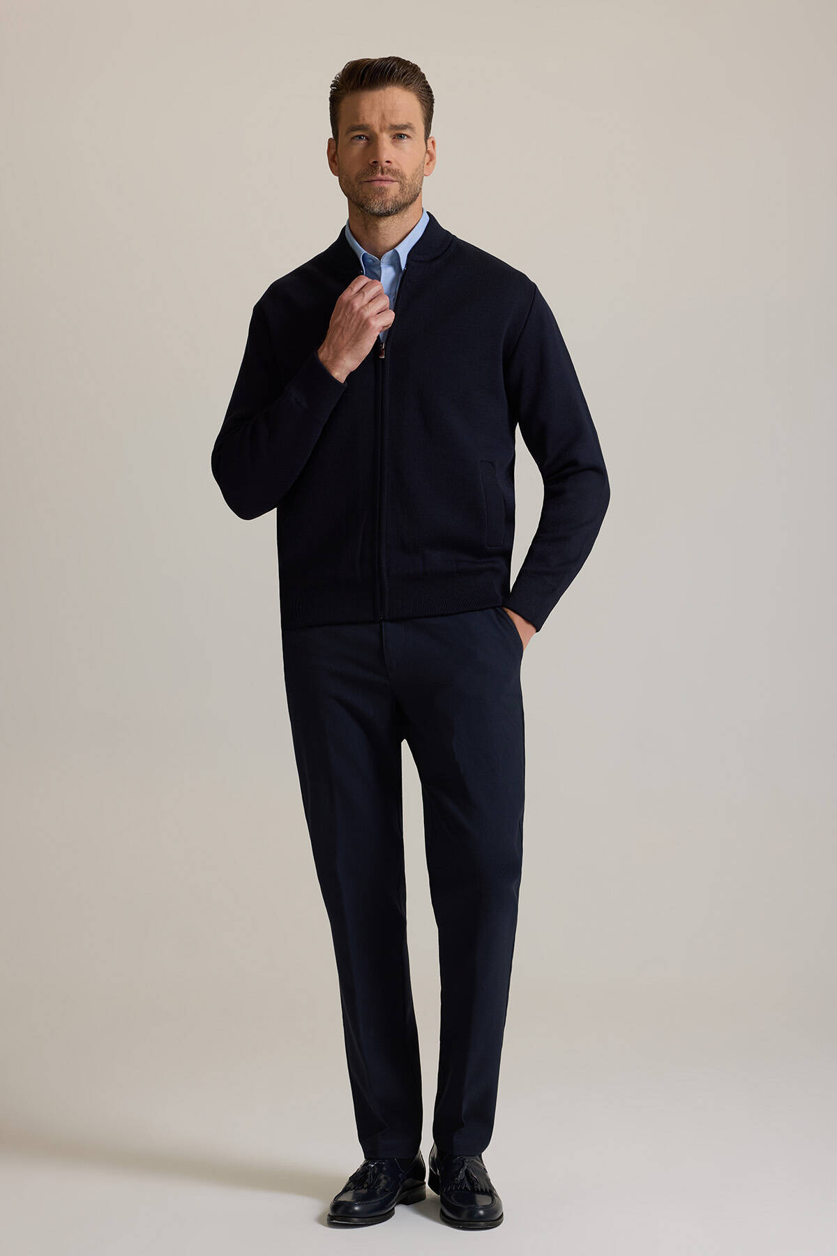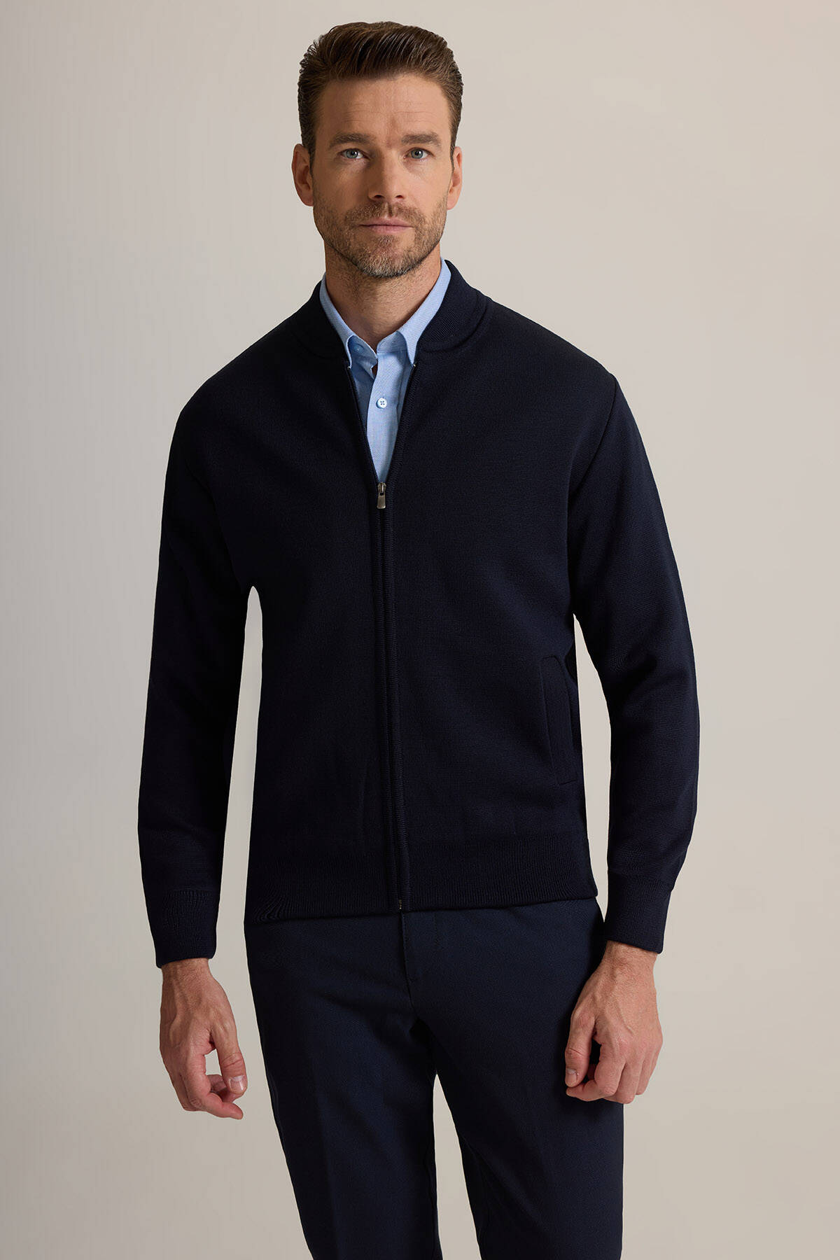 Erkek Lacivert Sıfır Yaka İçi Astarlı Fermuarlı Triko Hırka