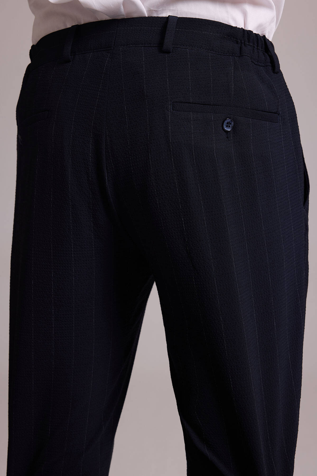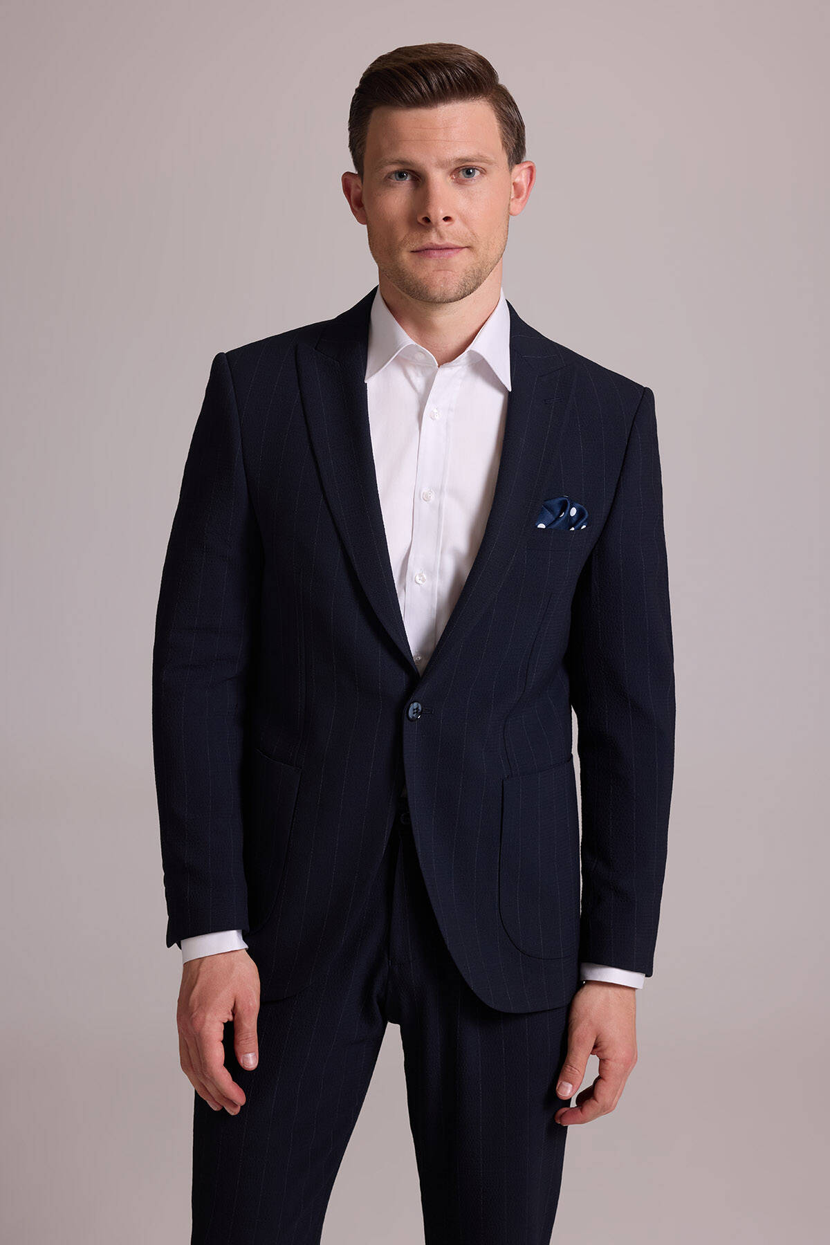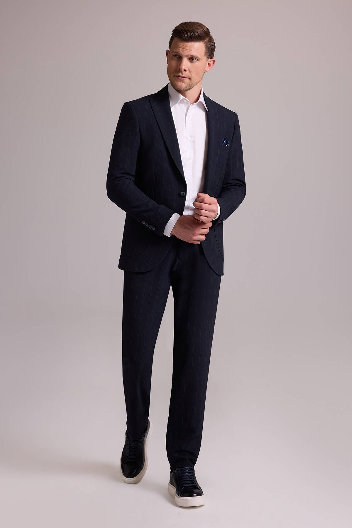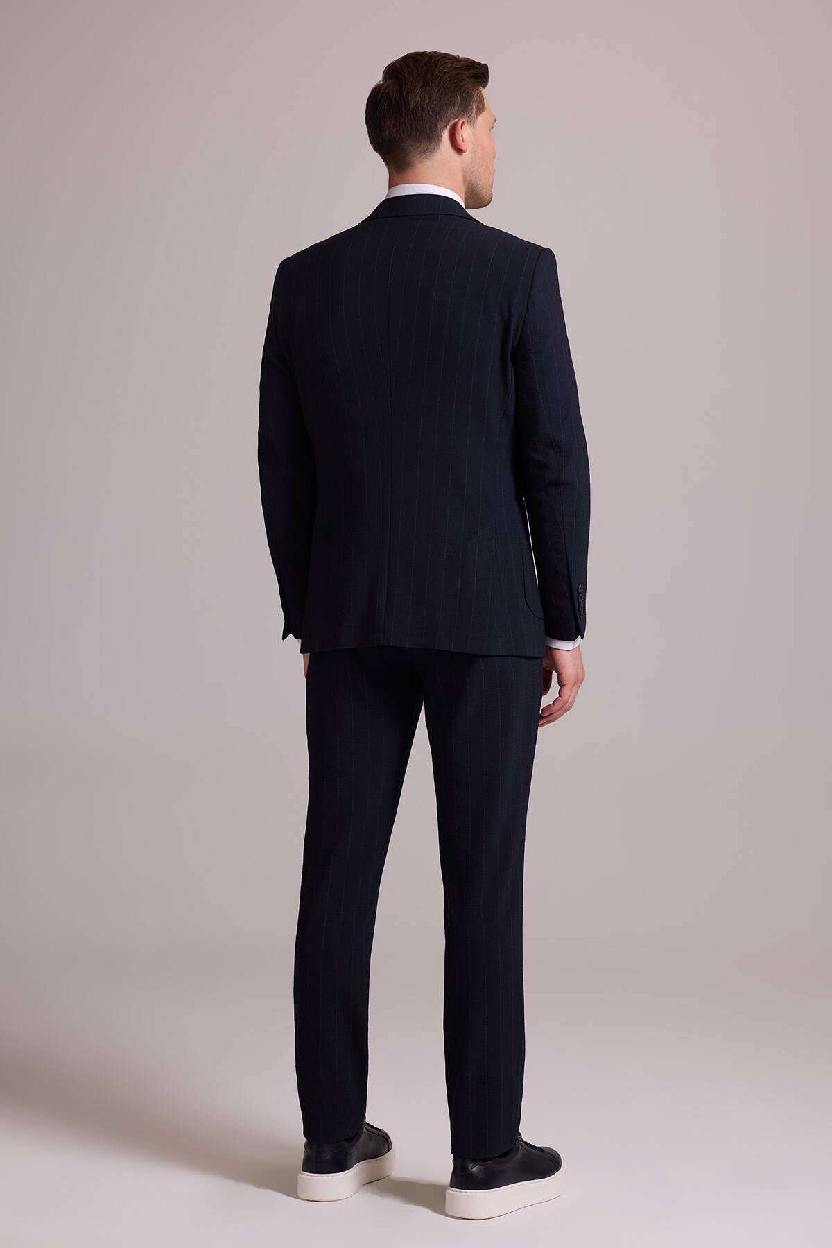 Erkek Lacivert Slim Fit Çizgili Tek Düğmeli Jogger Pantolonlu Takım Elbise