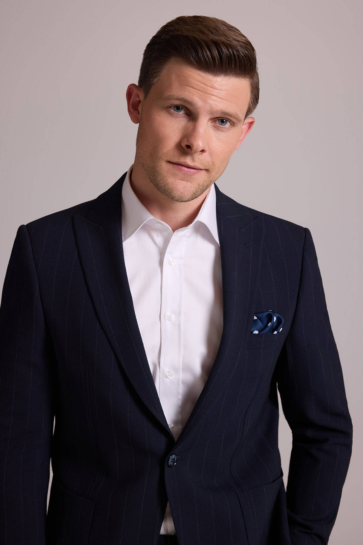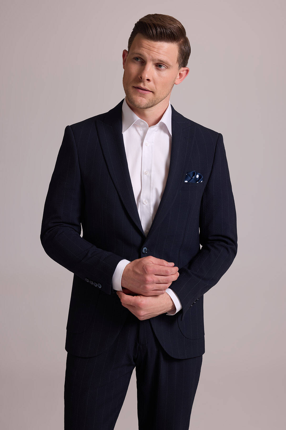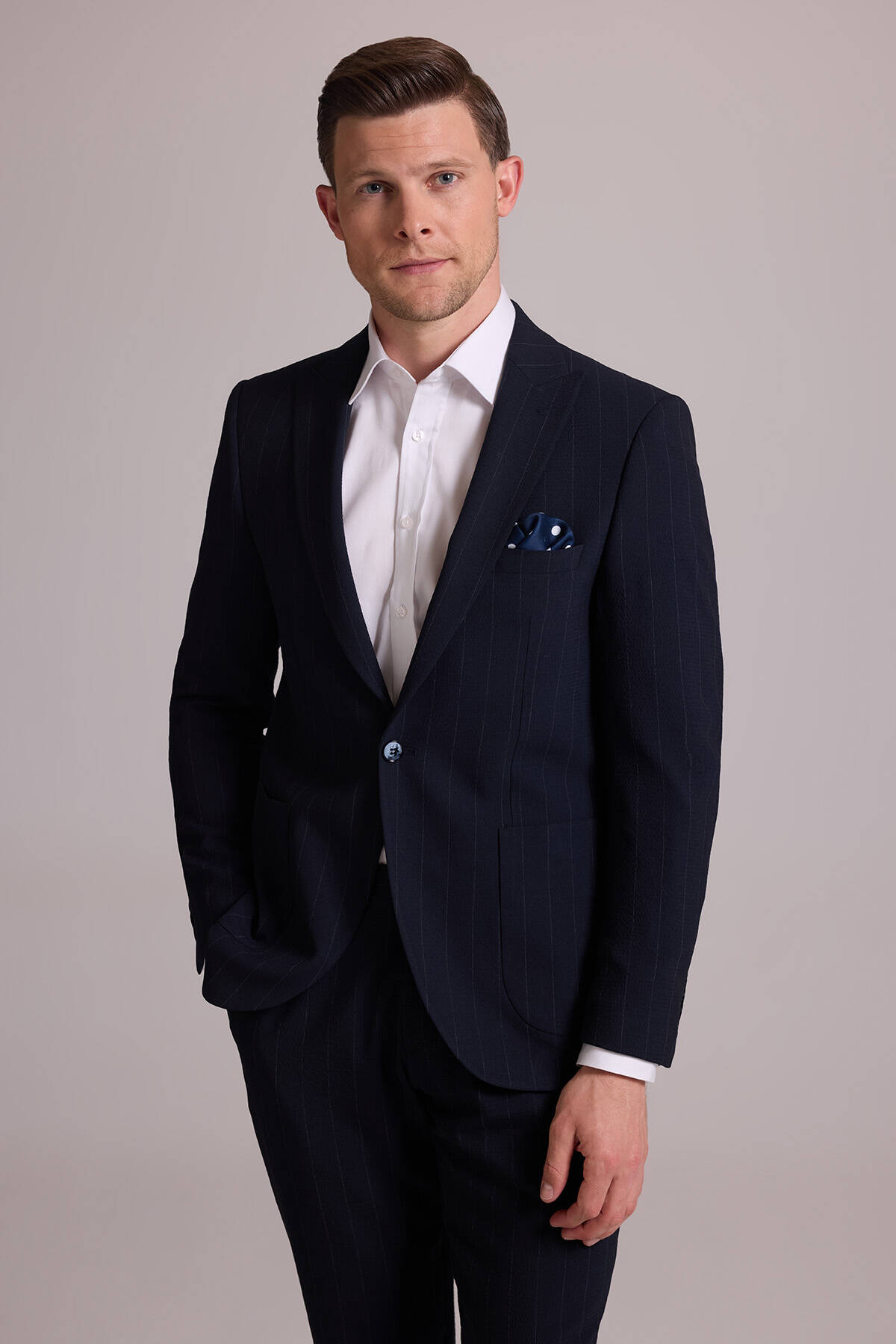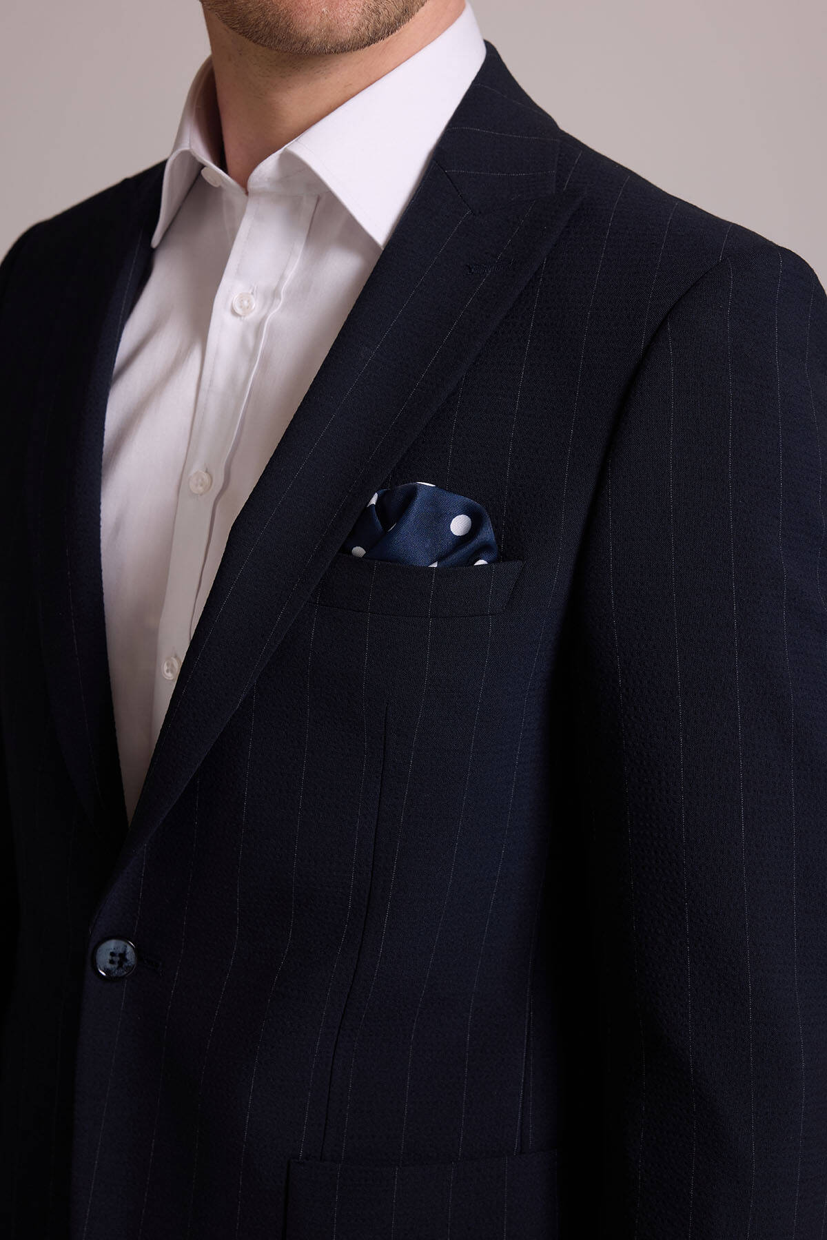 Erkek Lacivert Slim Fit Çizgili Tek Düğmeli Jogger Pantolonlu Takım Elbise