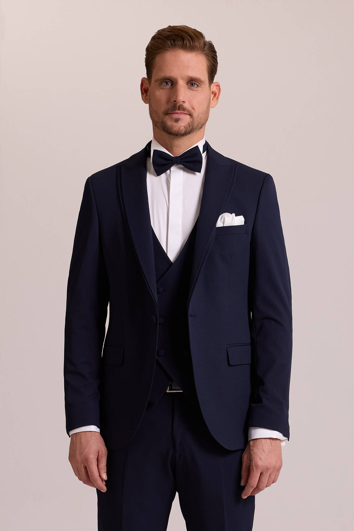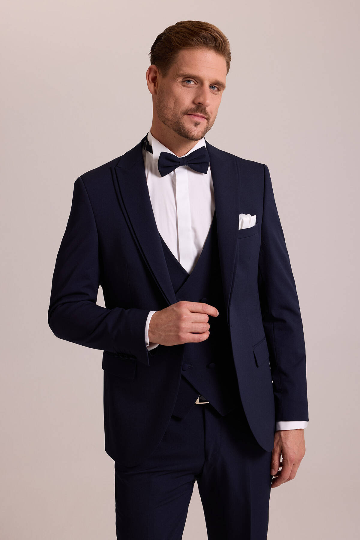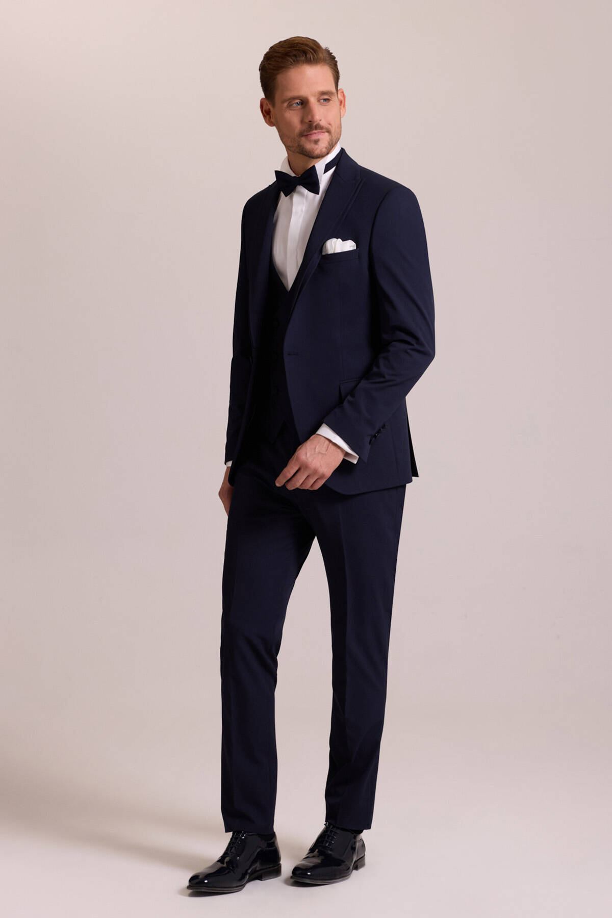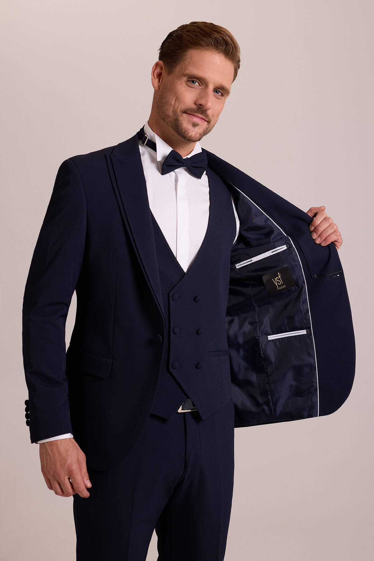 Pürüzsüz esnek dokuya sahip damatlığın sivri yaka detayları, gösterişli bir görünüm için optimum zarafet sunar. Kusursuz kesime sahip olan ceket ve yelek dar paçalı pantolonla desteklenerek İtalyan tarzı kusursuz duruşu vurgular. Lacivertin kraliyete yakışan zarafetini öne çıkarmak için beyaz slim fit gömlek, siyah deri kemer, papyon, beyaz cep mendili ve siyah rugan klasik ayakkabı seçebilirsiniz. YSF Giyim, mutlu anlarınızda göz alıcı ve lüks bir tarz elde edebilmeniz için kişiye özel dikim kalitesinde damatlık modelleri sunar. Yaklaşan düğün, söz ya da nişan gibi özel anlarınıza yakışan bir zarafet için en klas damatlık modellerini YSF Giyim ayrıcalıkları ile seçebilirsiniz!