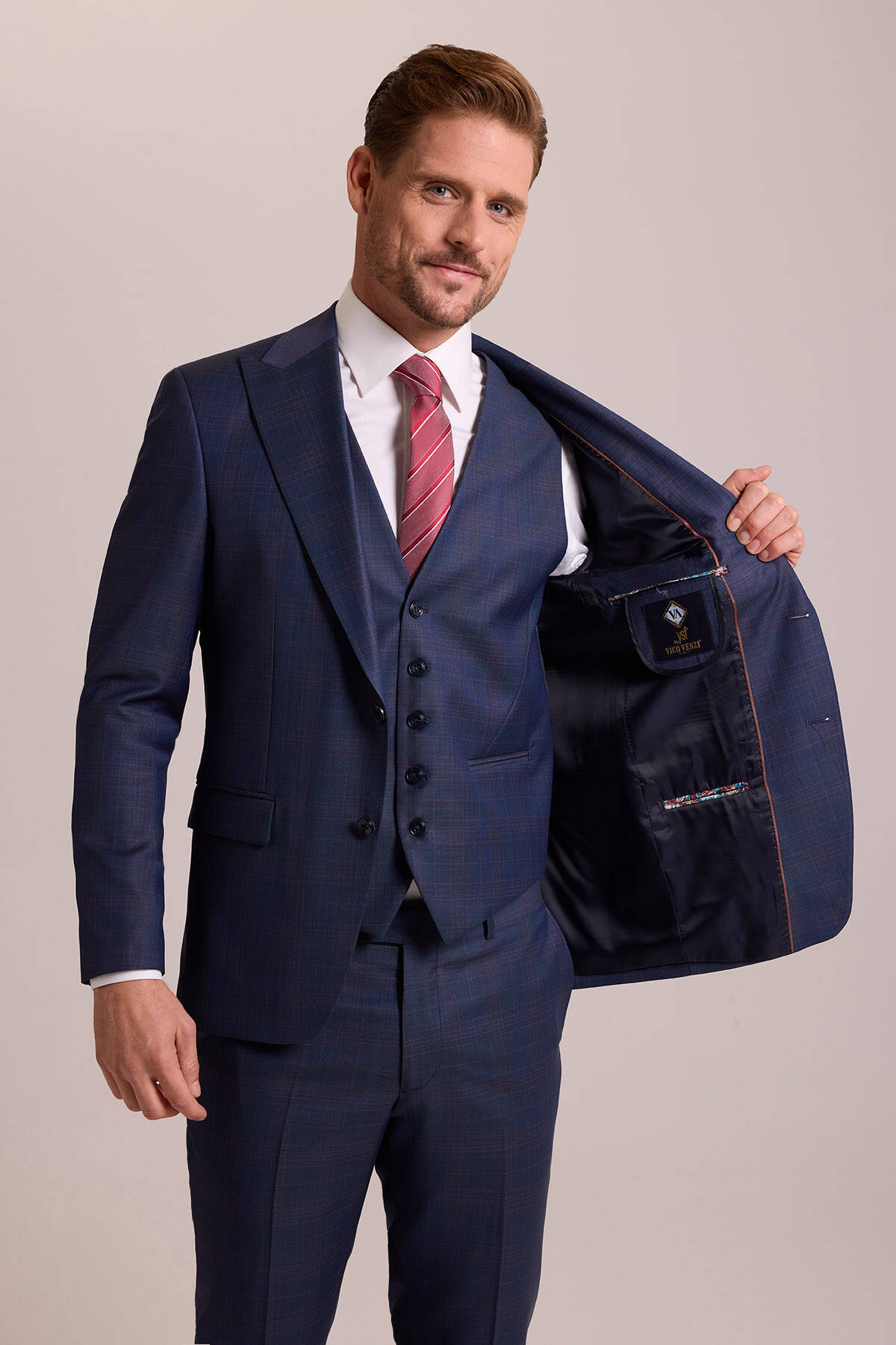 Elegan bir ifade yaratan lacivert tonu, yelekli takım elbisenin her ortamda fark edilir olmasını sağlar. Ekose desenleri öne çıkaran güçlü bir tarz için beyaz gömlek, siyah klasik ayakkabı, beyaz cep mendili ve kırmızı tonlarda desenli kravat ile kusursuz görünür. Özel dikim bir kesime sahip bu slim fit takım elbise önemli iş toplantıları ya da özel günlerde kurtarıcınız olabilir. YSF Giyim klasik estetiği ve yüksek kaliteyi yansıtan slim fit takım elbise modellerini beğeniye sunar. Siz de profesyonel ya da sosyal çevrelere uygun lüks takım elbiseleri YSF Giyim’e özel fiyatlarla satın alarak iddialı bir stil oluşturabilirsiniz!