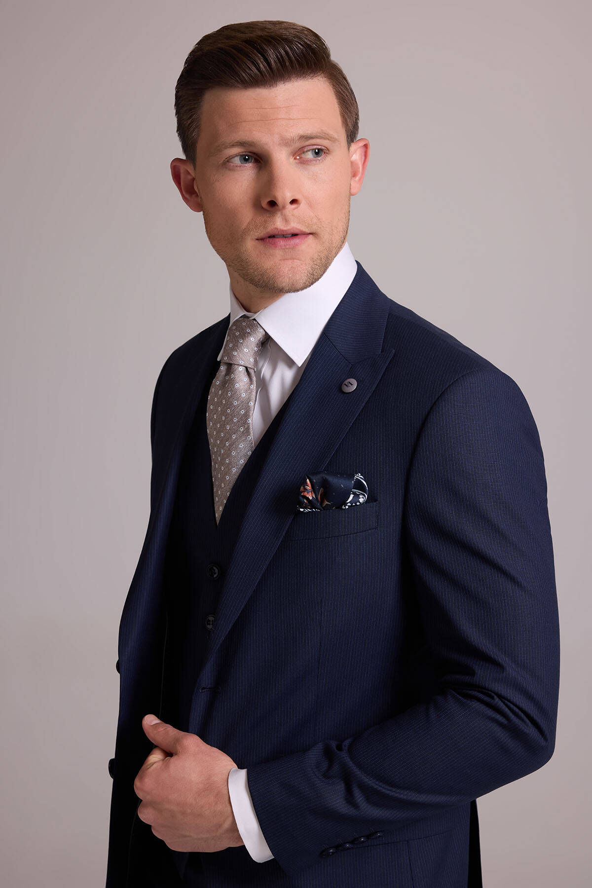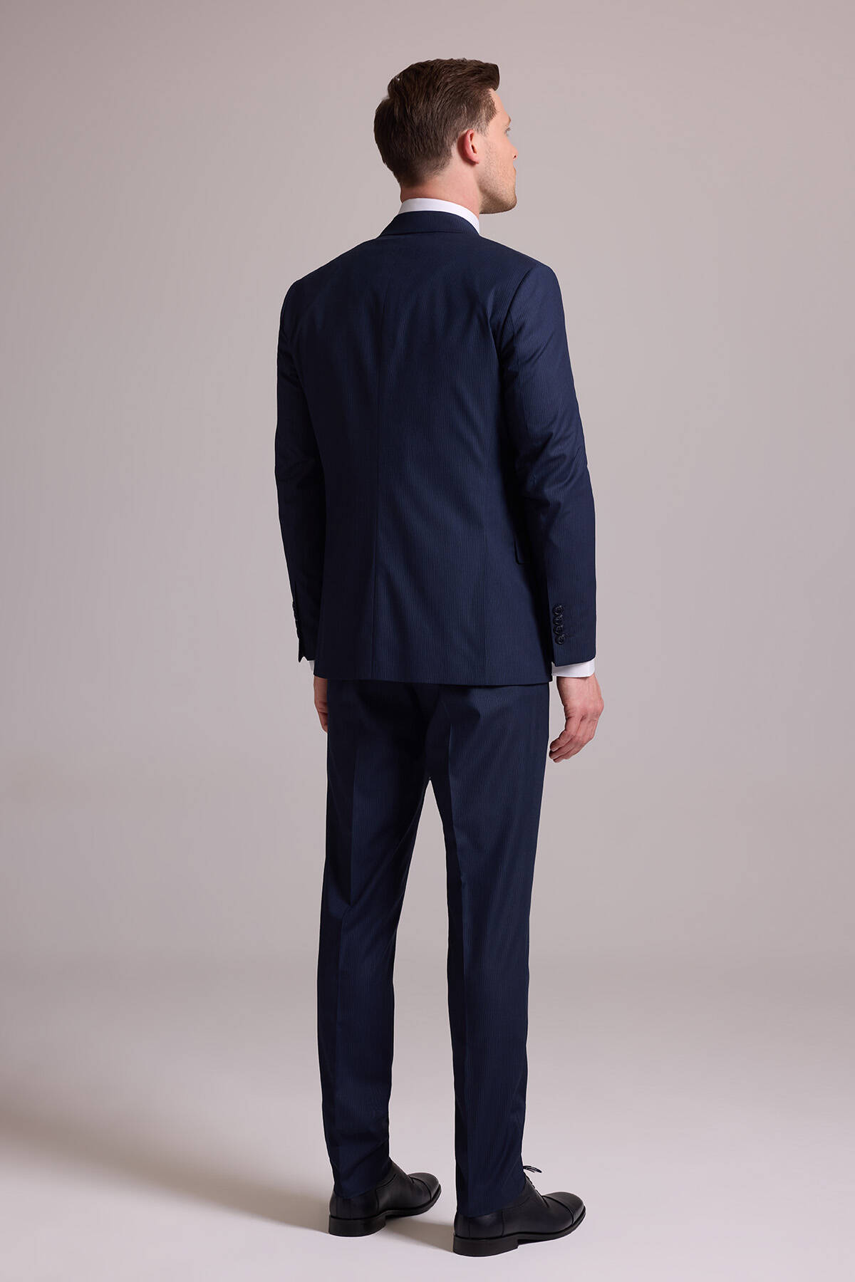 Erkek Lacivert Slim Fit Yün Karışımlı Sivri Yaka Çizgili Yelekli Takım Elbise