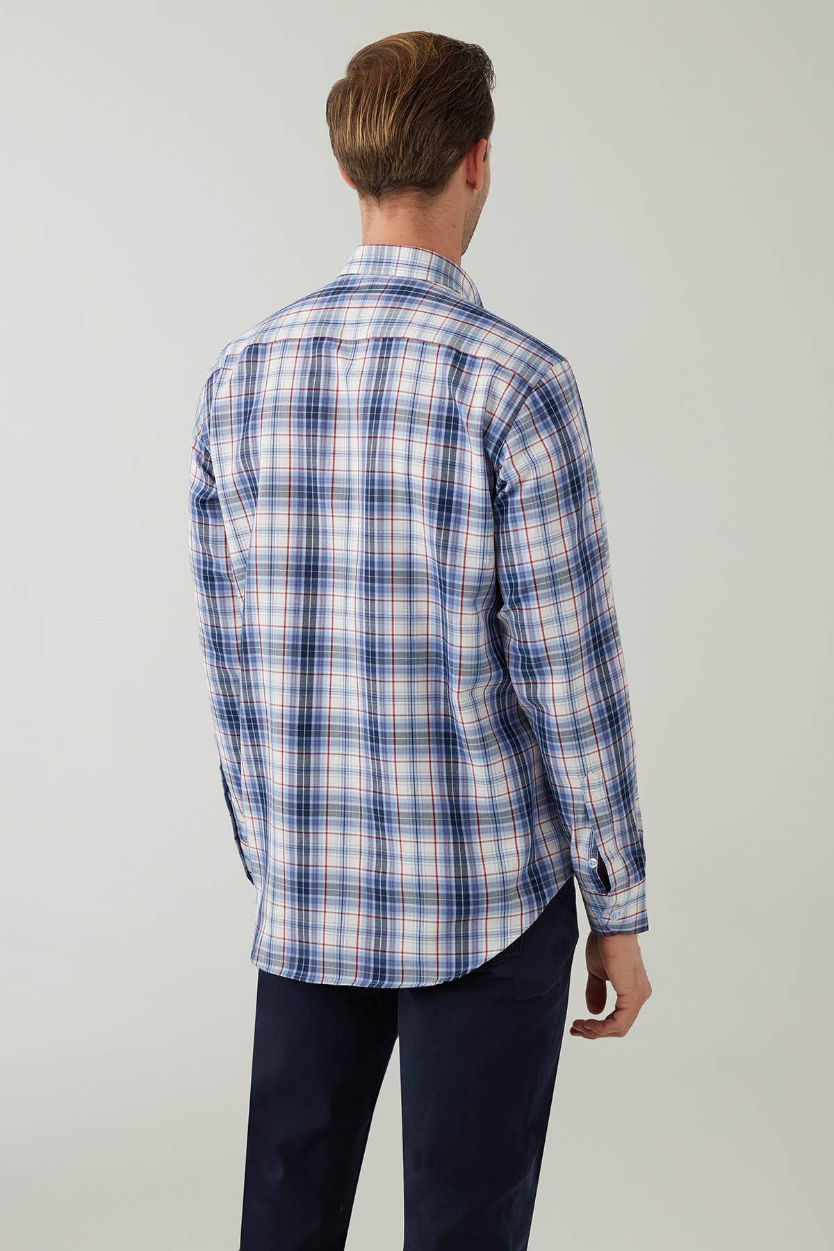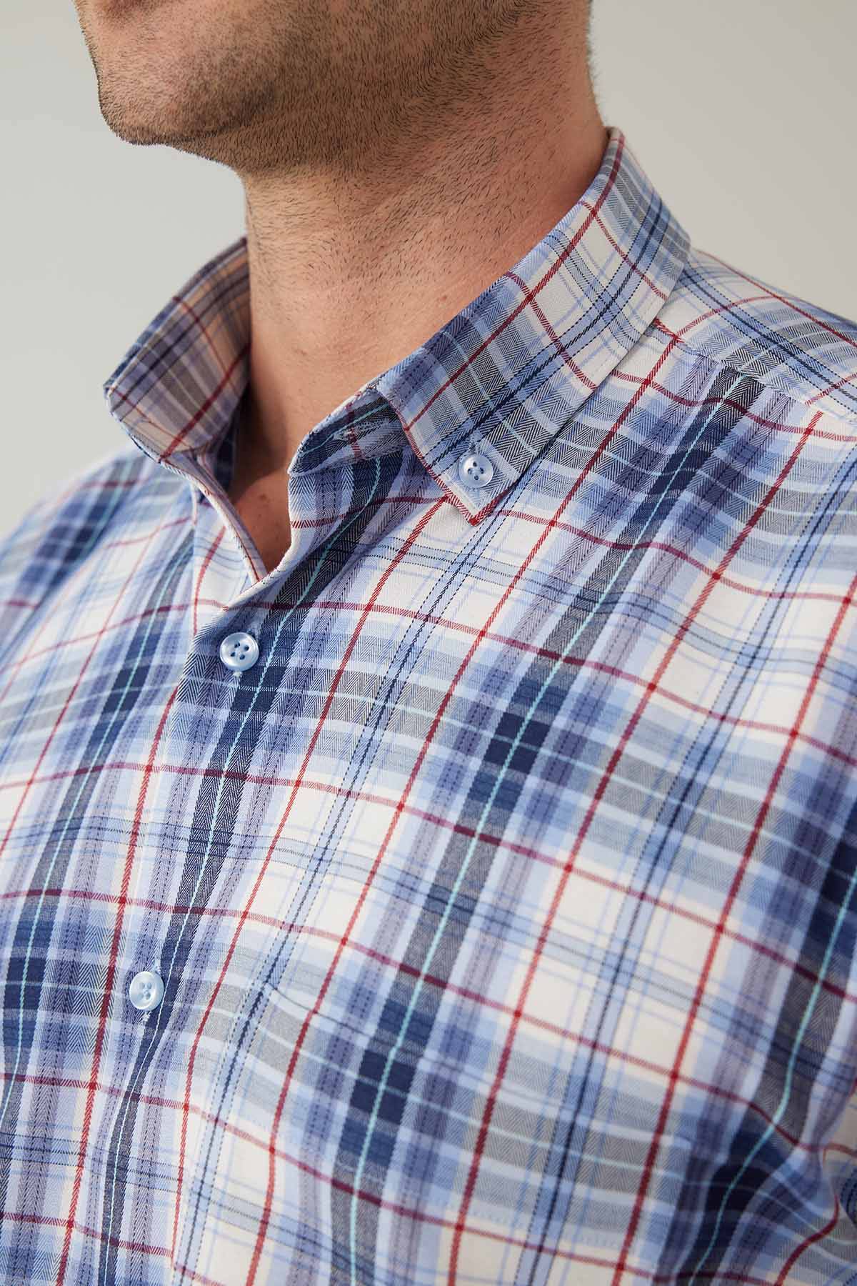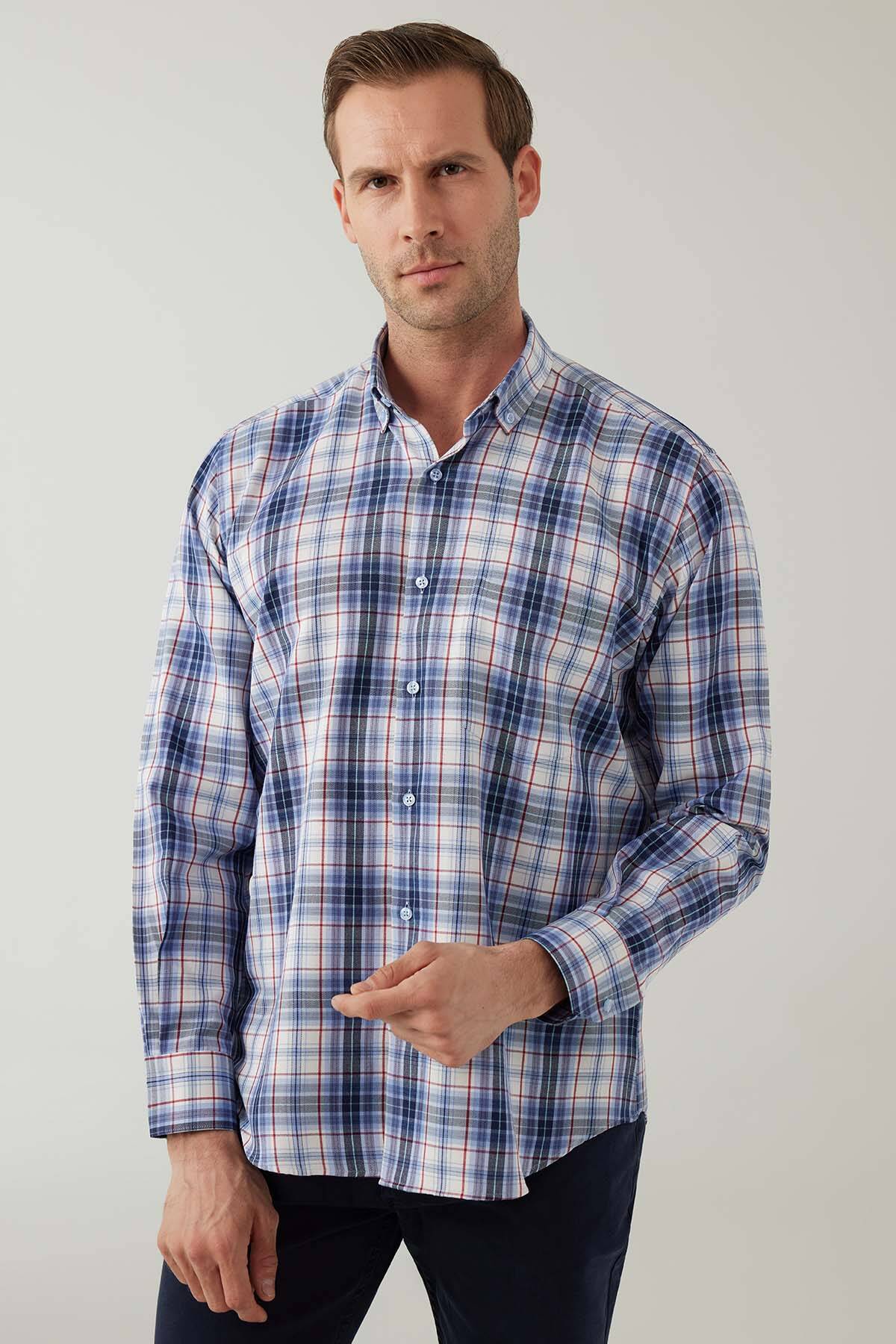 Erkek Mavi Beyaz Regular Fit Kare Desenli Pamuklu Gömlek