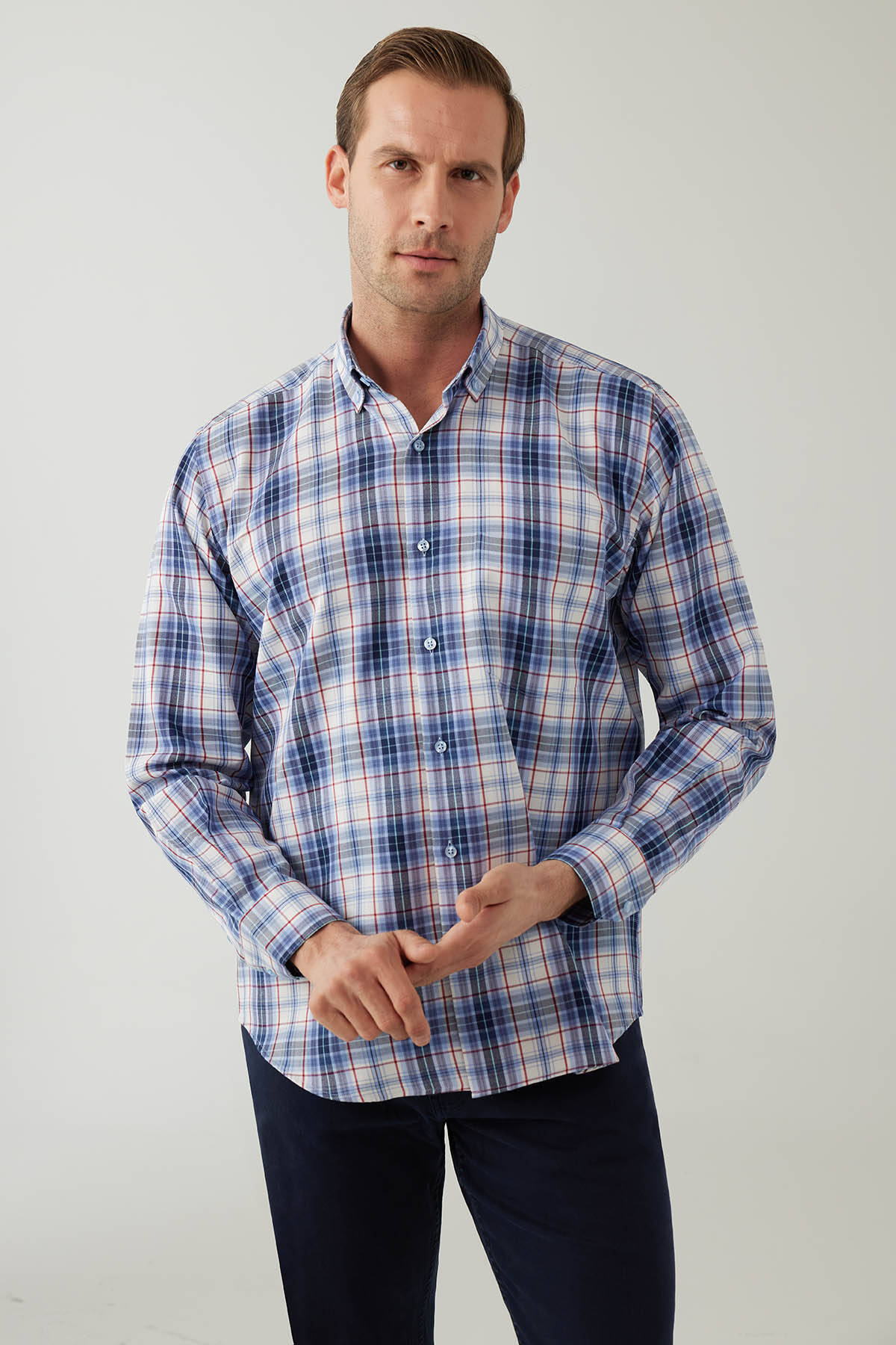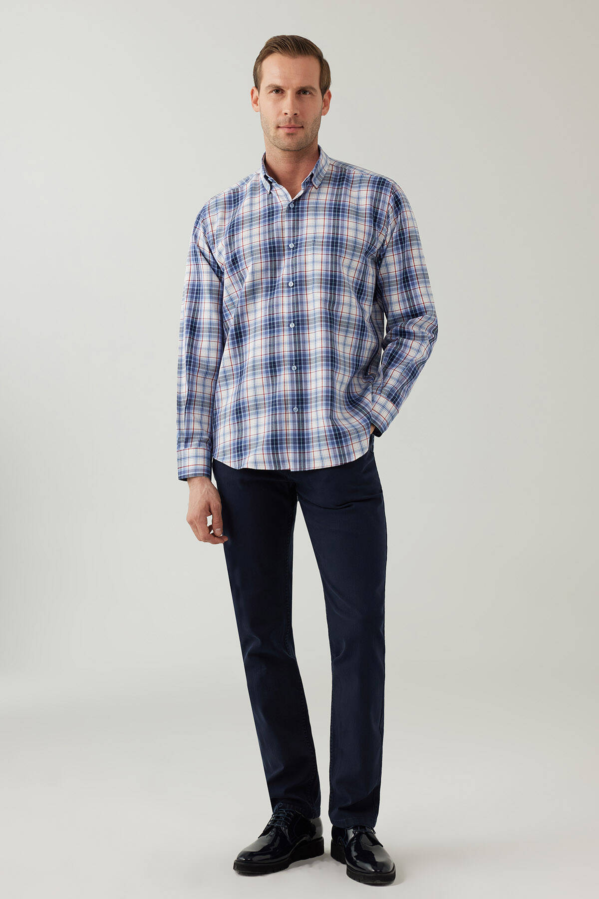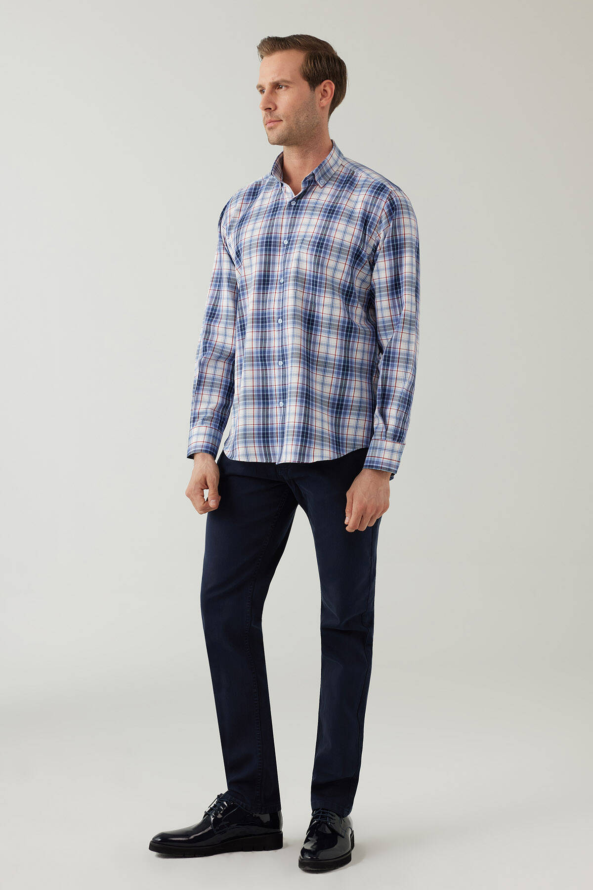 Erkek Mavi Beyaz Regular Fit Kare Desenli Pamuklu Gömlek