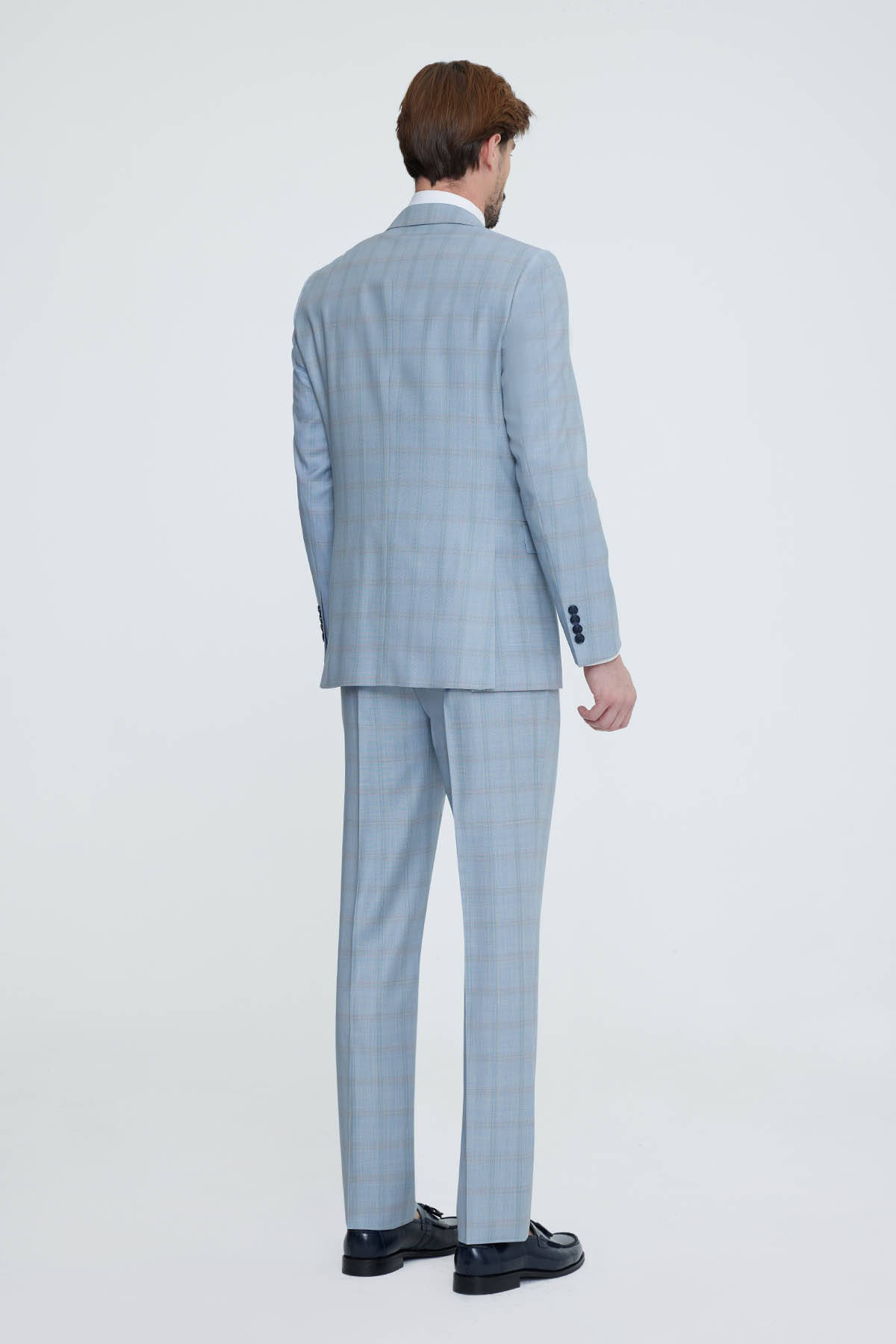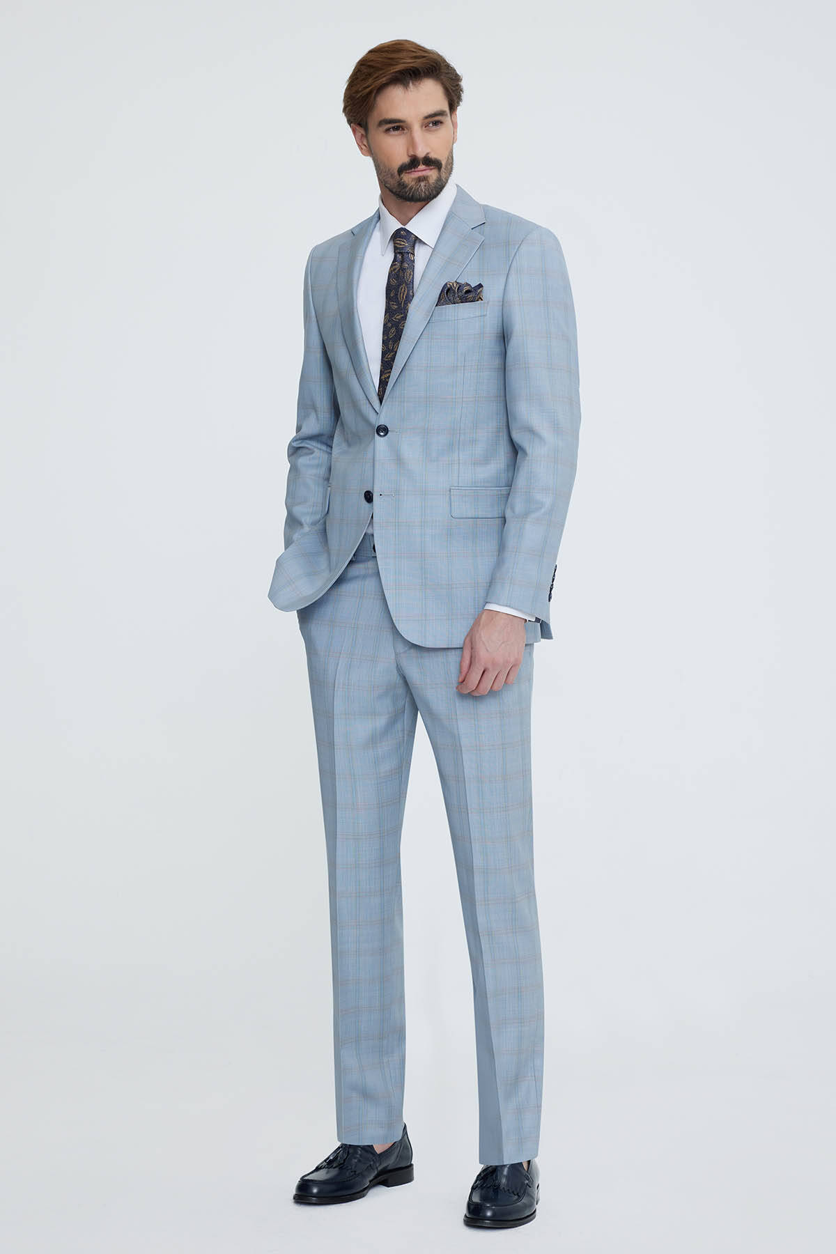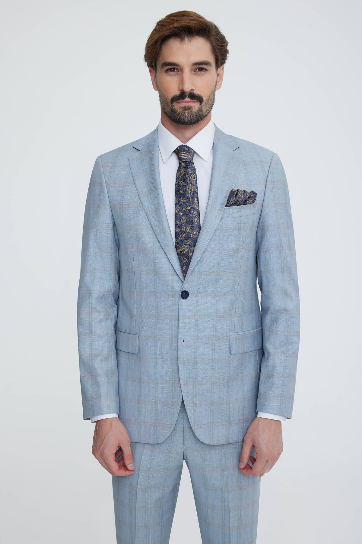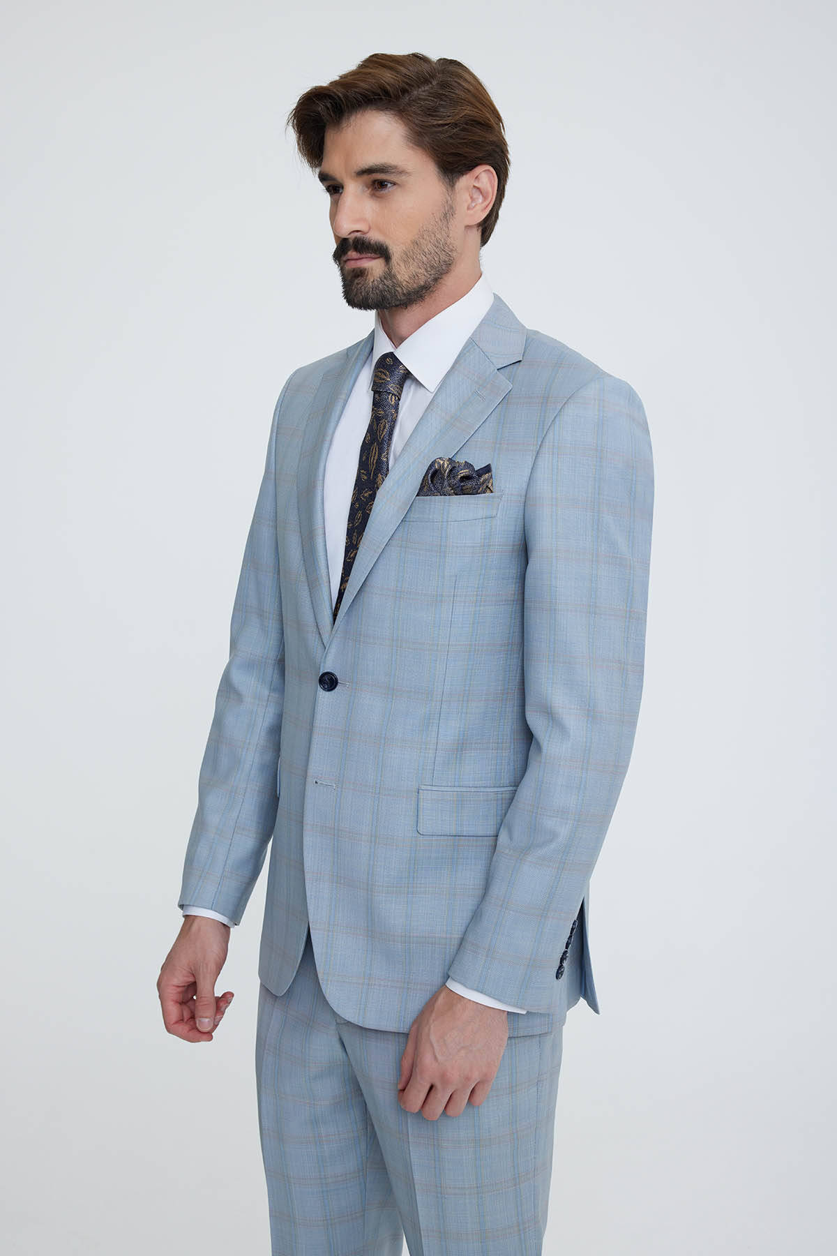 Erkek Mavi Gri Regular Fit Kareli Takım Elbise