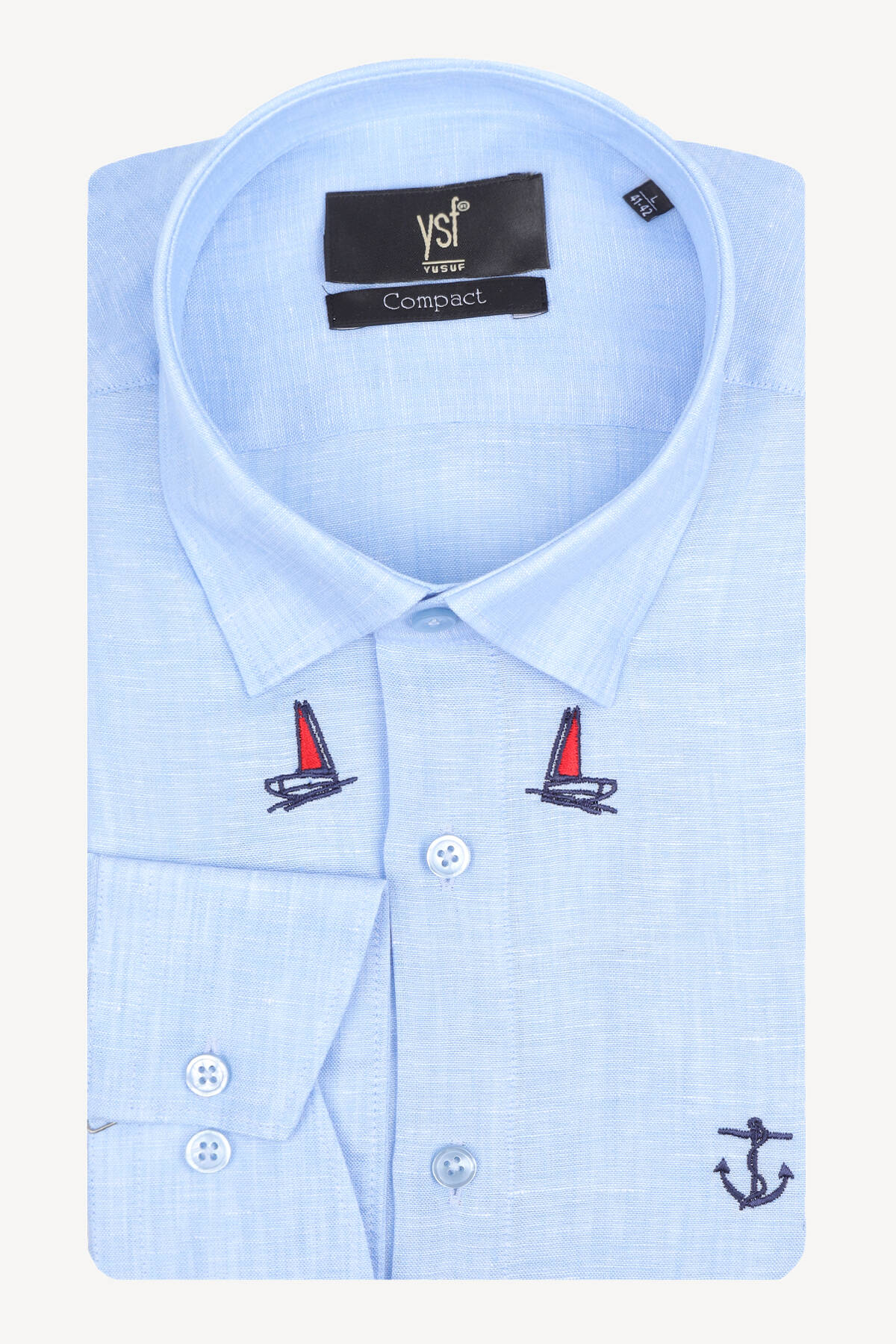 Erkek Mavi Keten Slim Fit Desenli Gömlek