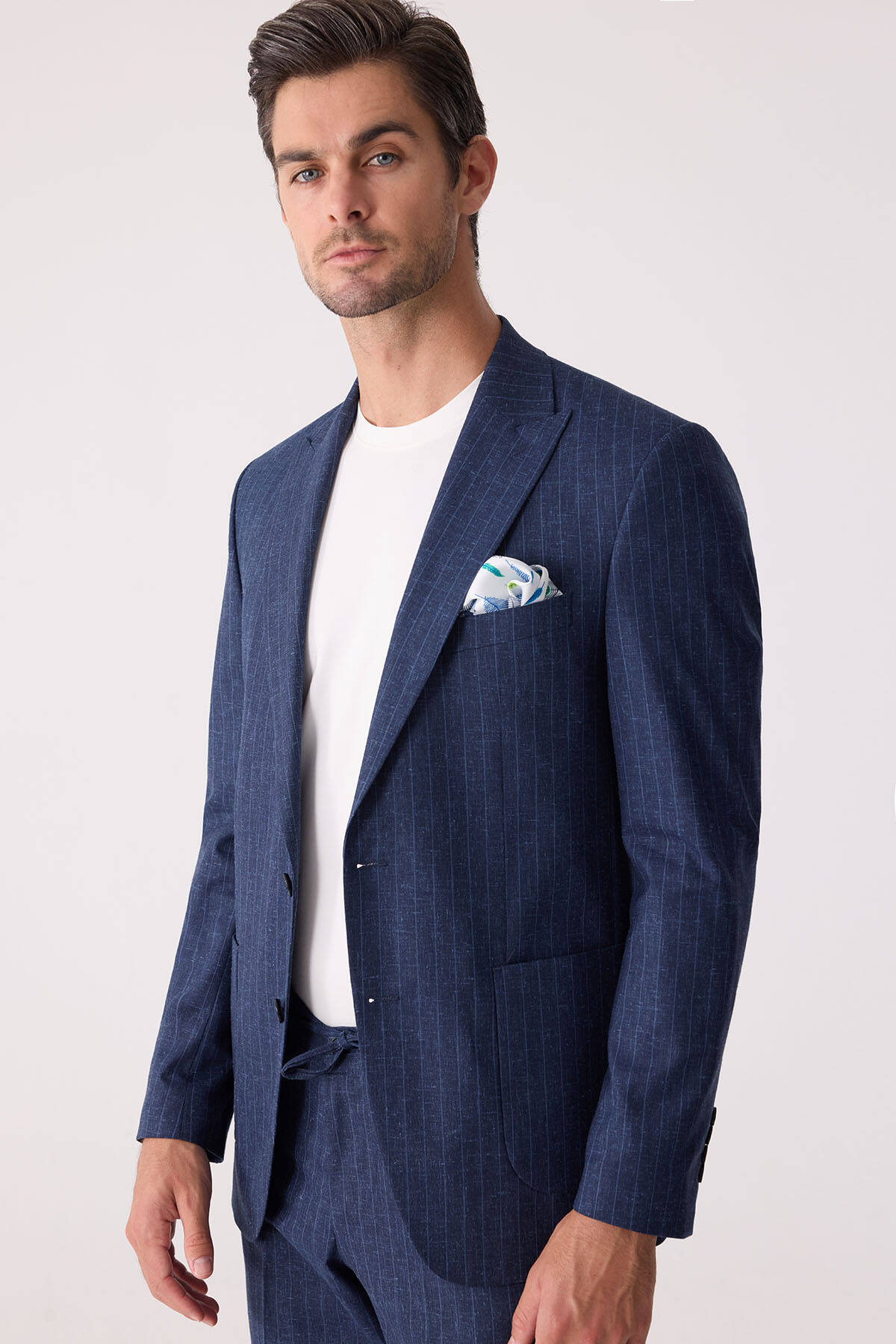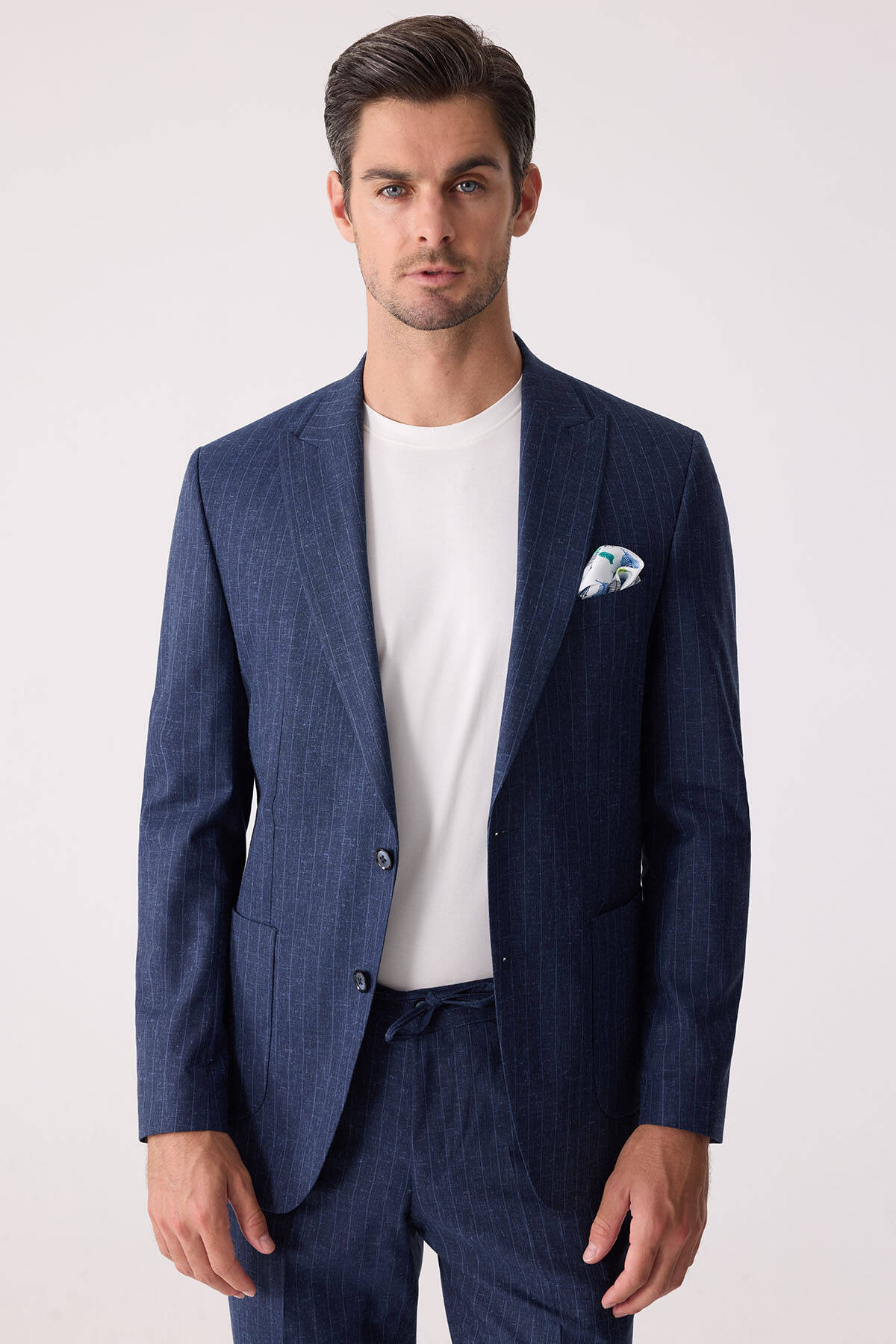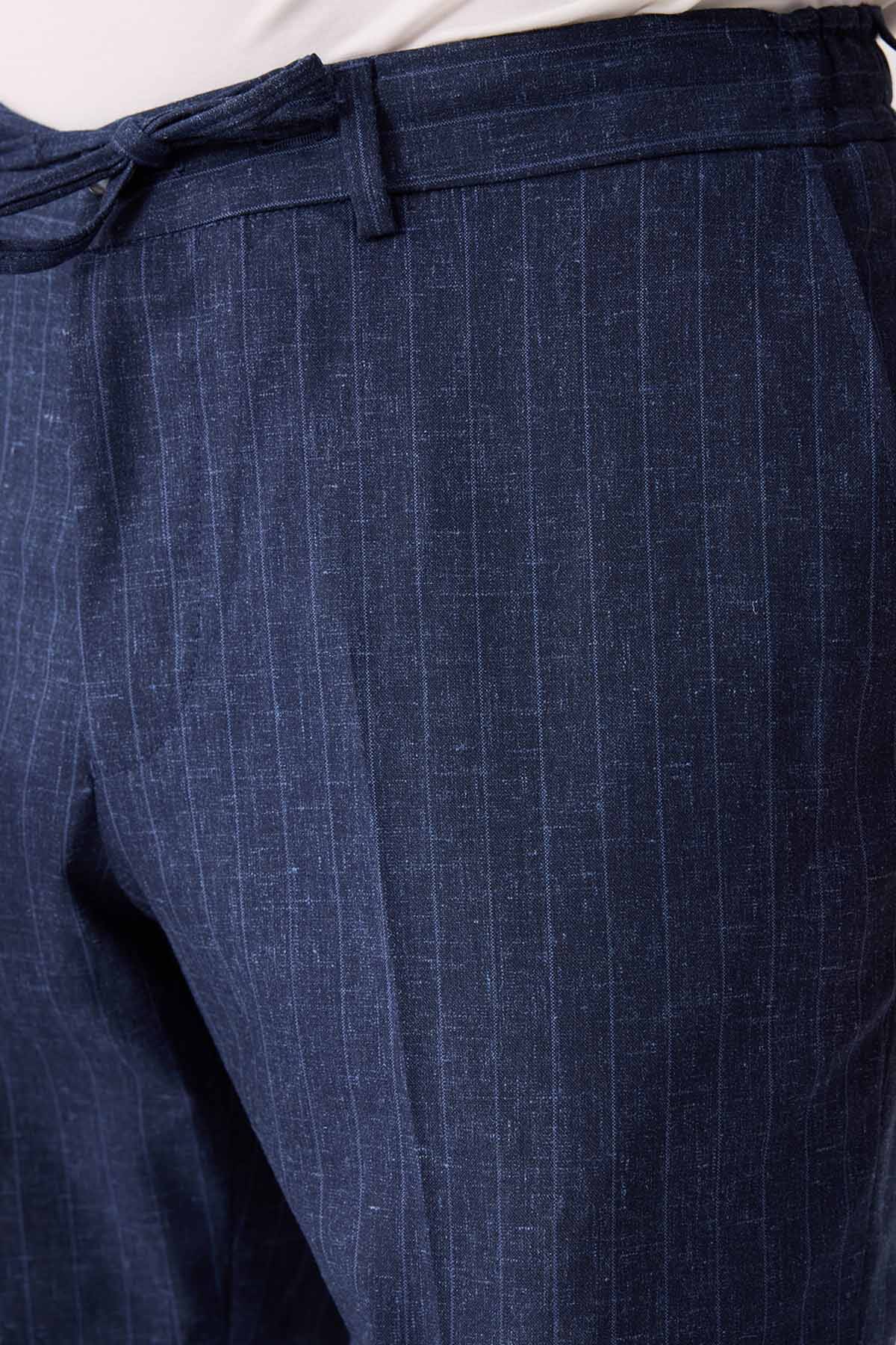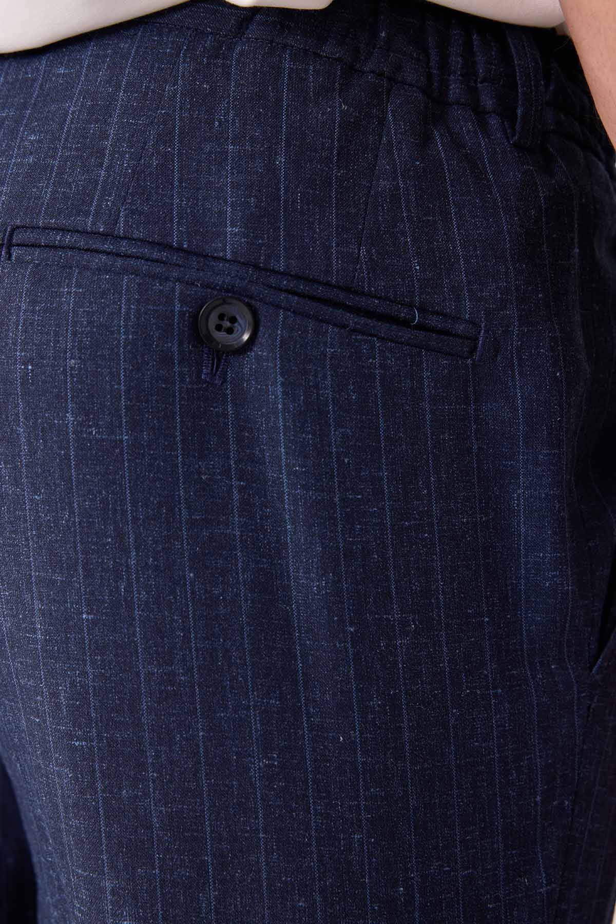 Erkek Mavi Slim Fit Çizgili Torba Cep Jogger Pantolonlu Sivri Yaka Takım Elbise