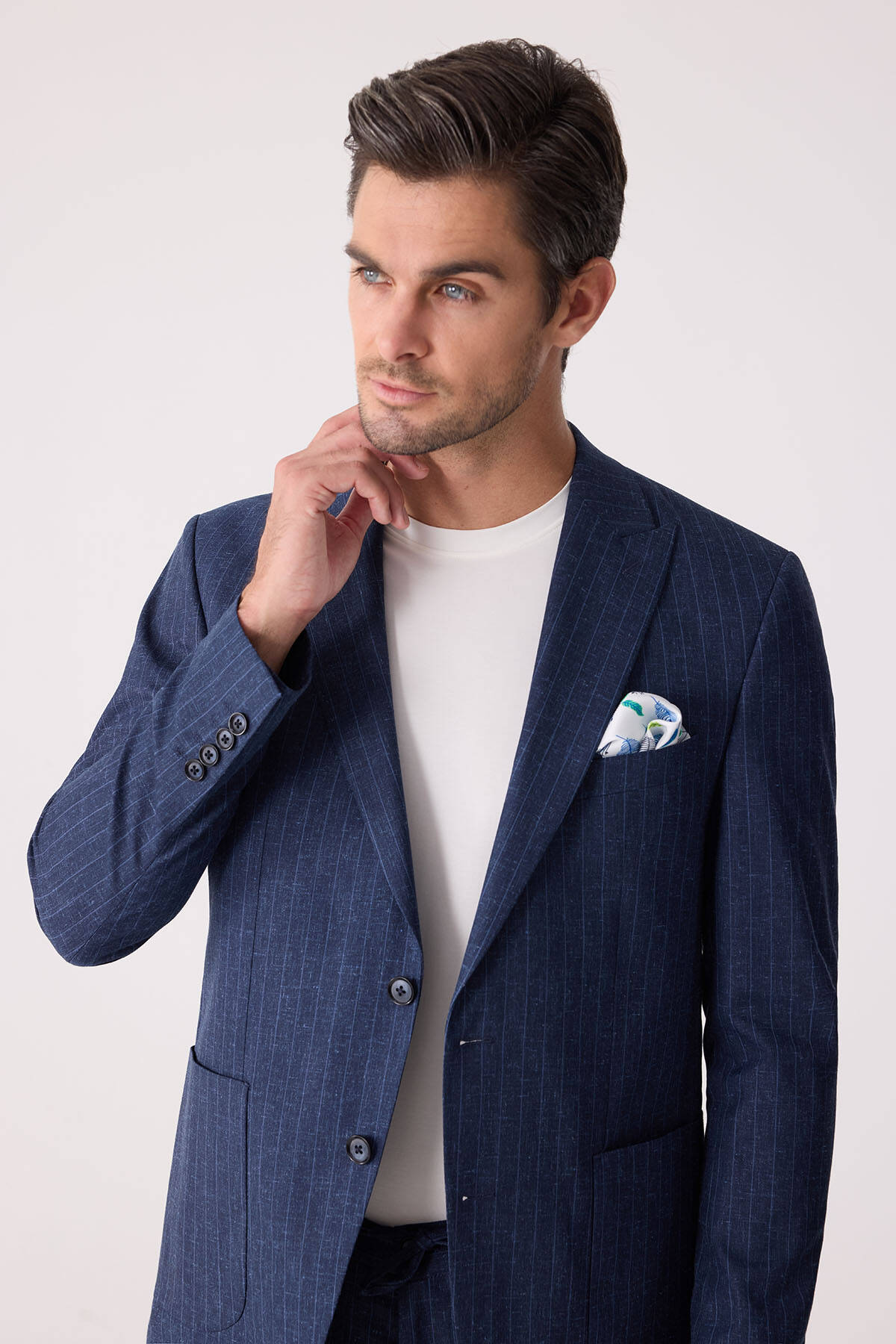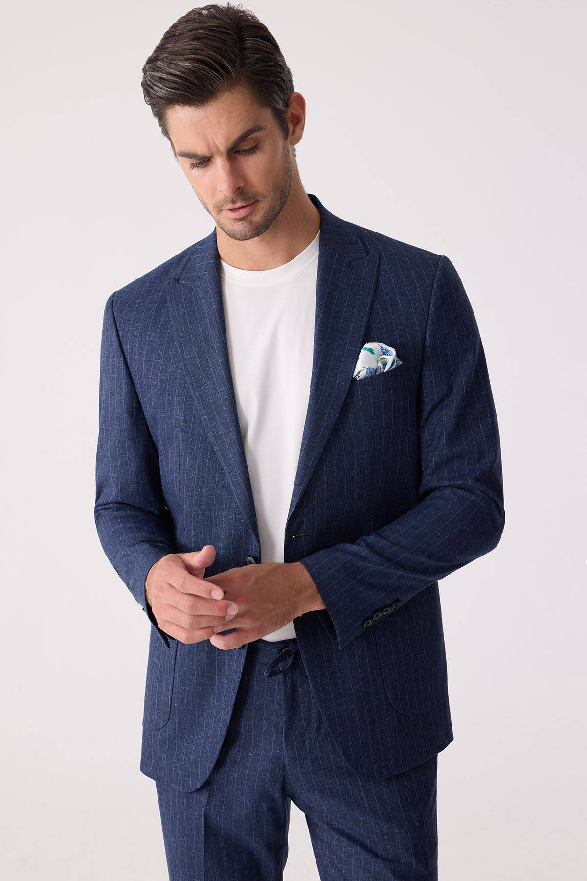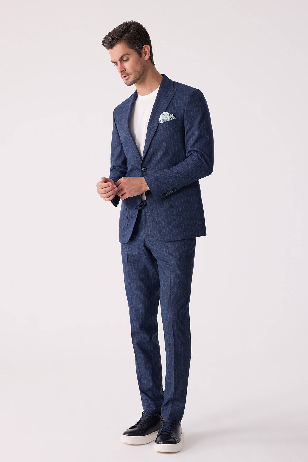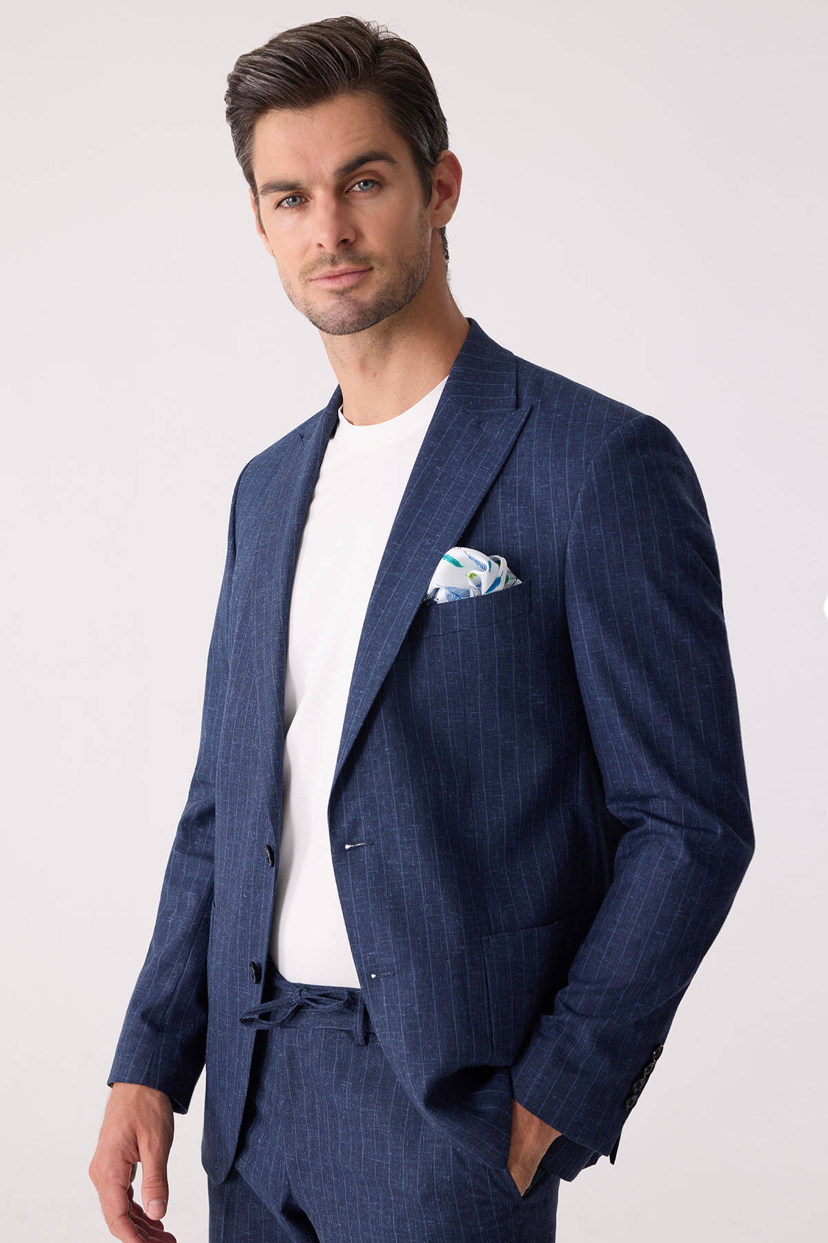 Erkek Mavi Slim Fit Çizgili Torba Cep Jogger Pantolonlu Sivri Yaka Takım Elbise