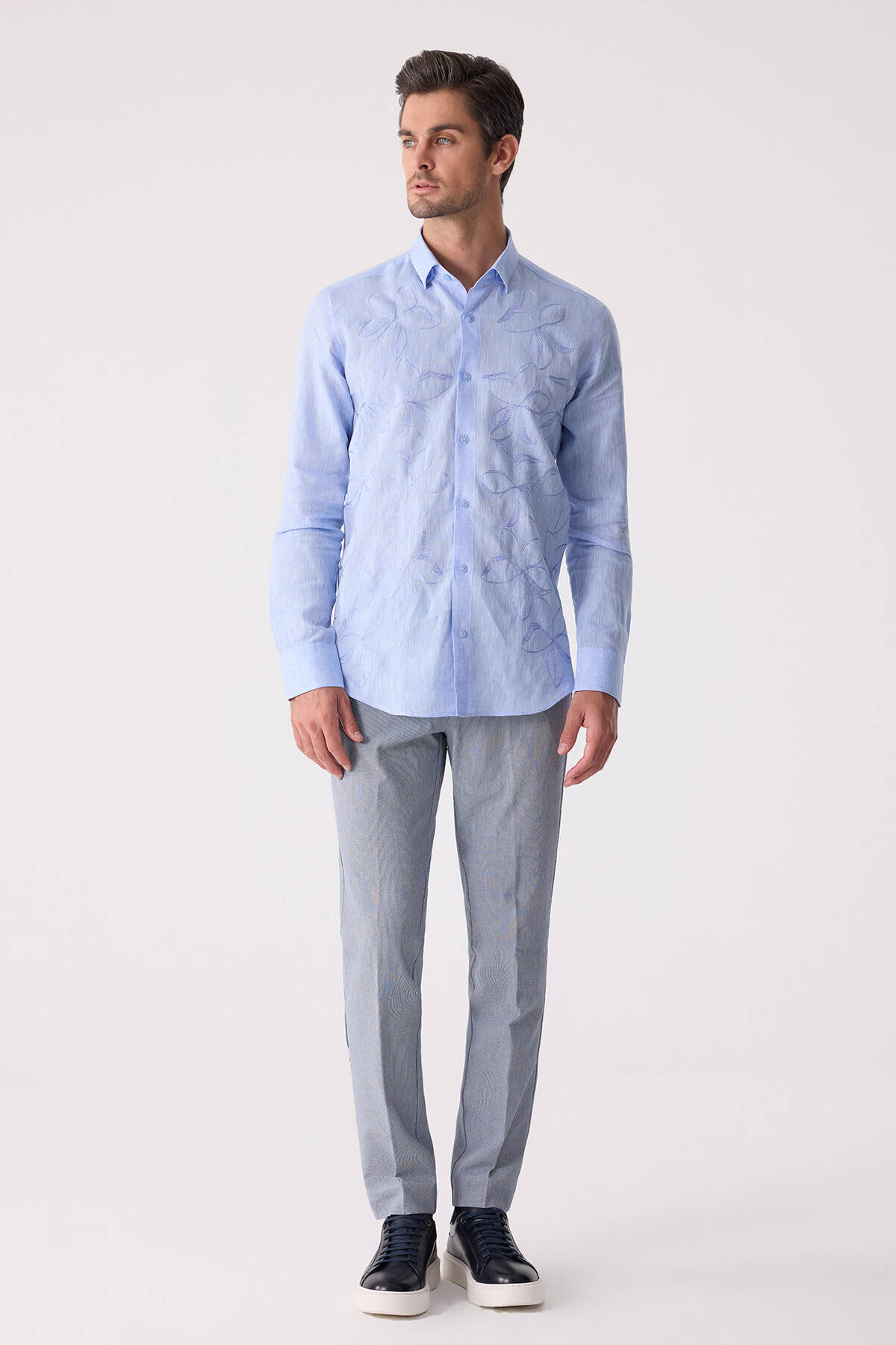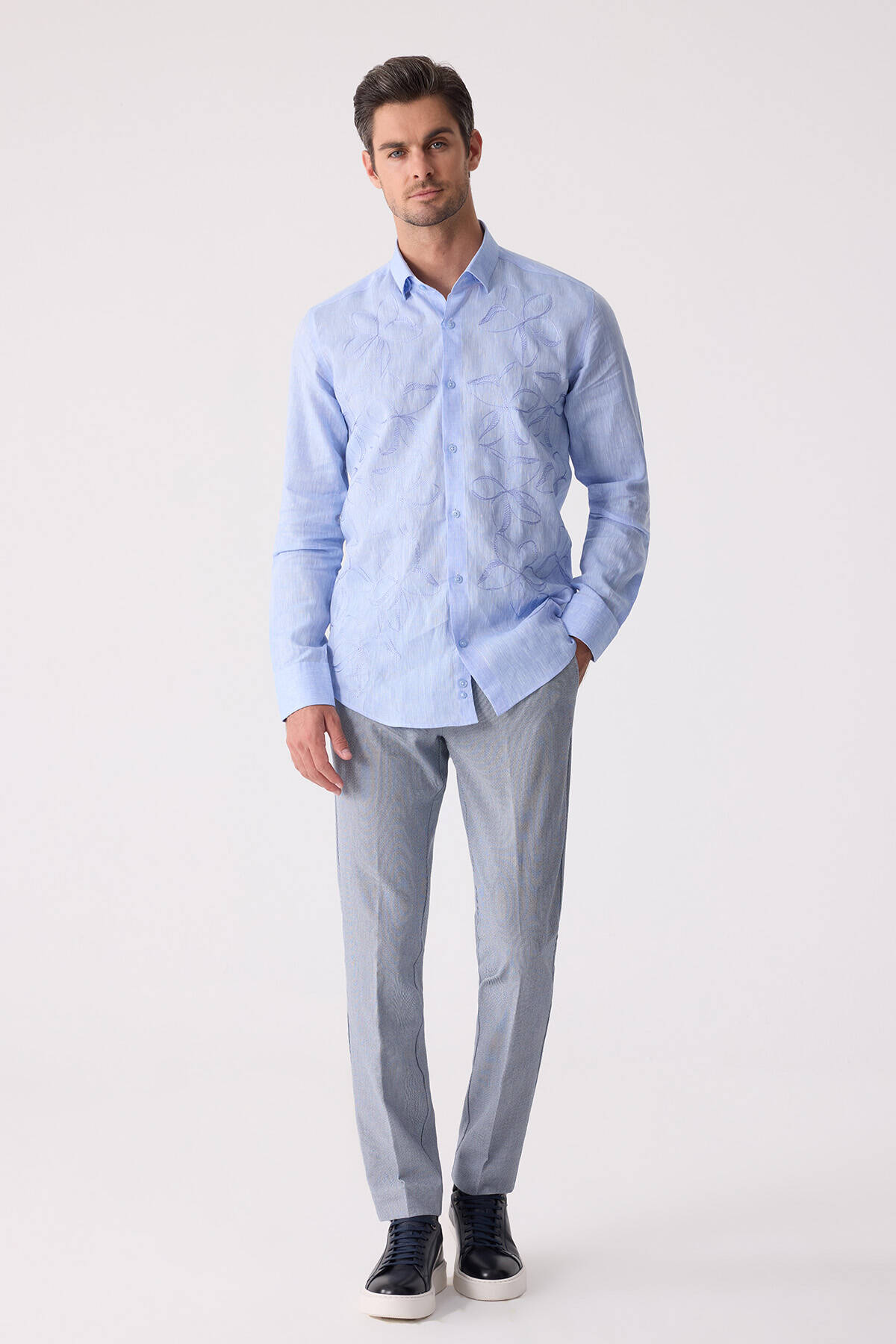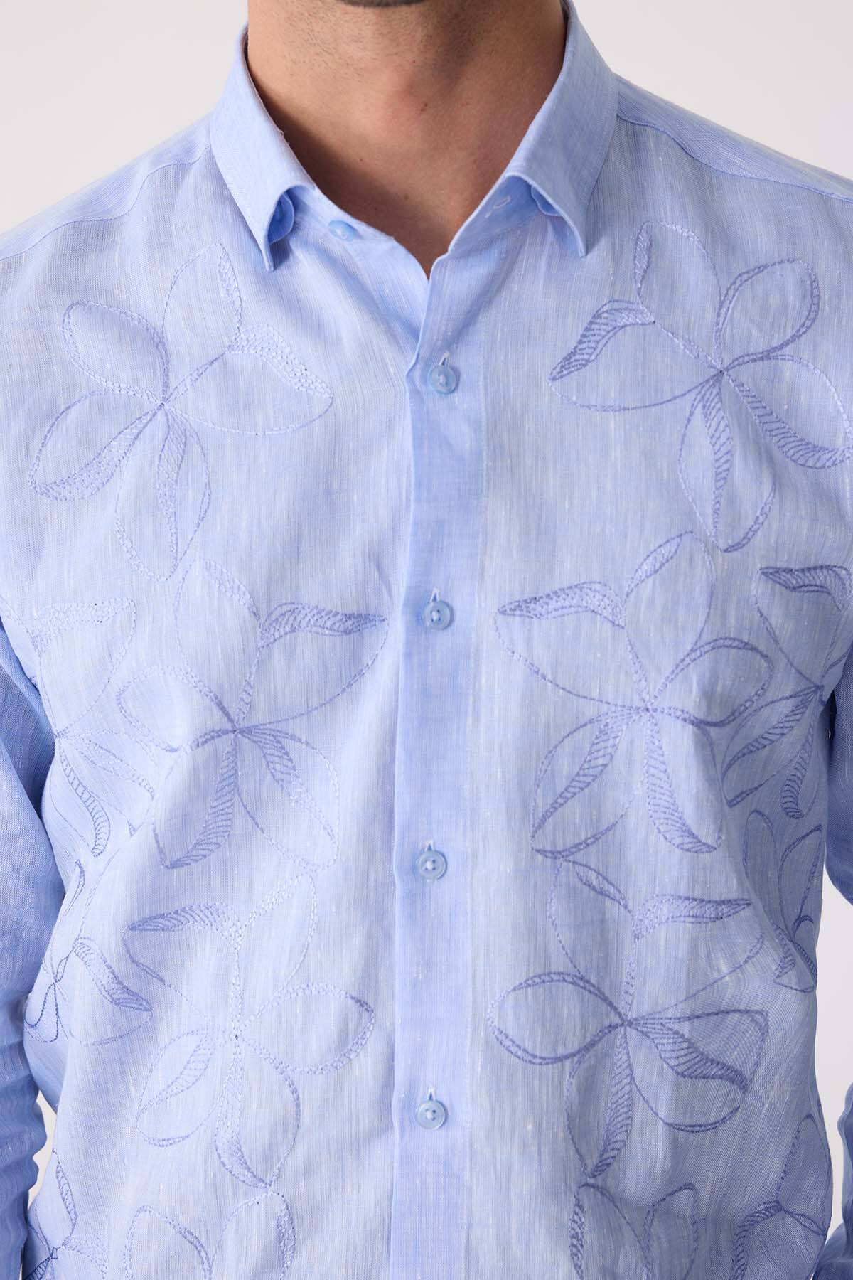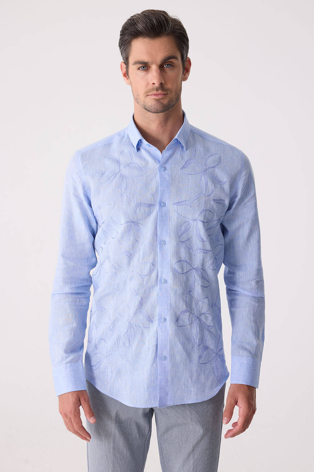 Erkek Mavi Slim Fit Gizli Yaka Düğmeli Keten Gömlek