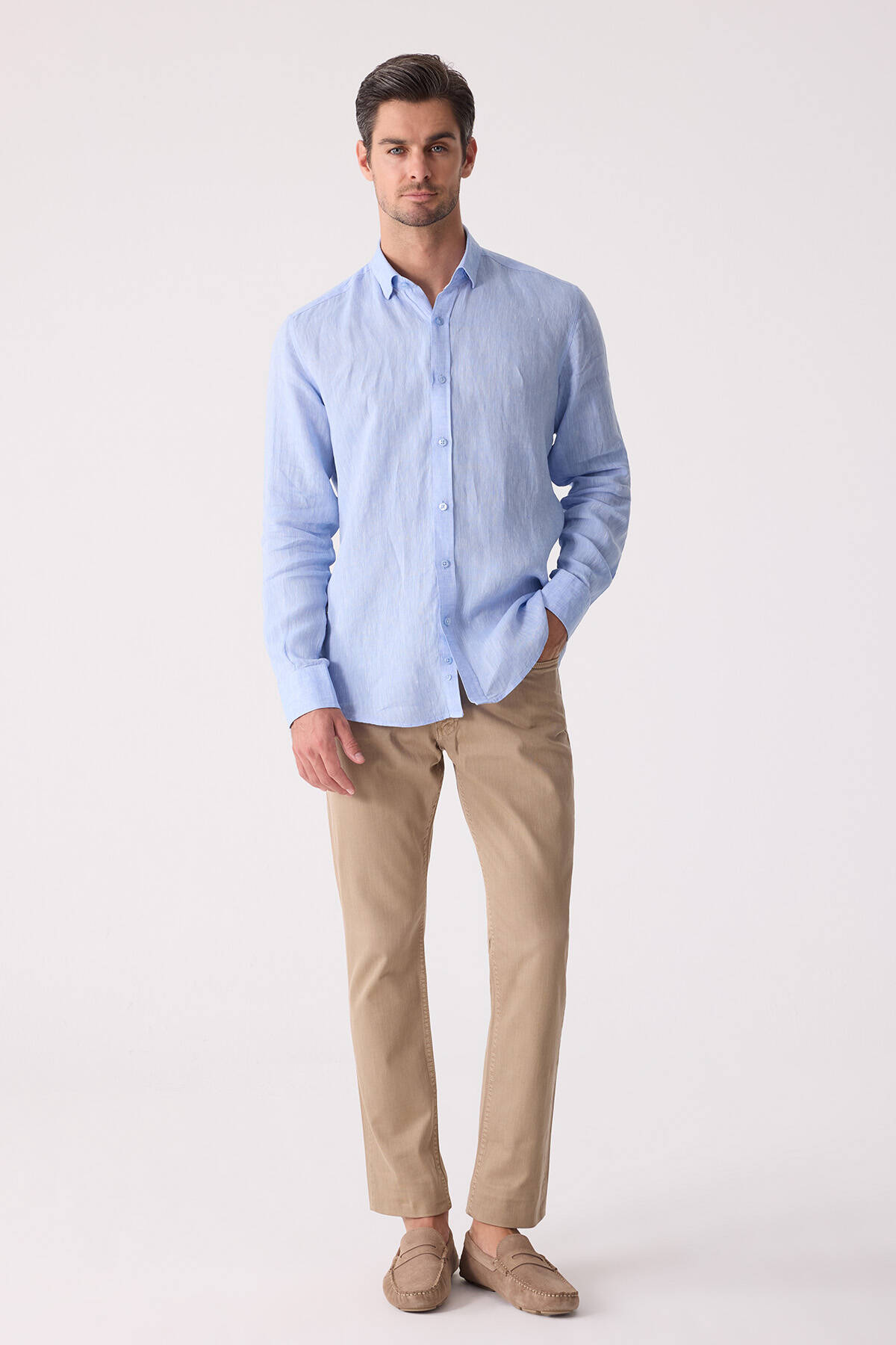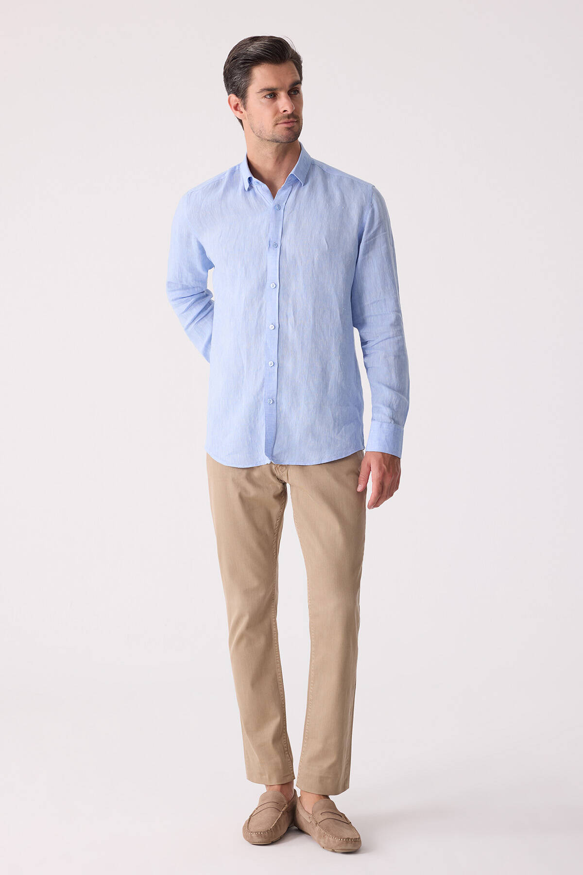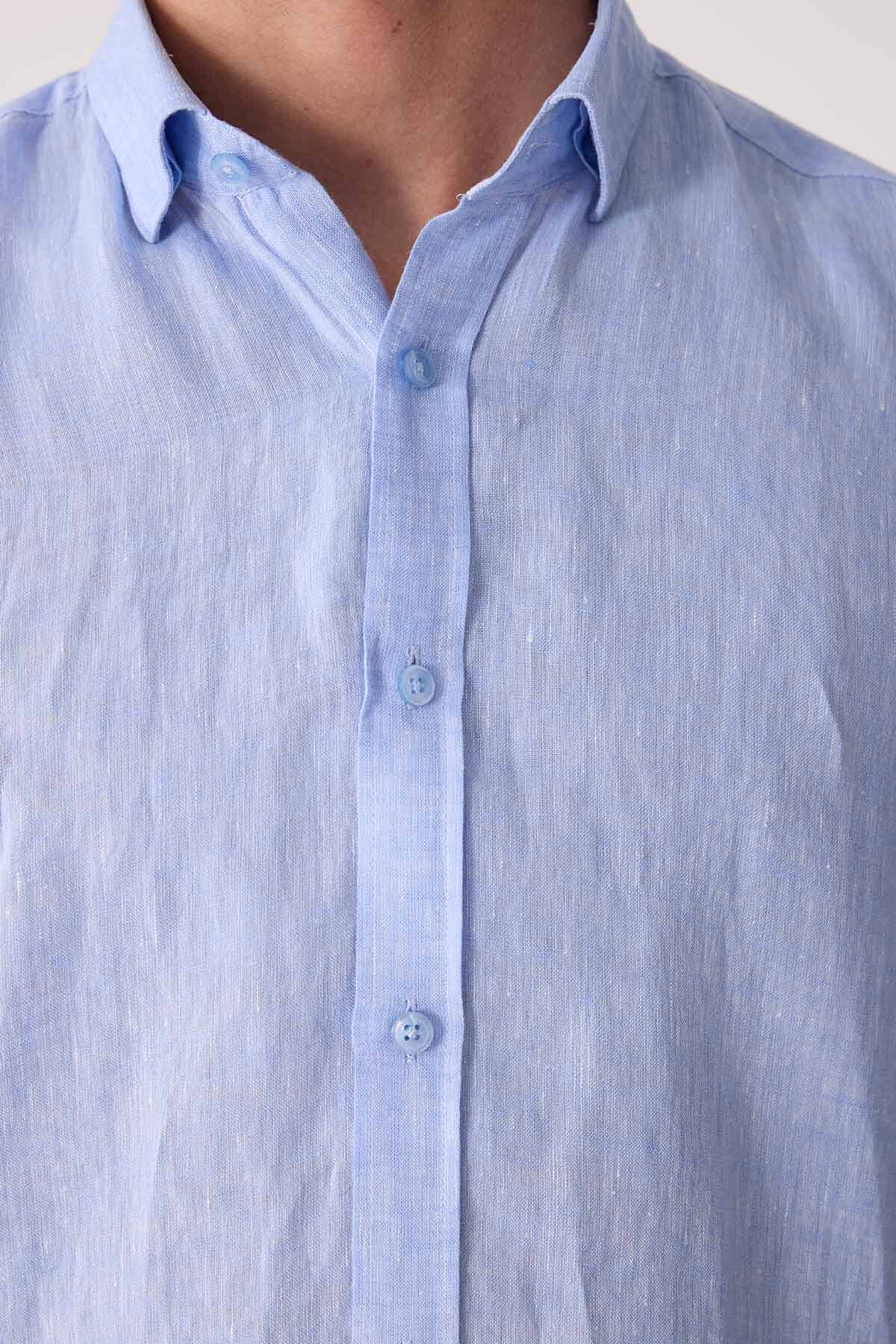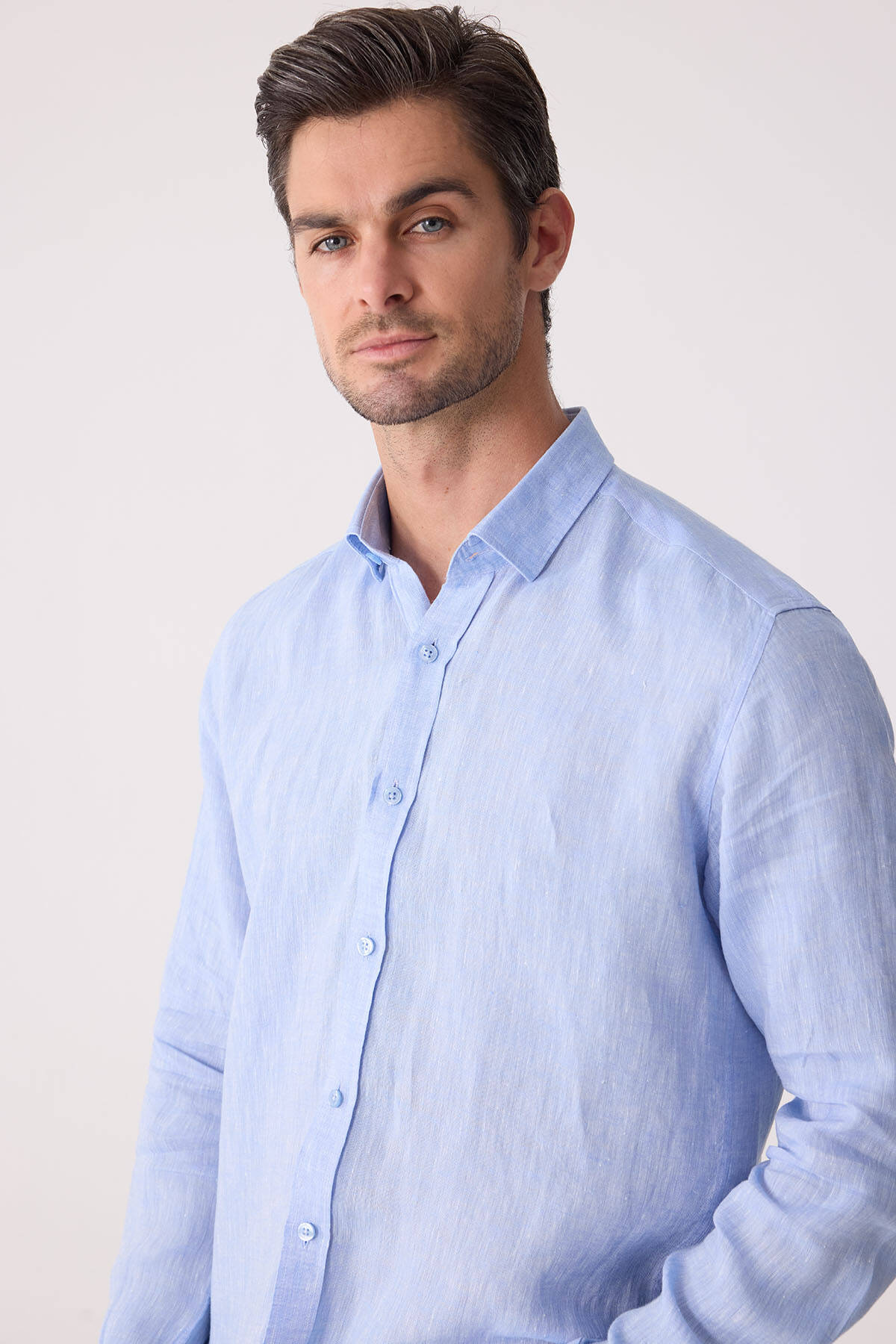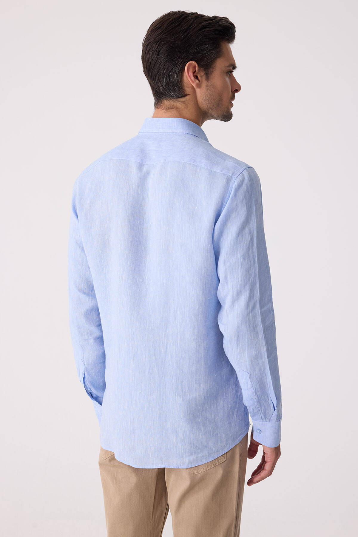 Erkek Mavi Slim Fit Klasik Yaka Keten Gömlek