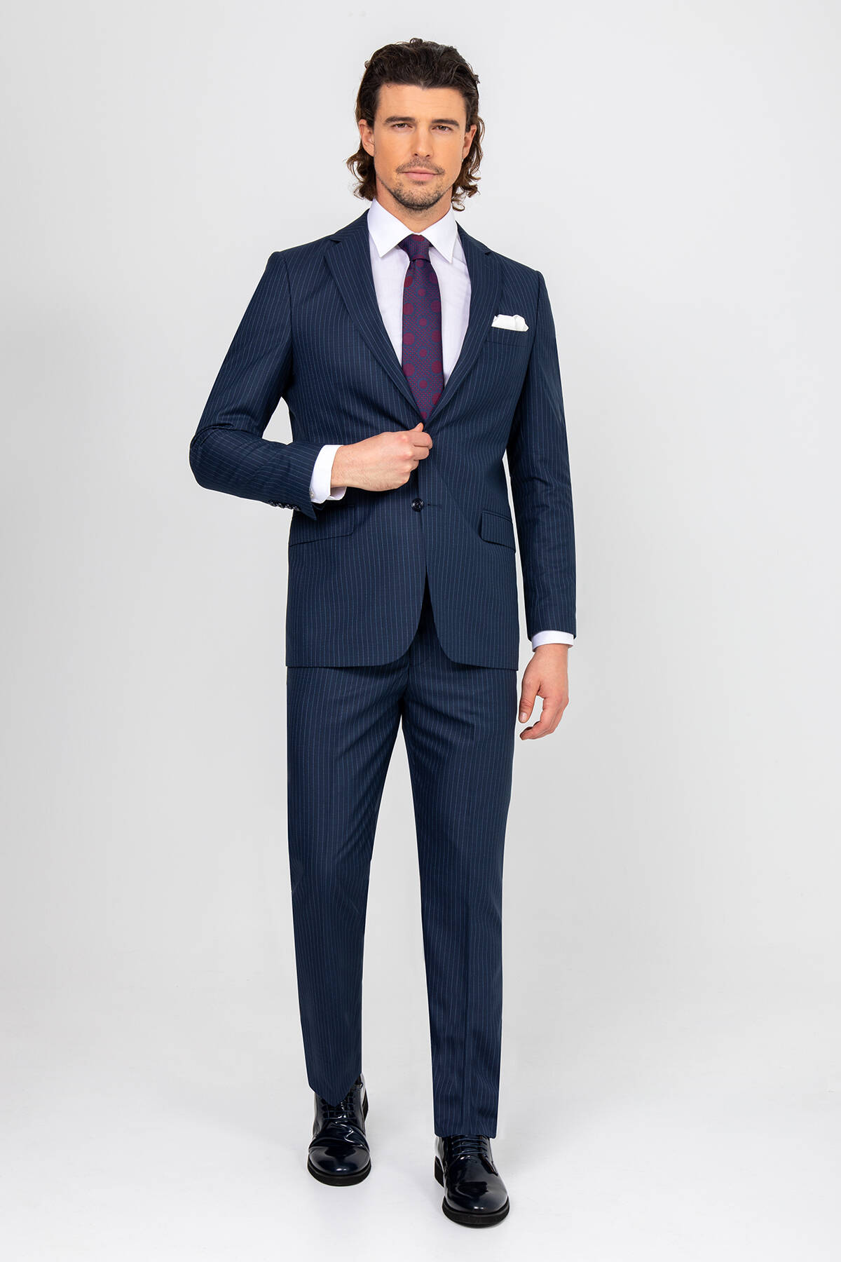 Erkek Petrol Çizgili Regular Fit Takım Elbise