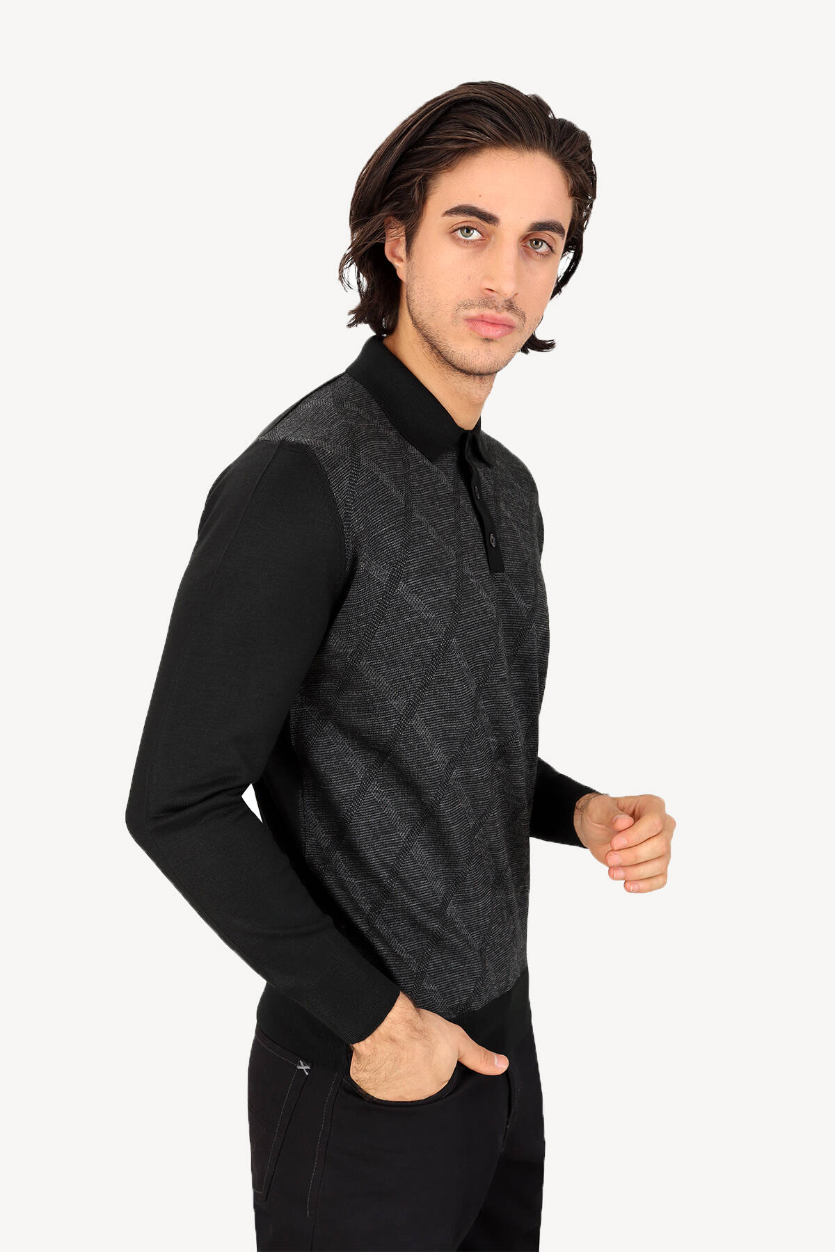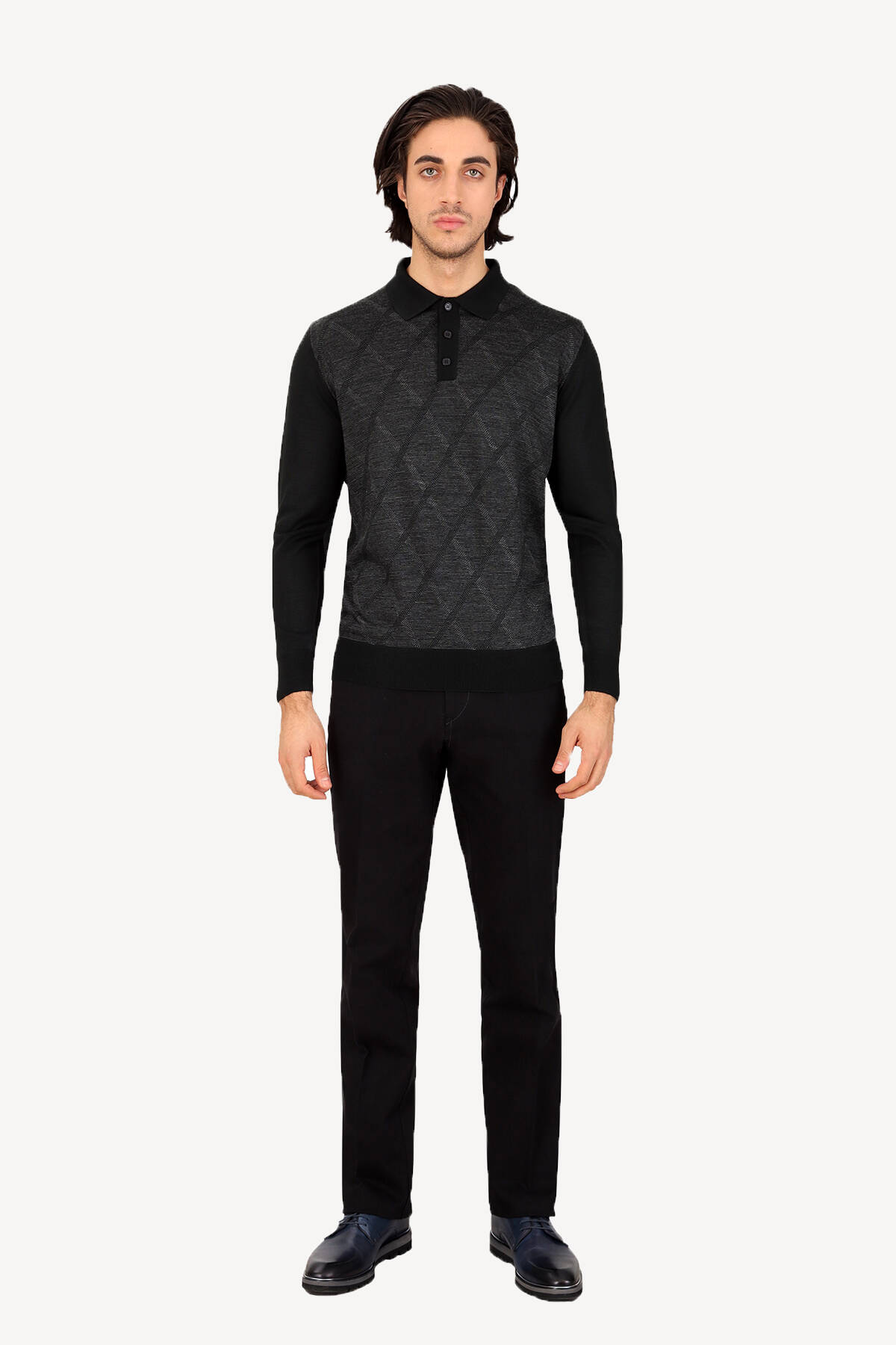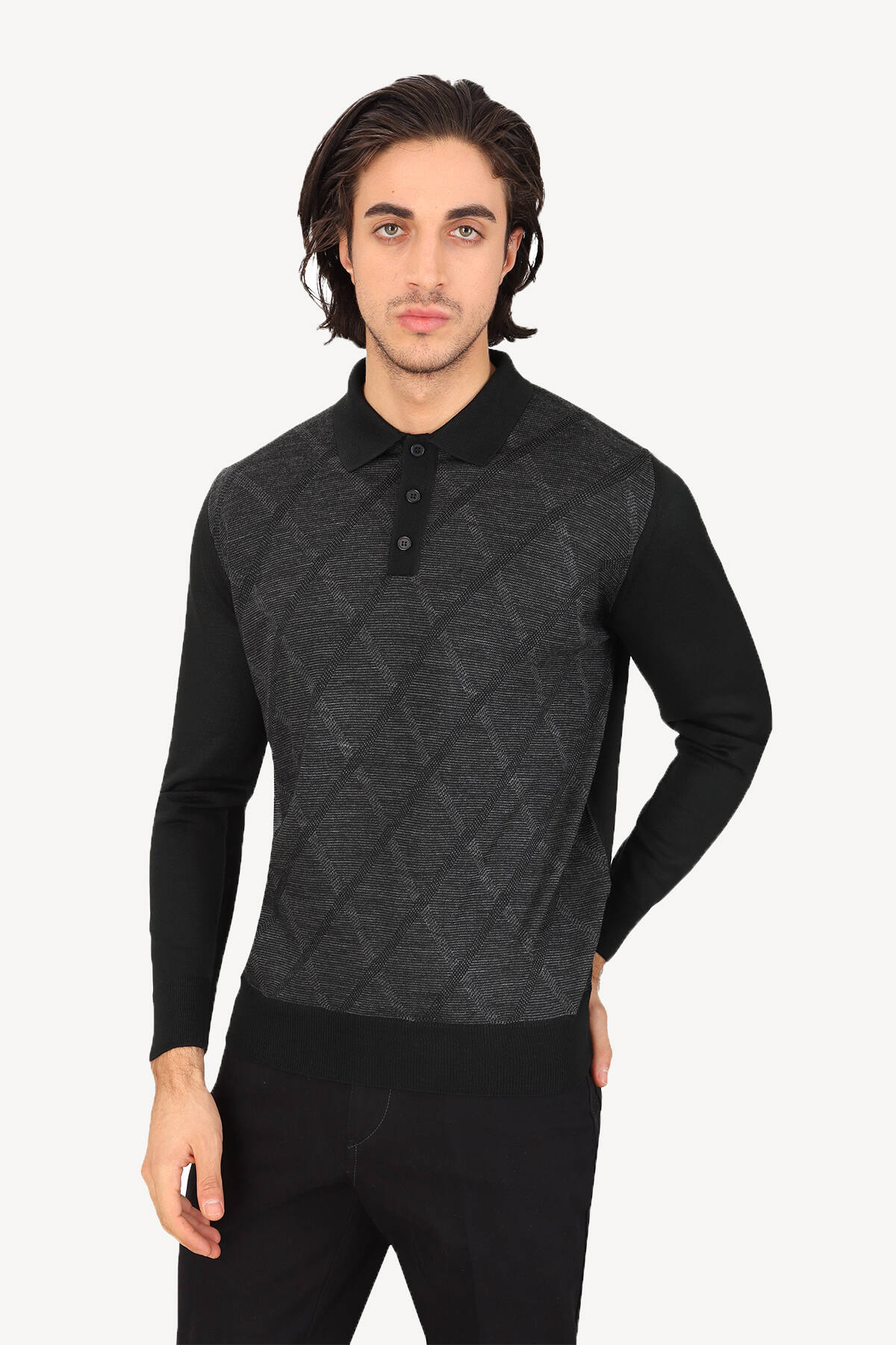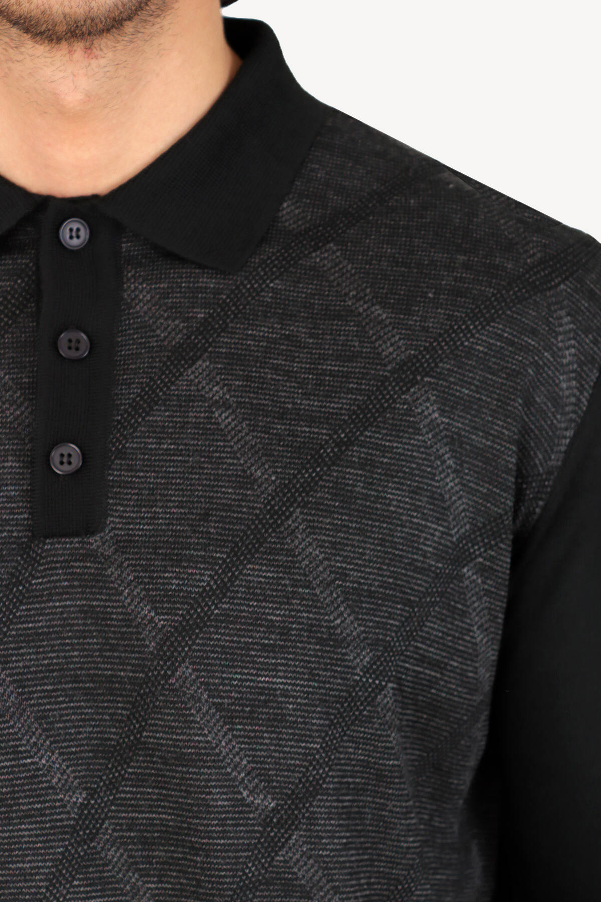 Erkek Siyah Gri Klasik Polo Yaka Çizgi Desenli Triko