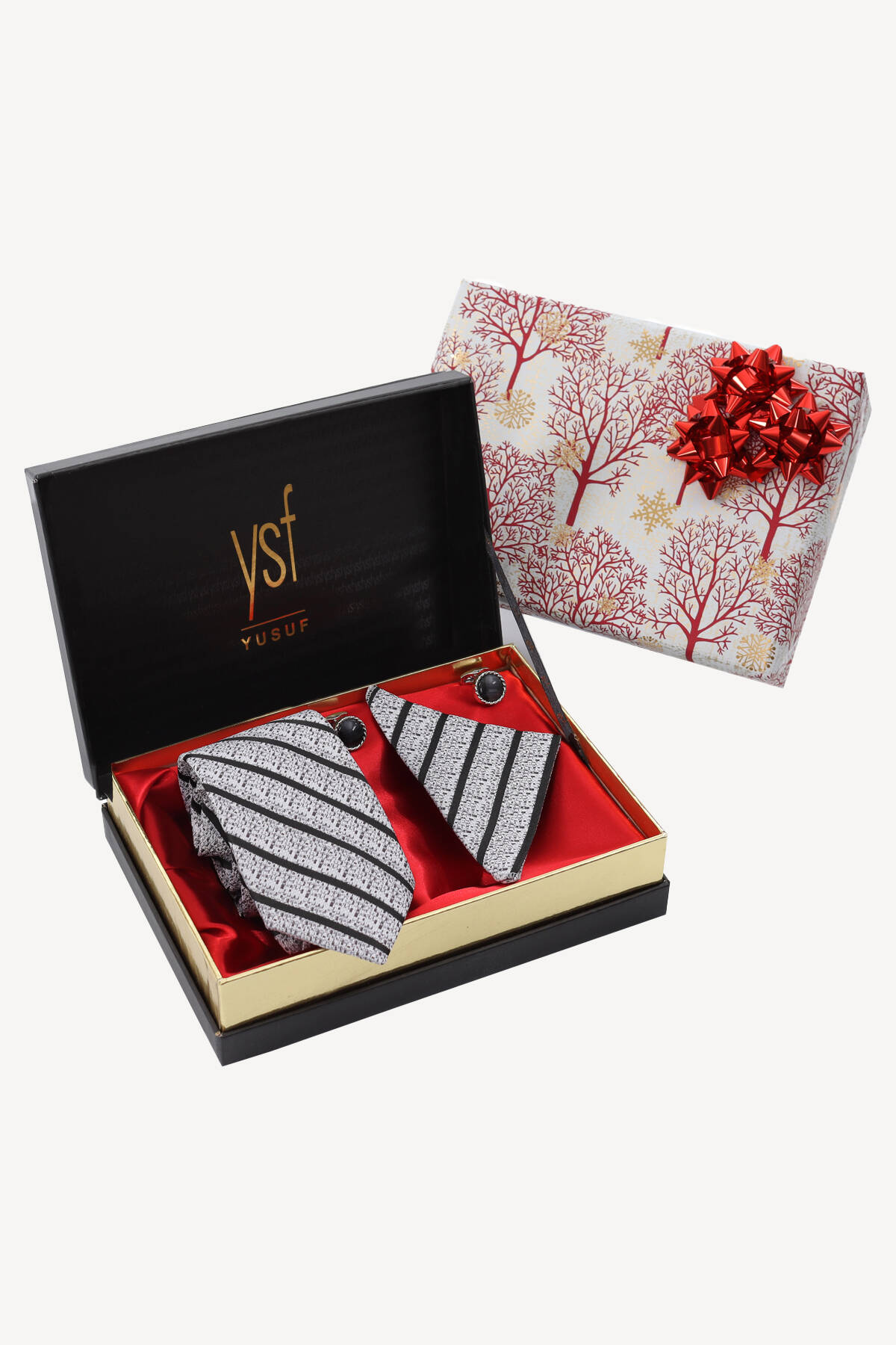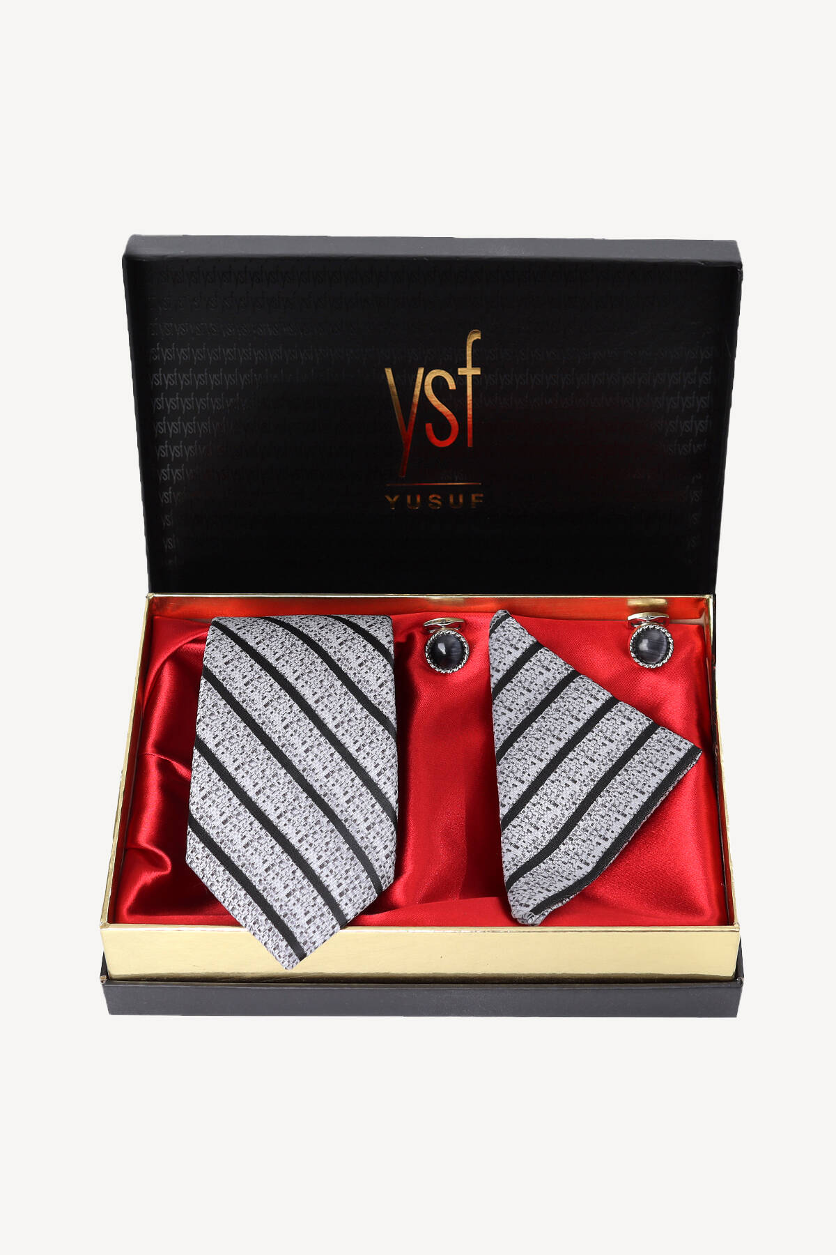 Erkek Siyah Gri Kravat Mendil Kol Düğmesi Set