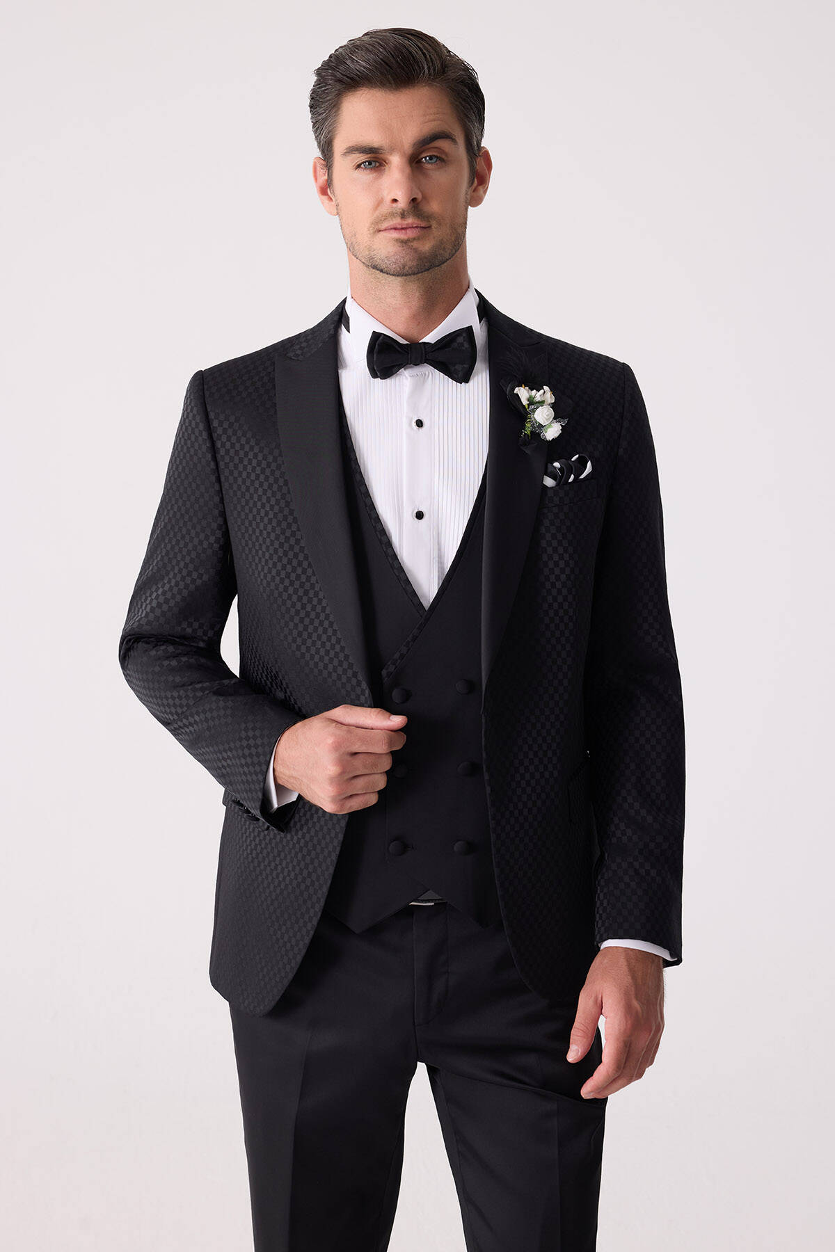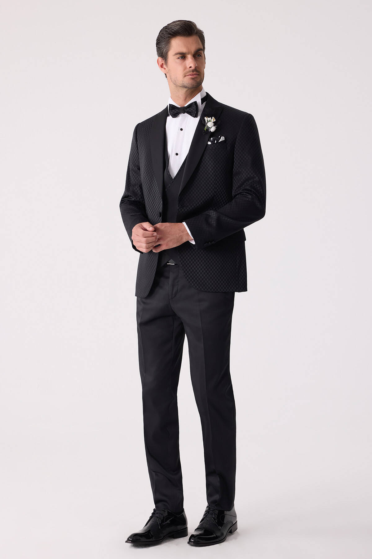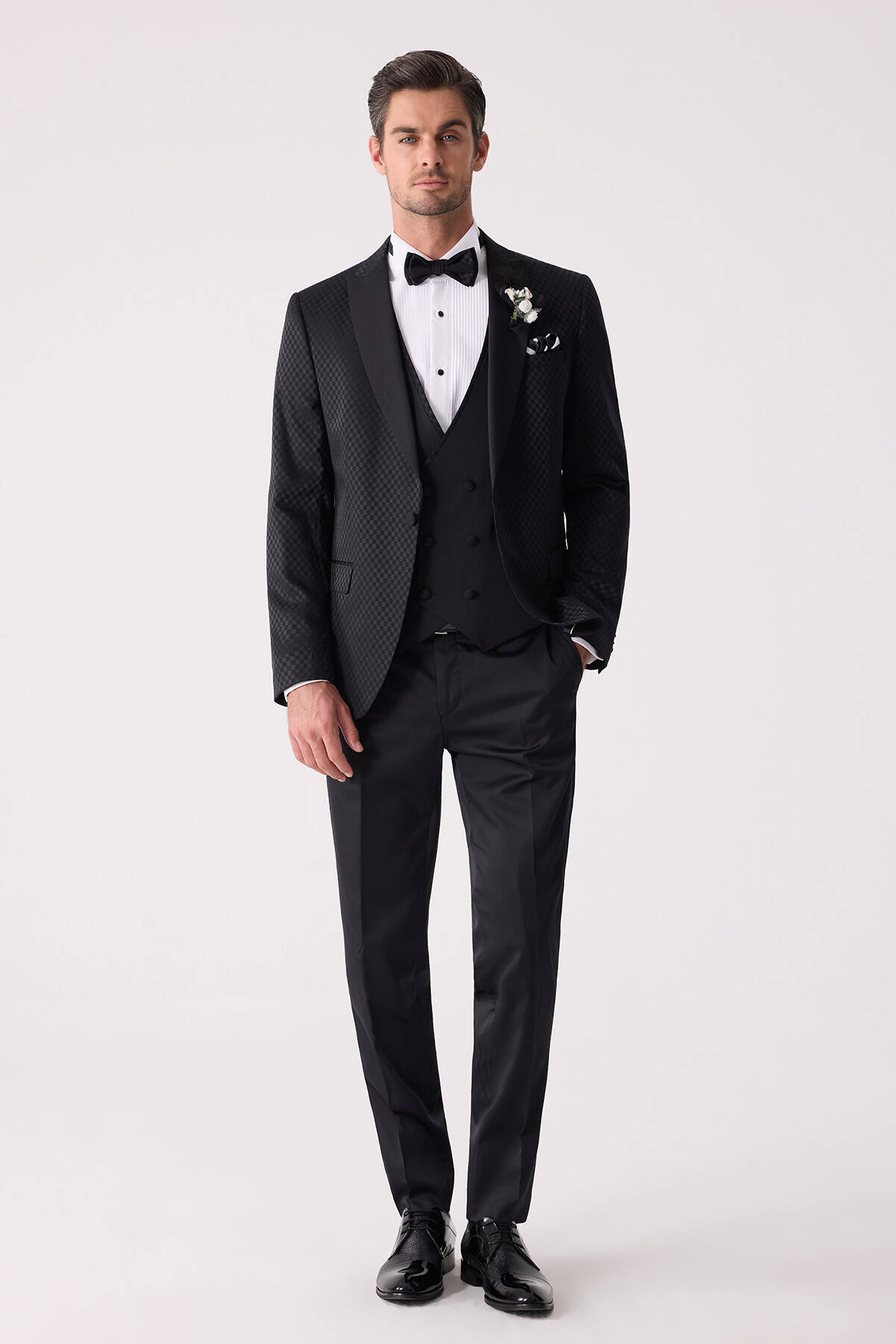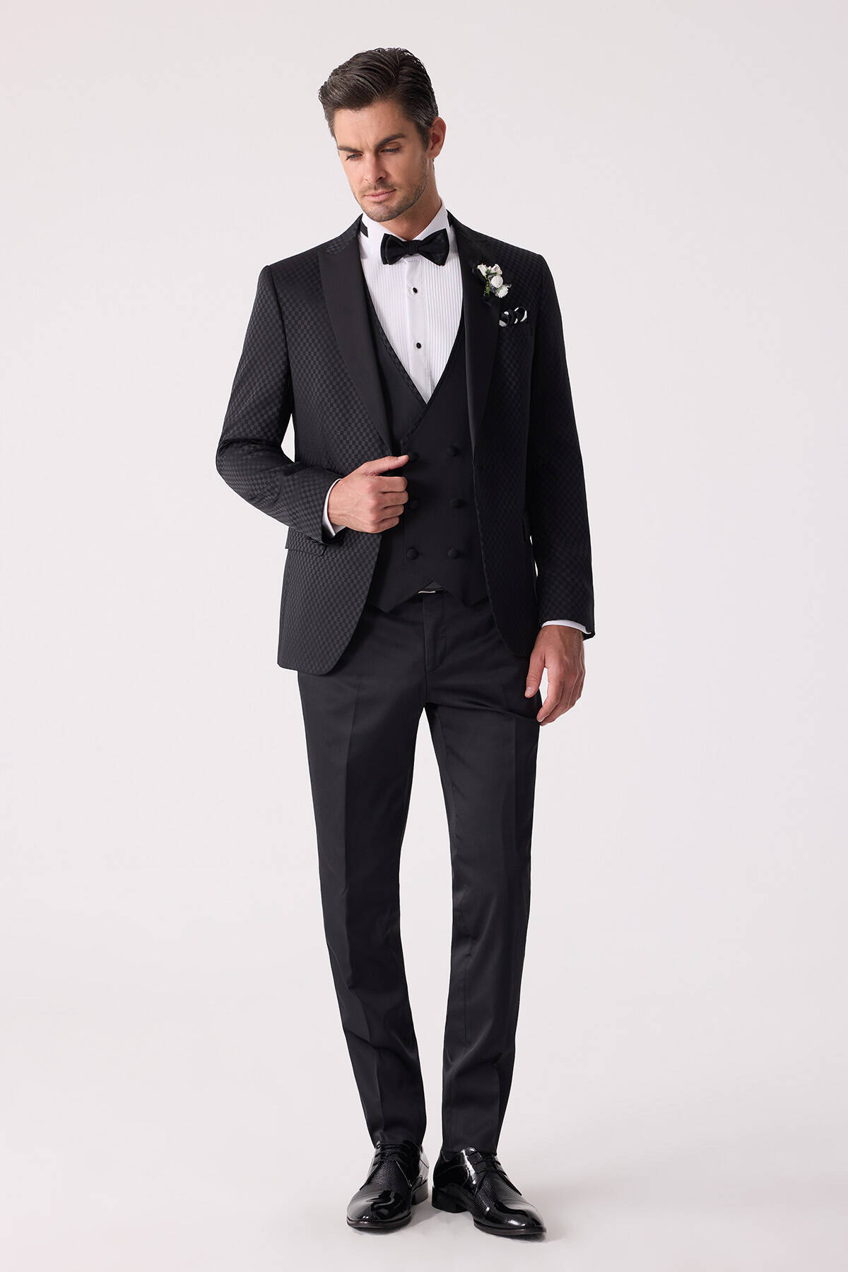 Siyah üzerine micro desenli olarak tasarlanan yelekli damatlık, klasik forma dinamik bir yorum kazandırarak metropol beyefendilerine karizmatik bir tarz sunar. Resmî parçalarla şıklığı zirveye taşımayı arzu ediyorsanız, bu özel yelekli smokini monokrom bir tarzda kombinleyebilirsiniz. Slim fit beyaz gömlek, rugan Oxford ayakkabı ve deri kemer gibi kontrast yaratacak parçalarla siyah damatlığın şıklığını öne çıkarabilirsiniz. Düğün veya nişan gibi özel anlar için yaka çiçeği ve zinciri tarzında şık detaylarla smokin kombinini yükseltebilirsiniz. YSF Giyim, İtalyan işçiliğini ve kalitesini yansıtan birbirinden şık siyah damatlık modelleri sunar. Siz de hayatınızın en mutlu anlarına şahitlik ederken stilinizle de adınızdan söz ettirmek için YSF Giyim damatlık modellerini en özel fiyatlarla satın alabilirsiniz.