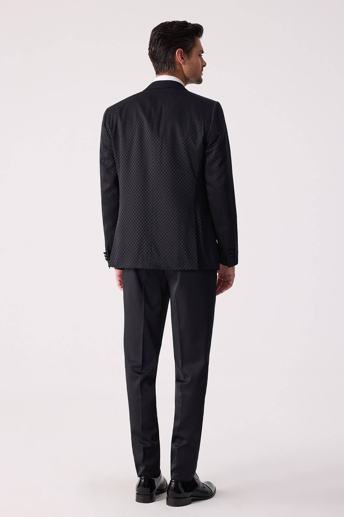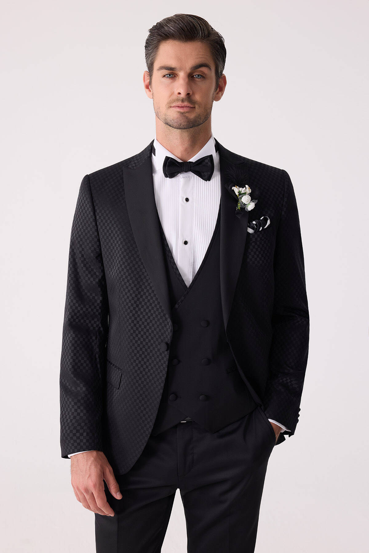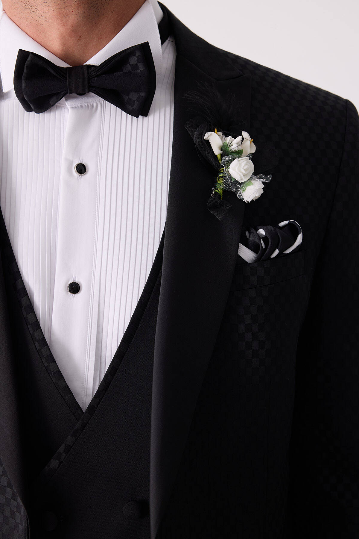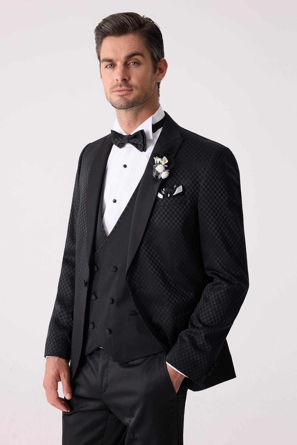 Siyah üzerine micro desenli olarak tasarlanan yelekli damatlık, klasik forma dinamik bir yorum kazandırarak metropol beyefendilerine karizmatik bir tarz sunar. Resmî parçalarla şıklığı zirveye taşımayı arzu ediyorsanız, bu özel yelekli smokini monokrom bir tarzda kombinleyebilirsiniz. Slim fit beyaz gömlek, rugan Oxford ayakkabı ve deri kemer gibi kontrast yaratacak parçalarla siyah damatlığın şıklığını öne çıkarabilirsiniz. Düğün veya nişan gibi özel anlar için yaka çiçeği ve zinciri tarzında şık detaylarla smokin kombinini yükseltebilirsiniz. YSF Giyim, İtalyan işçiliğini ve kalitesini yansıtan birbirinden şık siyah damatlık modelleri sunar. Siz de hayatınızın en mutlu anlarına şahitlik ederken stilinizle de adınızdan söz ettirmek için YSF Giyim damatlık modellerini en özel fiyatlarla satın alabilirsiniz.