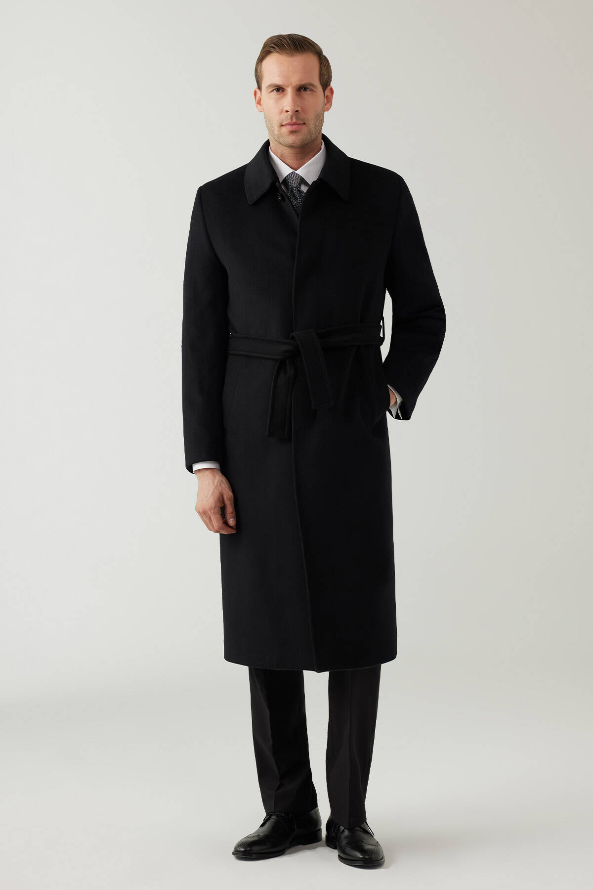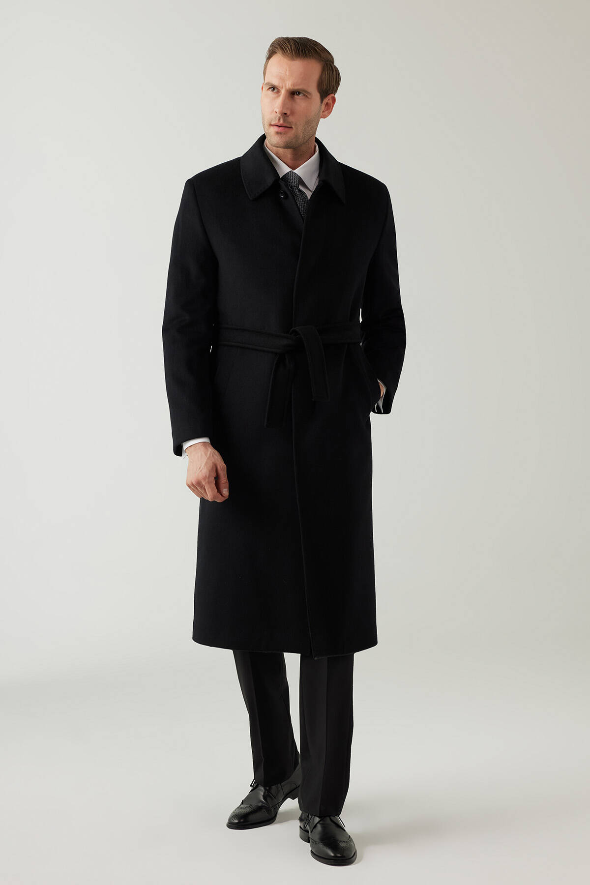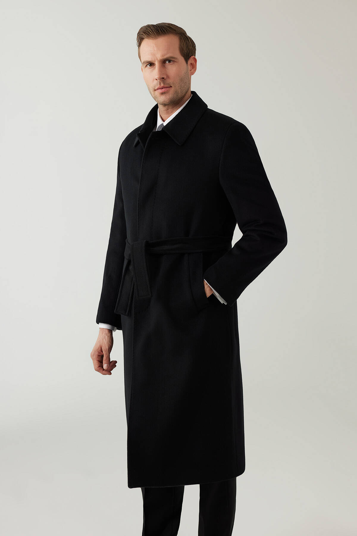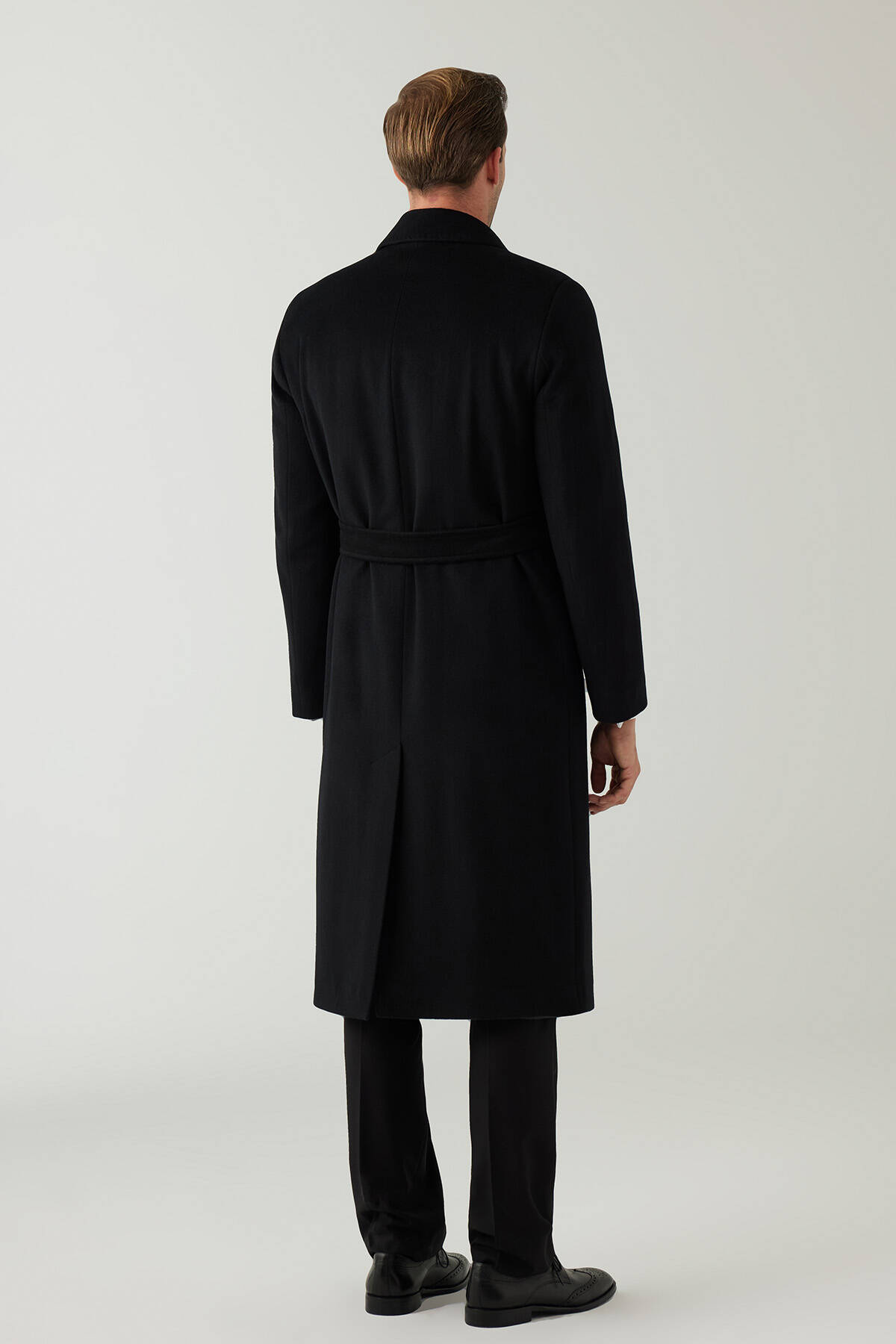 Erkek Siyah Regular Fit Kaşmir Uzun Kuşaklı Palto