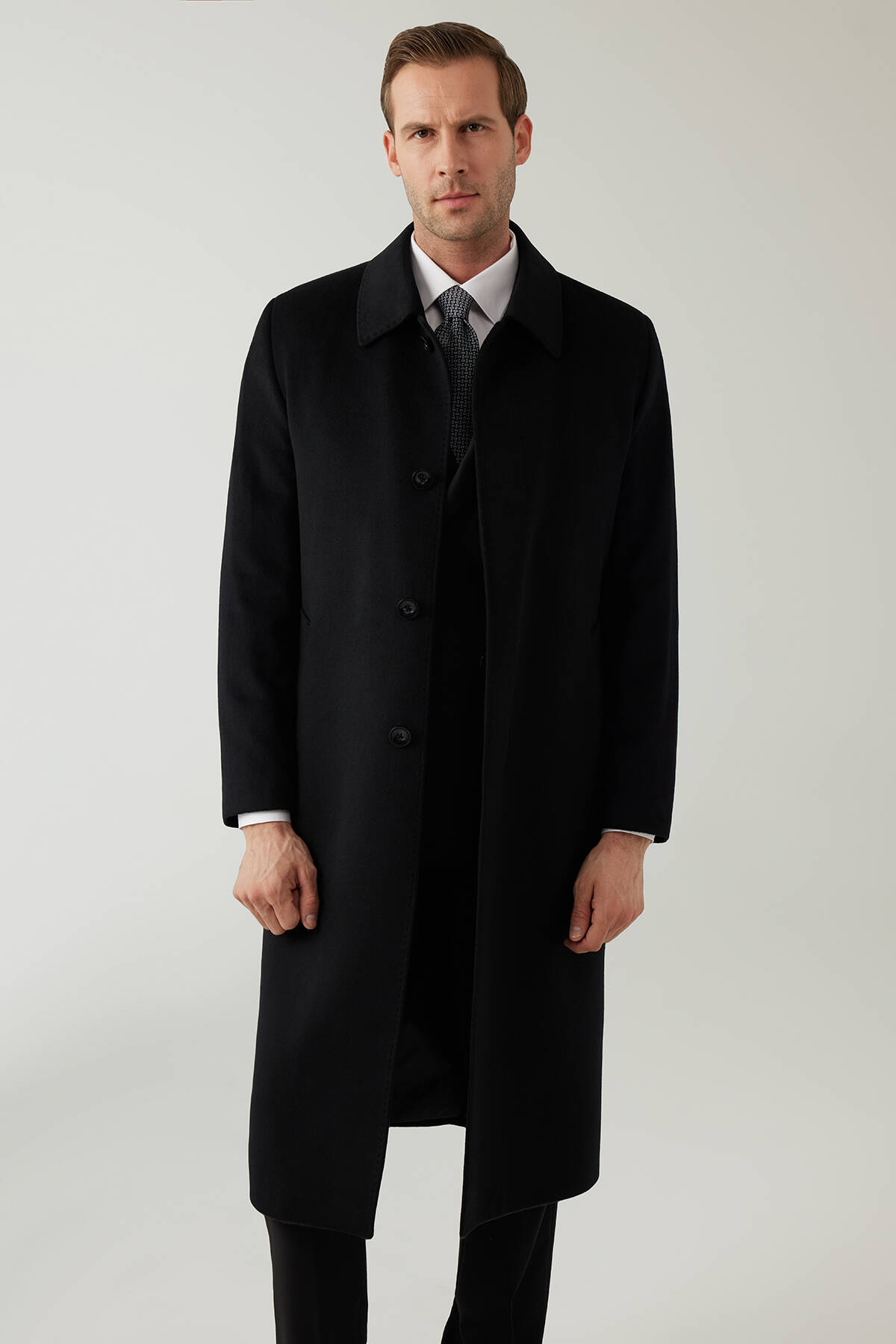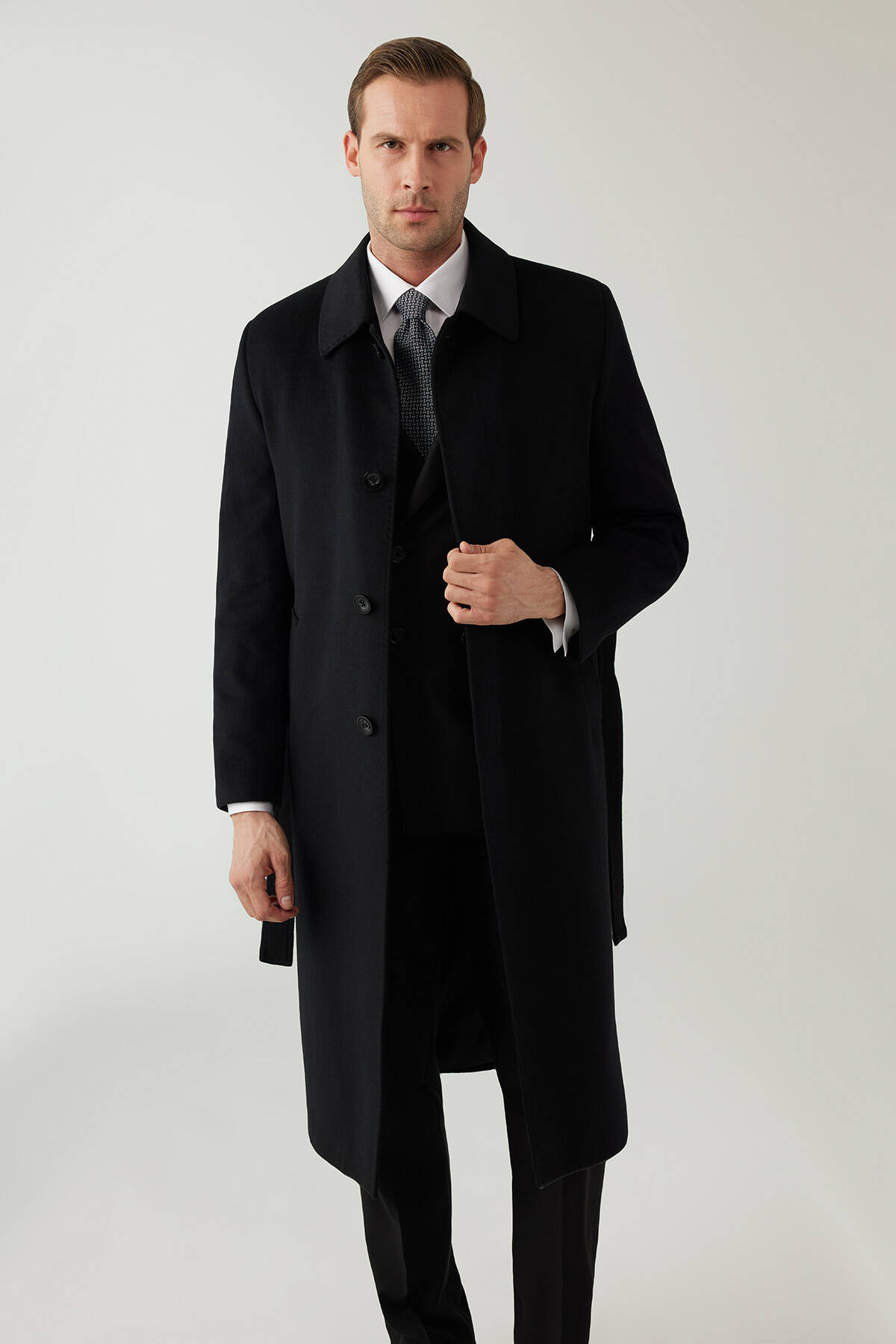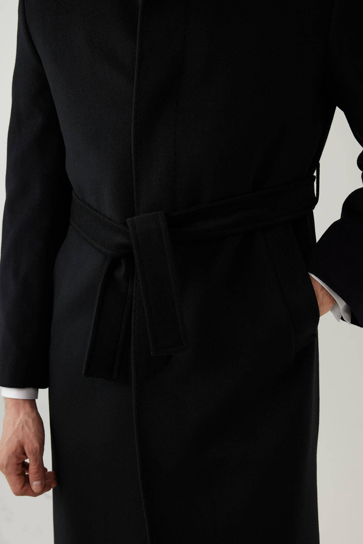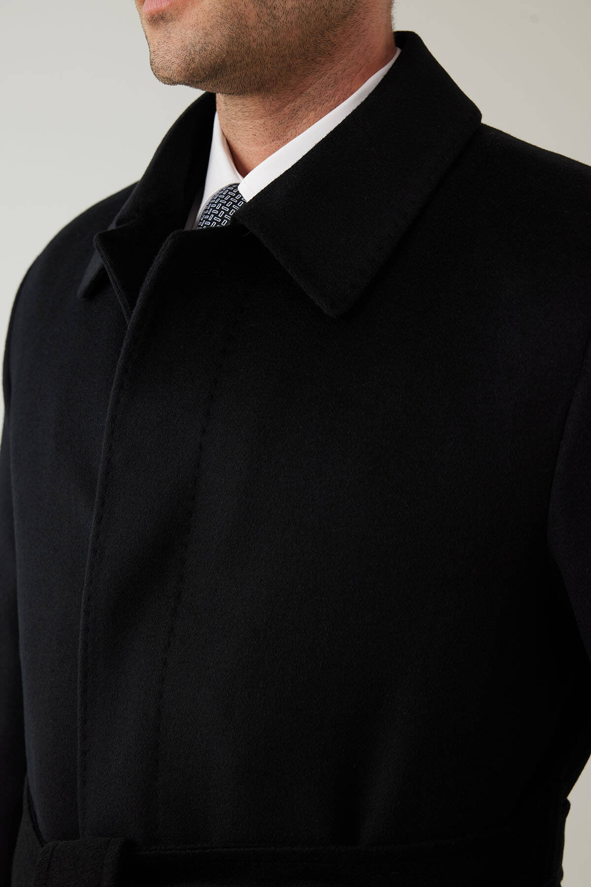 Erkek Siyah Regular Fit Kaşmir Uzun Kuşaklı Palto