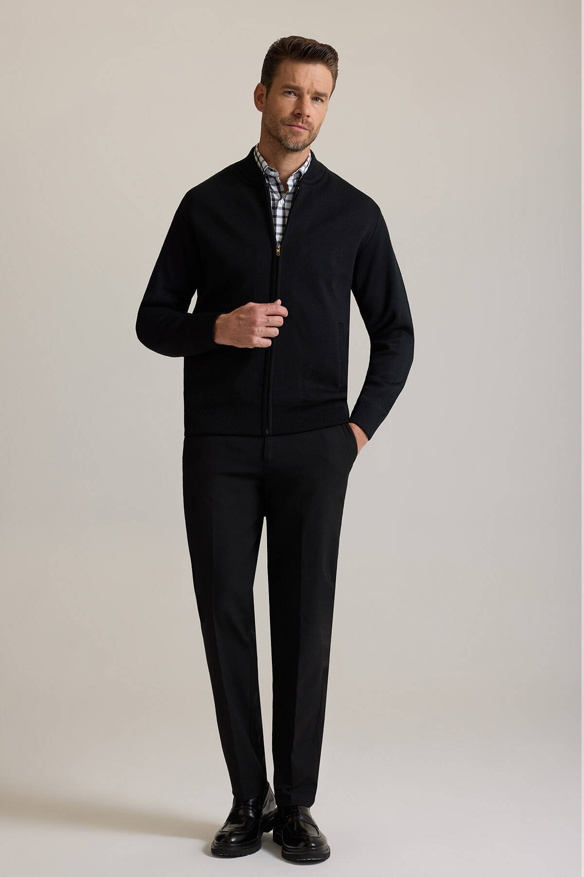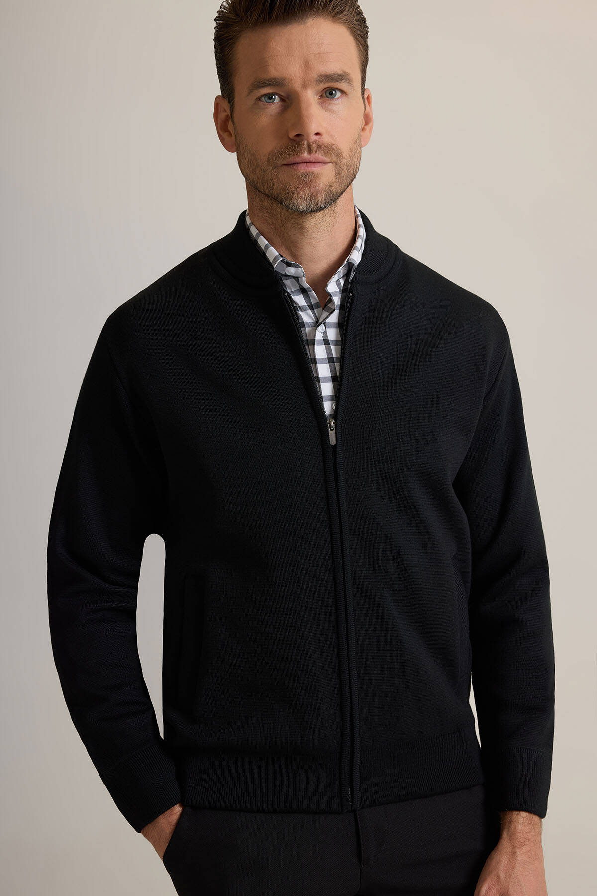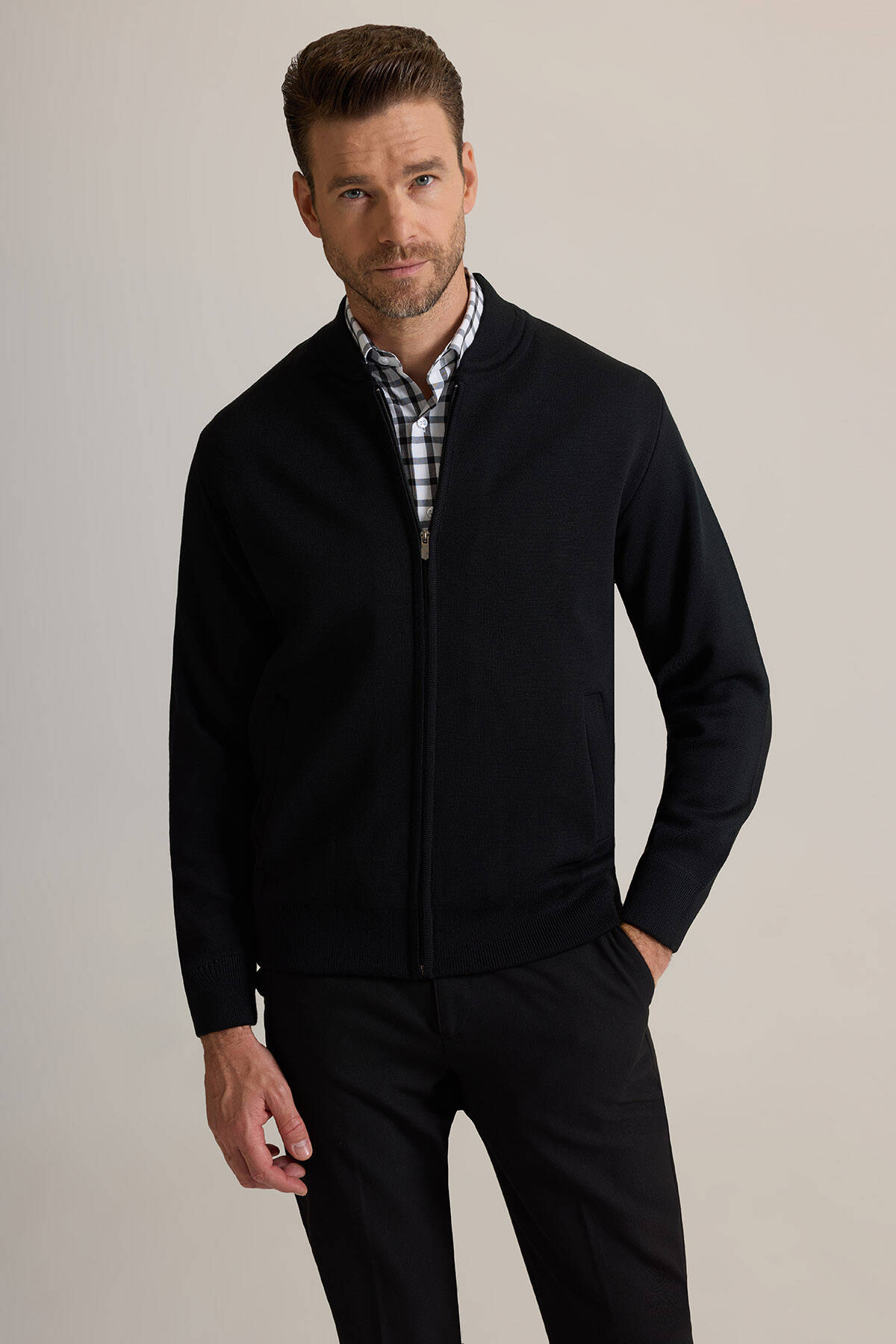 Erkek Siyah Sıfır Yaka İçi Astarlı Fermuarlı Triko Hırka