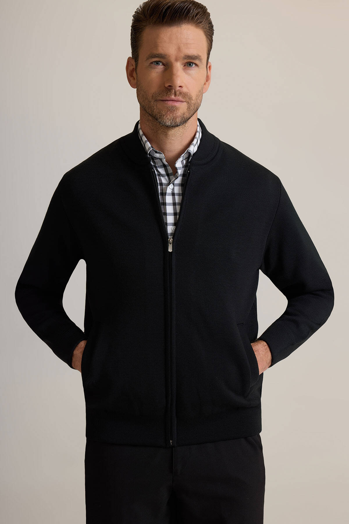 Erkek Lacivert Sıfır Yaka İçi Astarlı Fermuarlı Triko Hırka