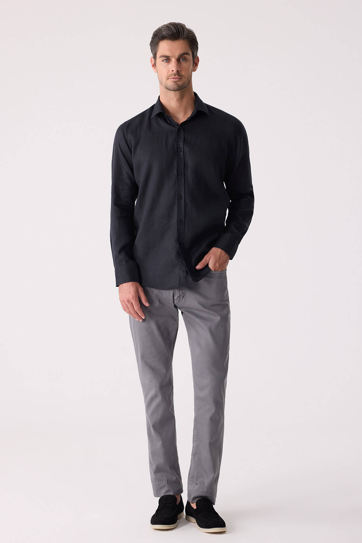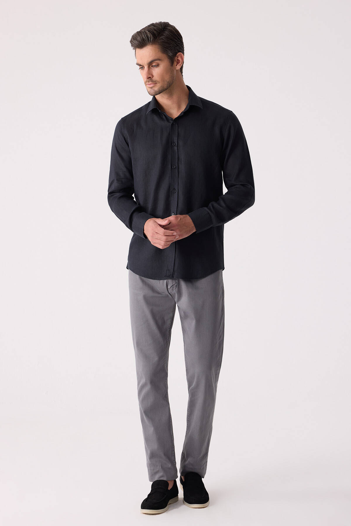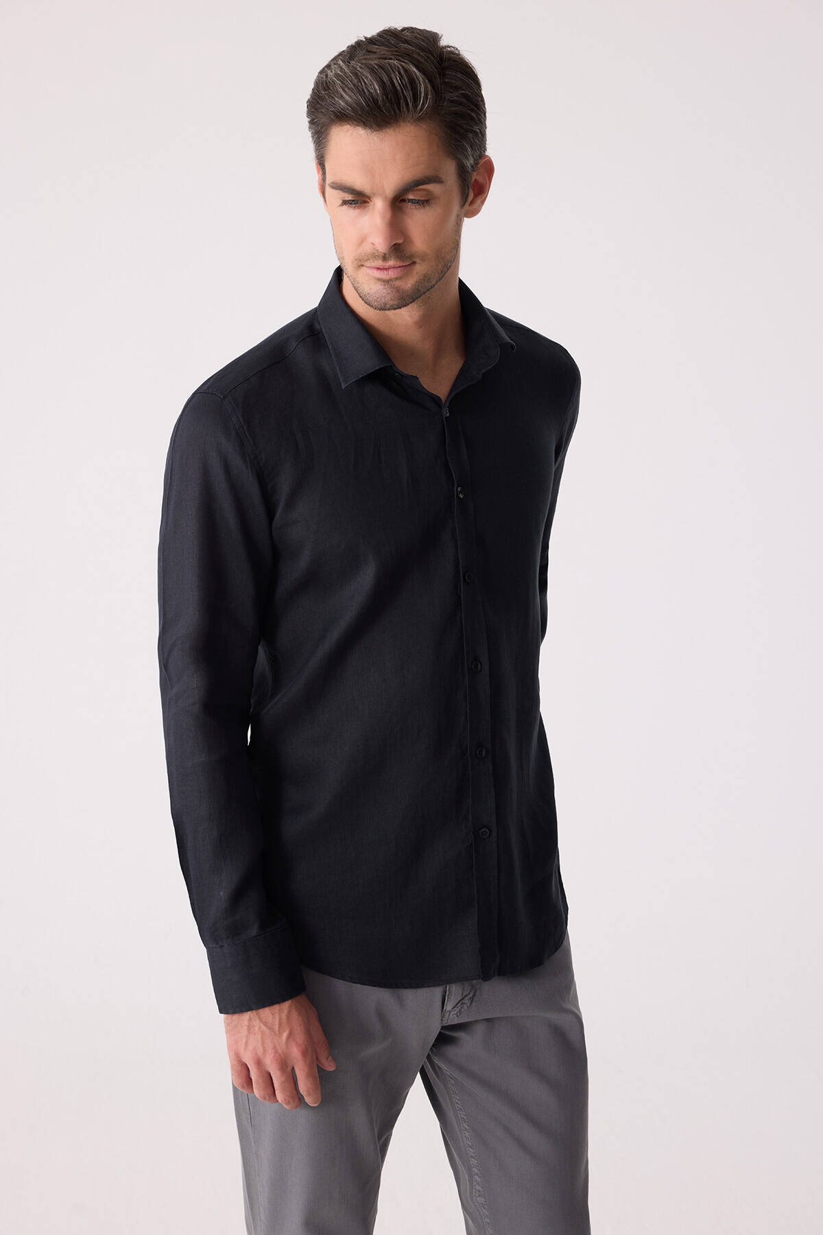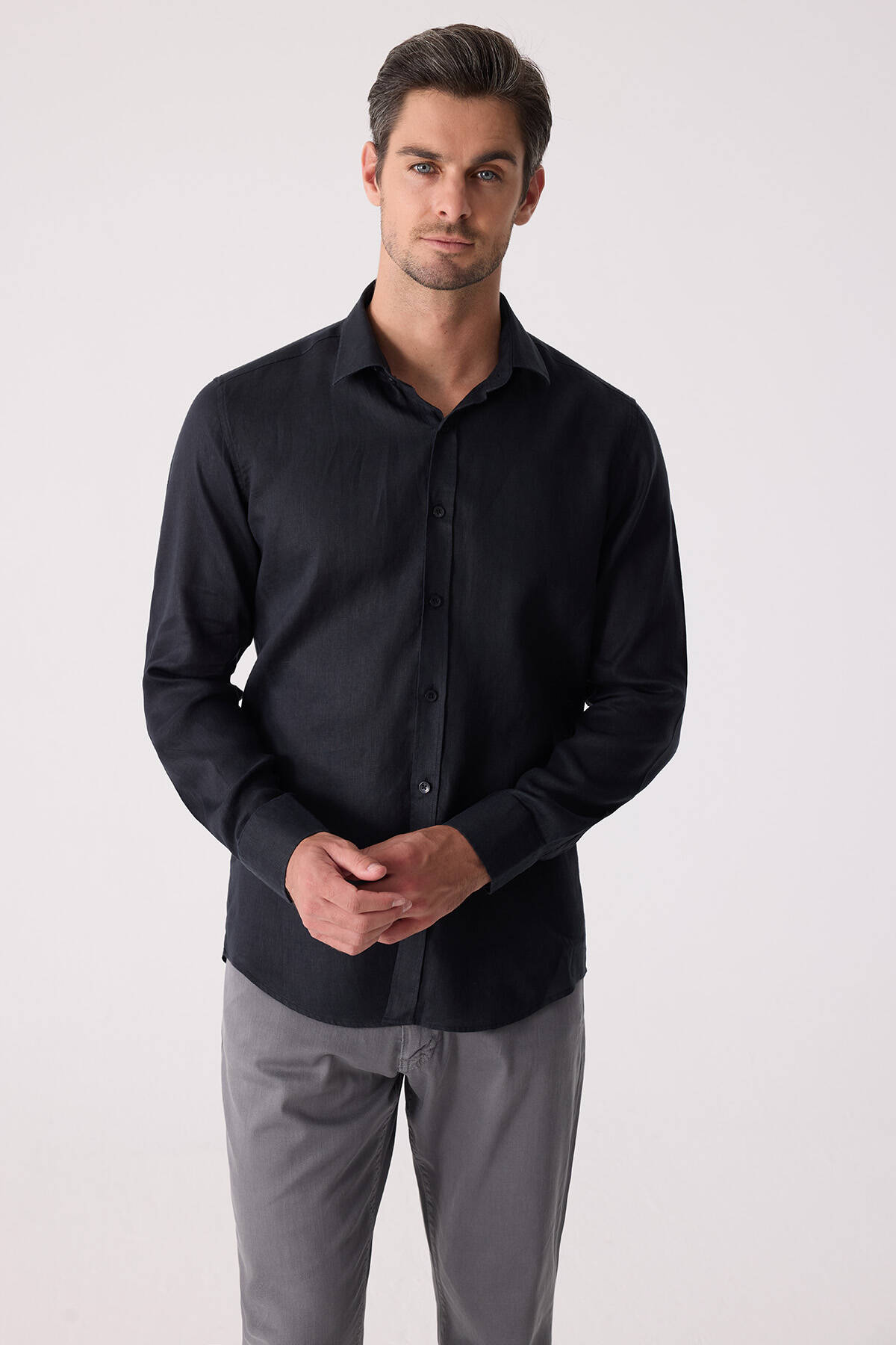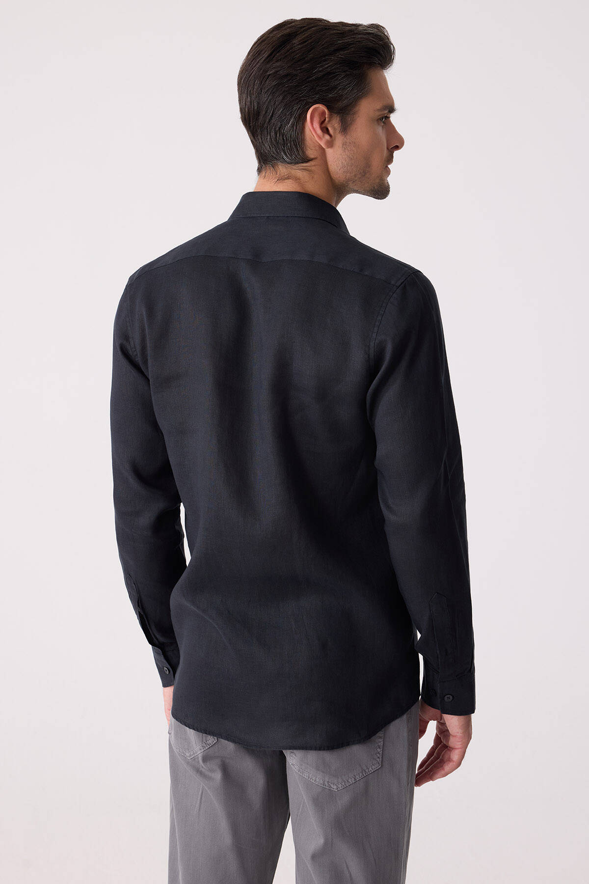 Erkek Siyah Slim Fit Klasik Yaka Keten Gömlek