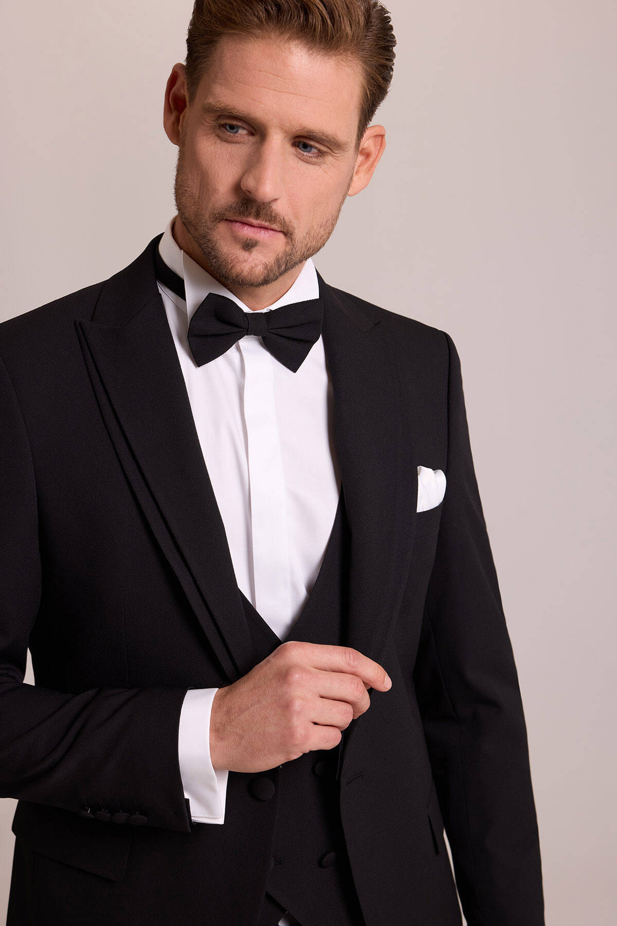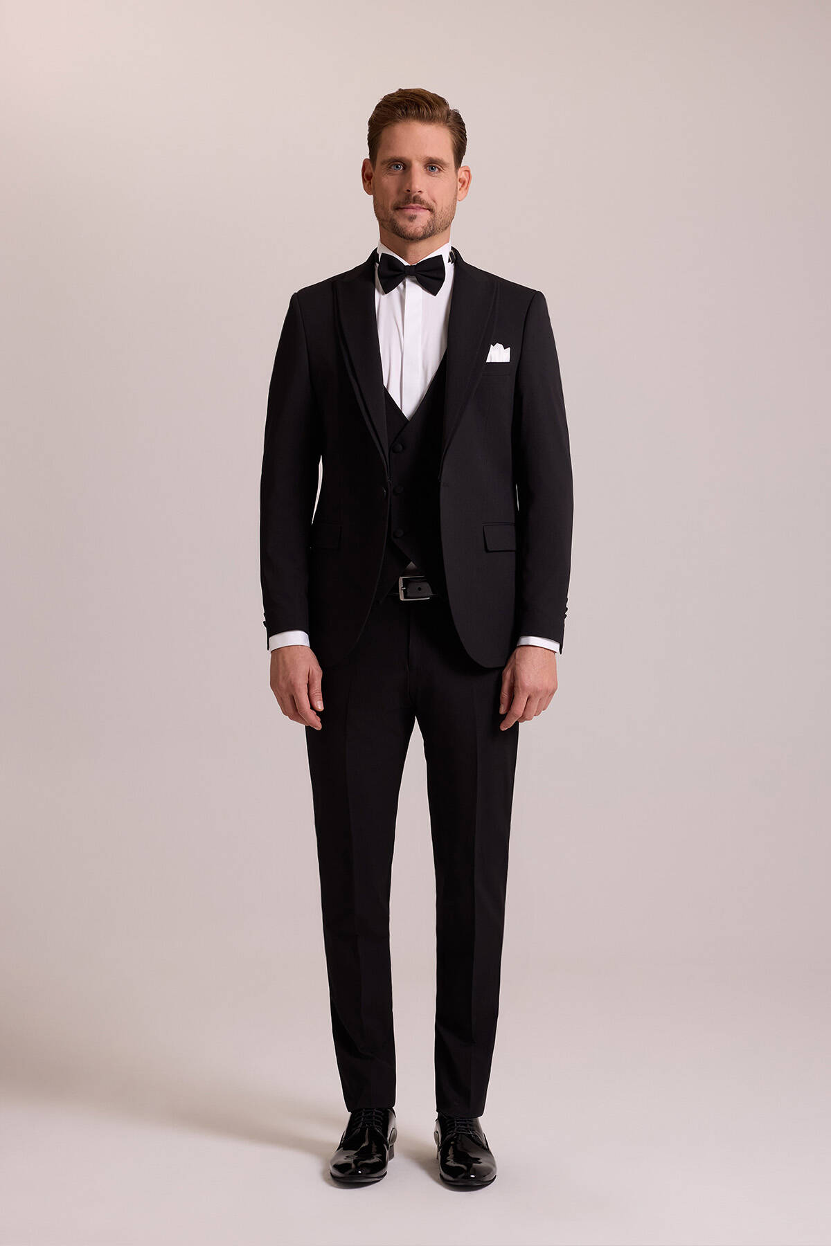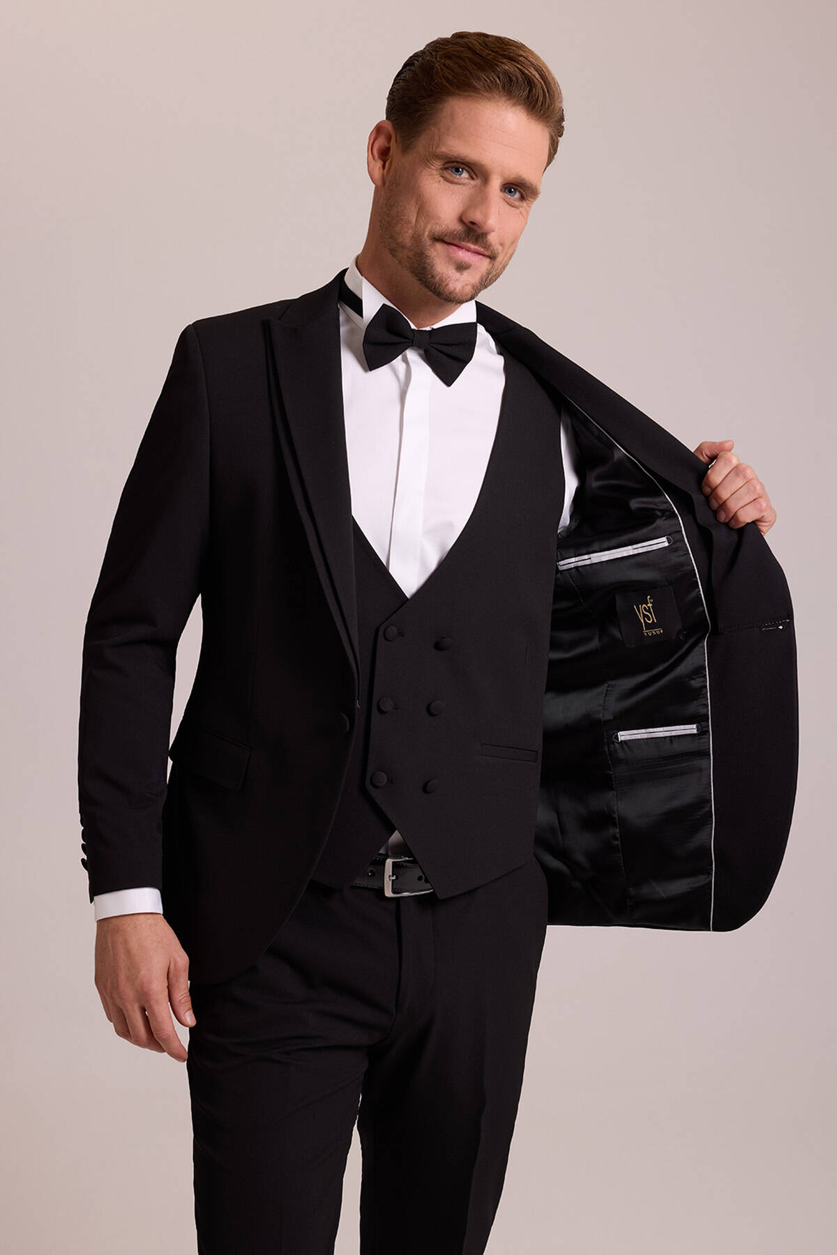Erkek Siyah Slim Fit Likralı Sivri Yaka Yelekli Damatlık