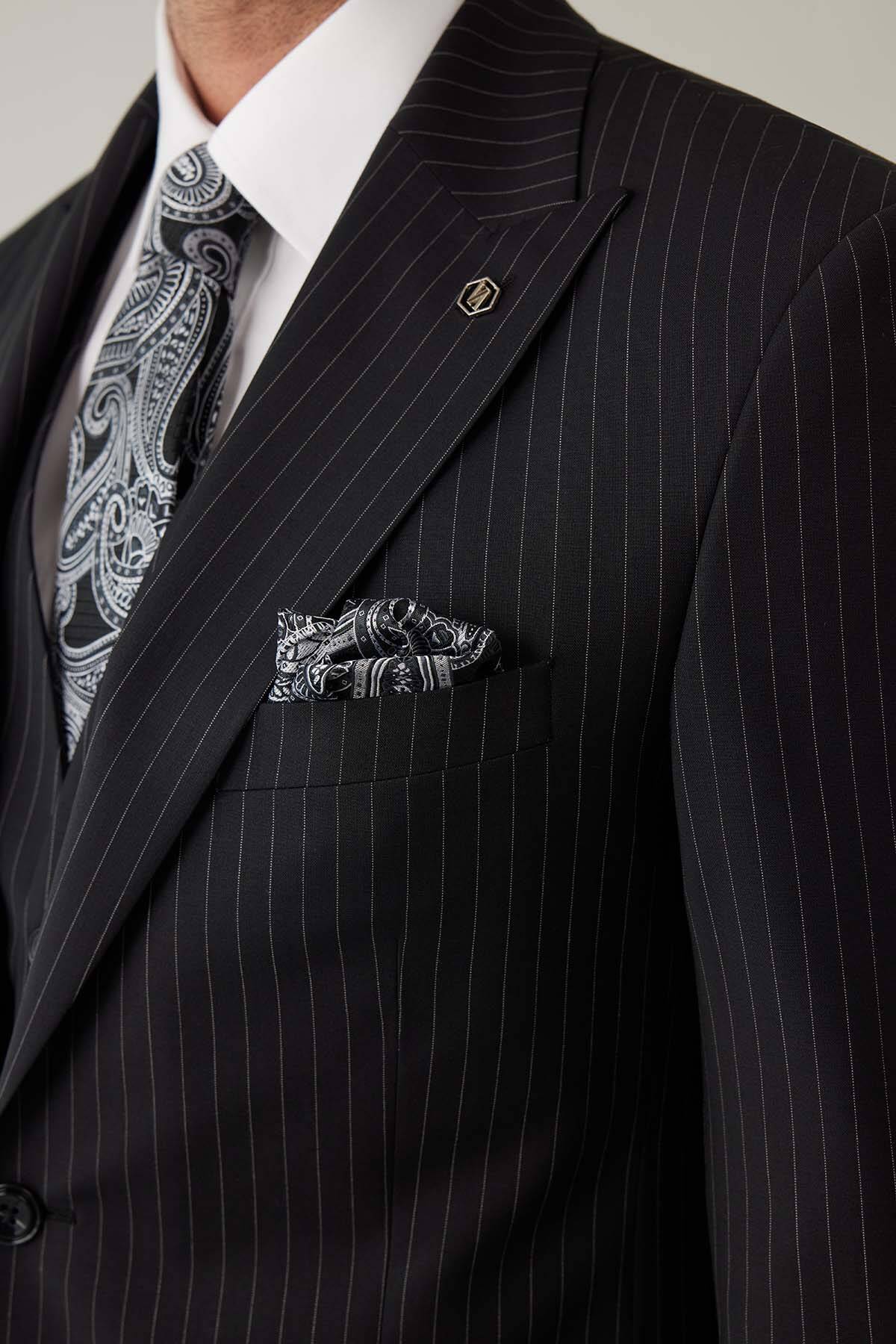 Erkek Siyah Slim Fit Sivri Yaka Yelekli %100 Yünlü Takım Elbise