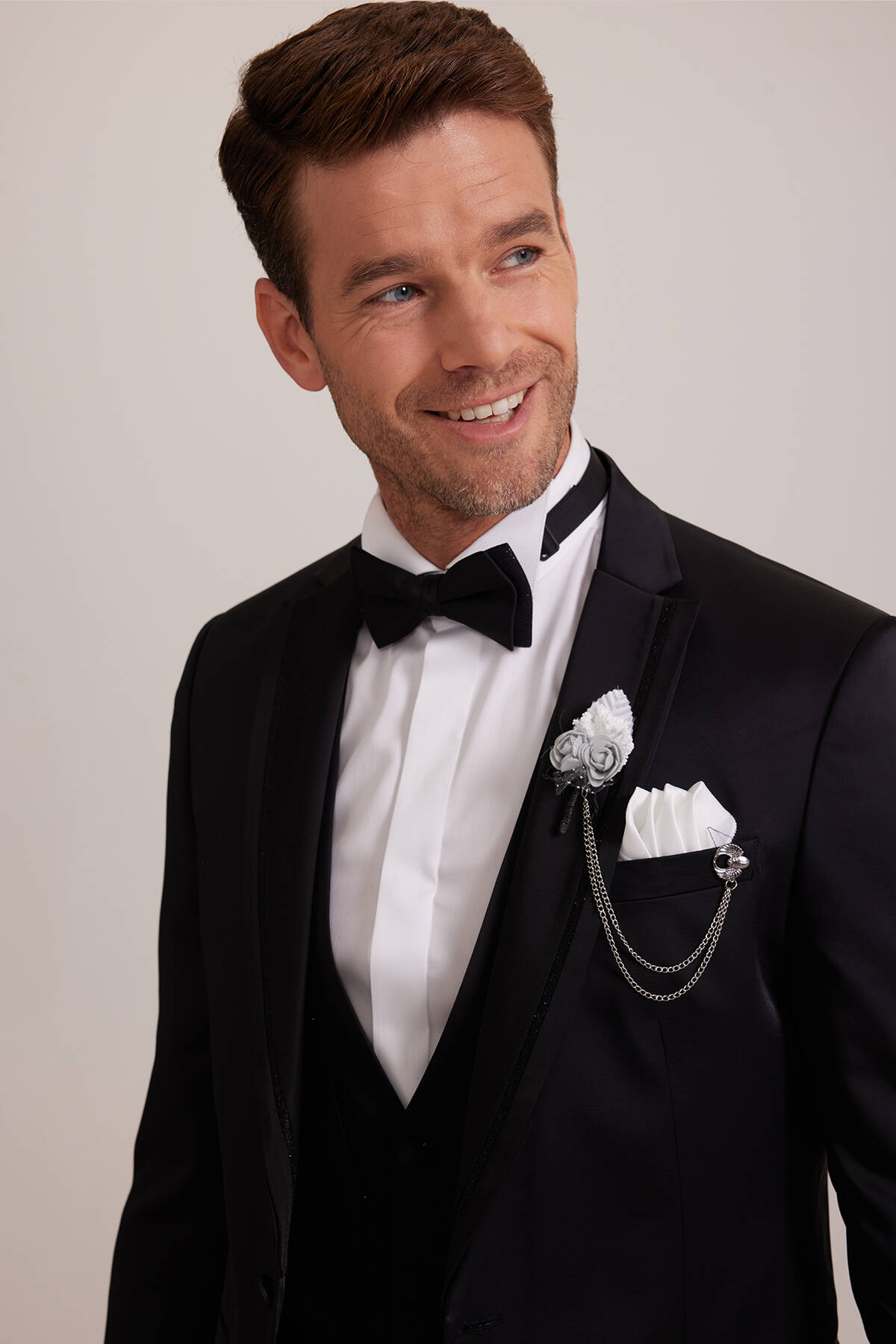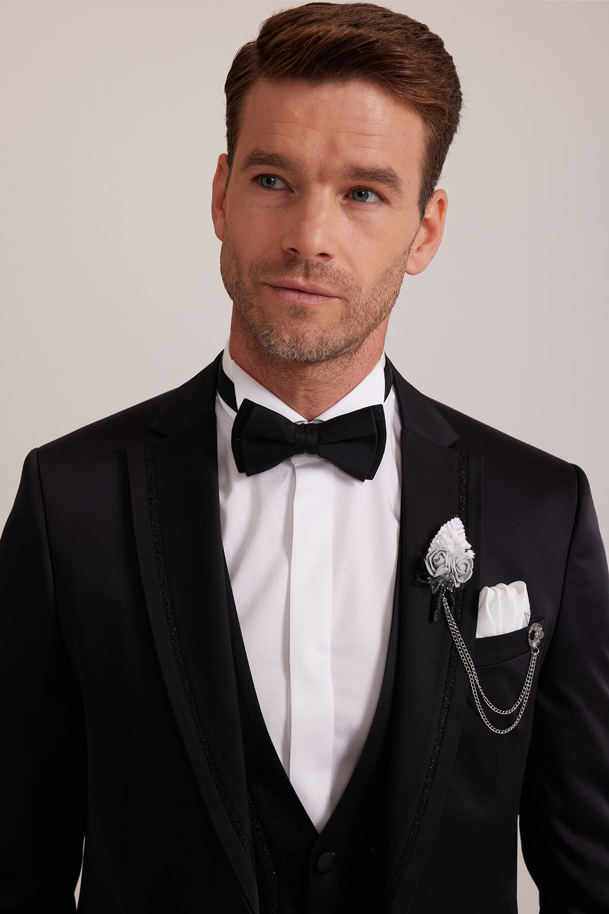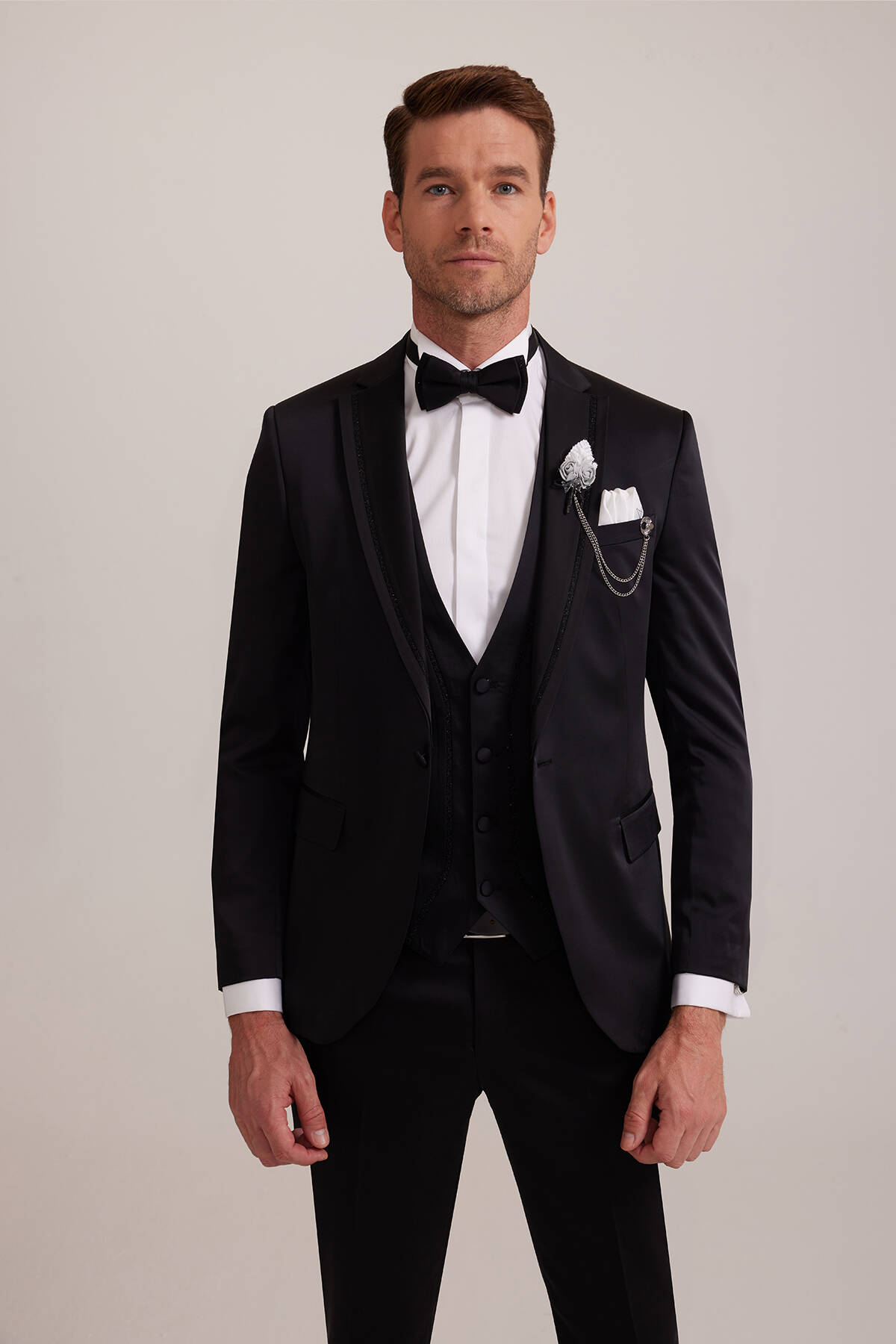 Siyah desenli olarak tasarlanan yelekli damatlık, içinizdeki beyefendiyi sakin ve aynı zamanda iddialı bir tavırla ortaya çıkarmanız için idealdir. Sofistike bir işçilik örneğini temsil eden bu özel damatlık, Ata Yaka Gömlek gibi zarafeti doğal olarak öne çıkaran parçalarla mükemmel görünür. Siyah papyonu ile birlikte sunulan damatlığı şık bir şekilde kombinlemek için beyaz Ata Yaka Gömlek, rugan klasik ayakkabı, beyaz yaka mendili ve deri kemer gibi premium parçalar seçebilirsiniz. Özel günlere yakışır romantizm duygusunu aynı anda hissettirmek için kırmızı yaka çiçeği ve zinciri gibi çarpıcı aksesuarlardan da destek alabilirsiniz. YSF Giyim, bir sonraki nesile aktarılabilecek en kaliteli damatlık modellerini beğeniye sunar. Siz de klasik giyim tarzınızı en özel anlarda karizmatik bir şekilde öne çıkarmak için YSF Giyim damatlıkları ayrıcalıklı fiyatlarla sipariş edebilirsiniz.