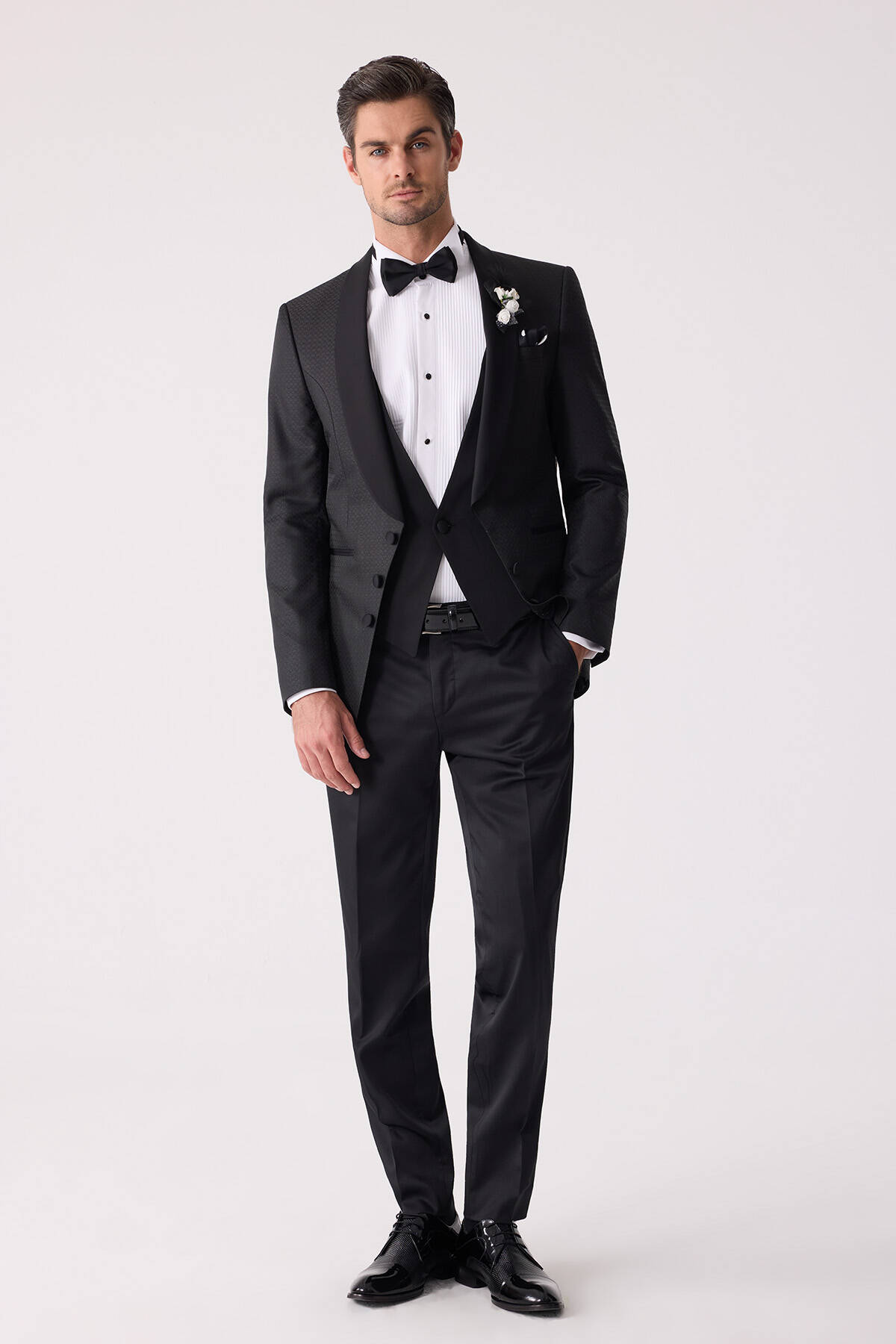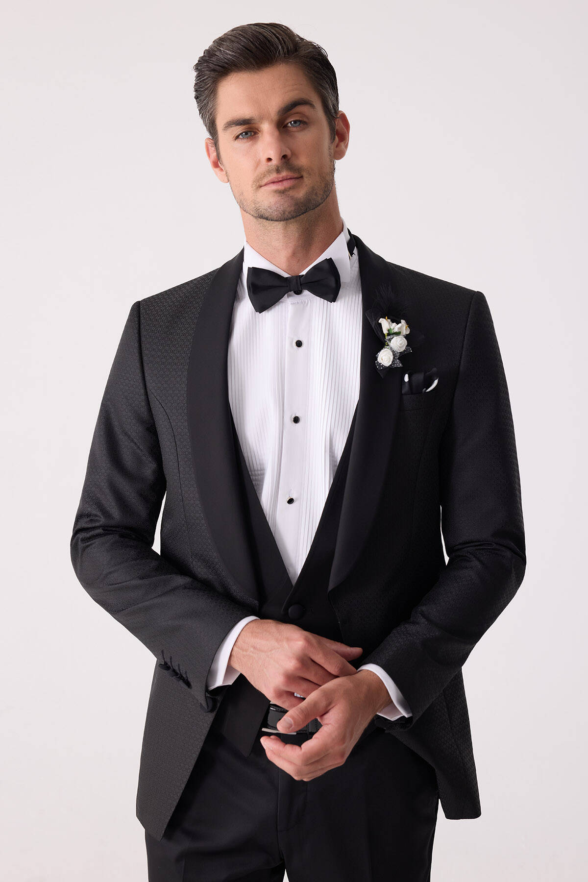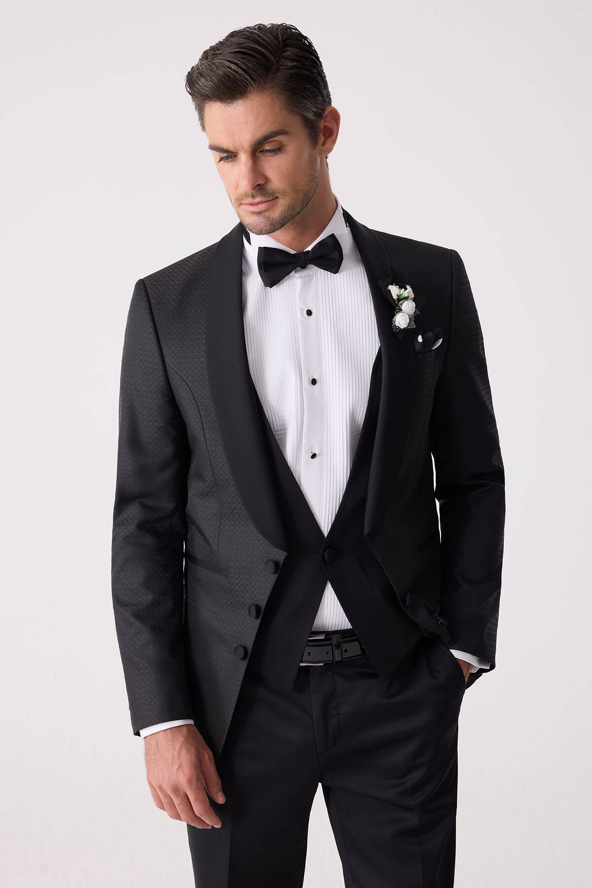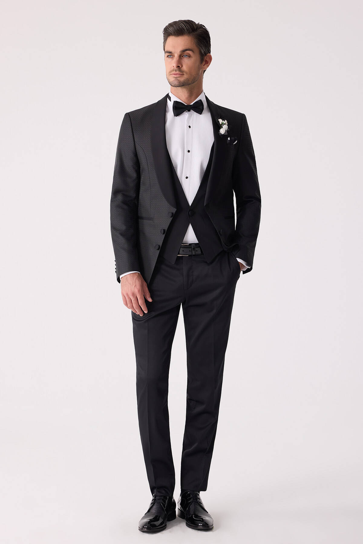 Gelince Haber VerErkek Siyah Yelekli Şal Yaka Slim Fit Damatlık, YSF Giyim’in damatlık kreasyonunun en özel ve ilham verici tasarımlarından biridir. Baştan aşağı keskin, uyumlu ve özel bir görünüm için yelek, ceket ve pantolon olmak üzere üç parça şeklinde tasarlanmıştır. Yelekli damatlığın slim fit formu metropol erkeklerinin düğün veya nişan törenleri için kusursuz bir silüeti yansıtır. İnce viskon dokuya sahip damatlık, pürüzsüz çıkma şal yakaya, kaplı düğmelere ve ceplerde zarif süslemelere sahiptir. Kendinden desenli iddialı ve çekici dokusu ise minimal çizgilere dinamik bir tarz katmak için idealdir.