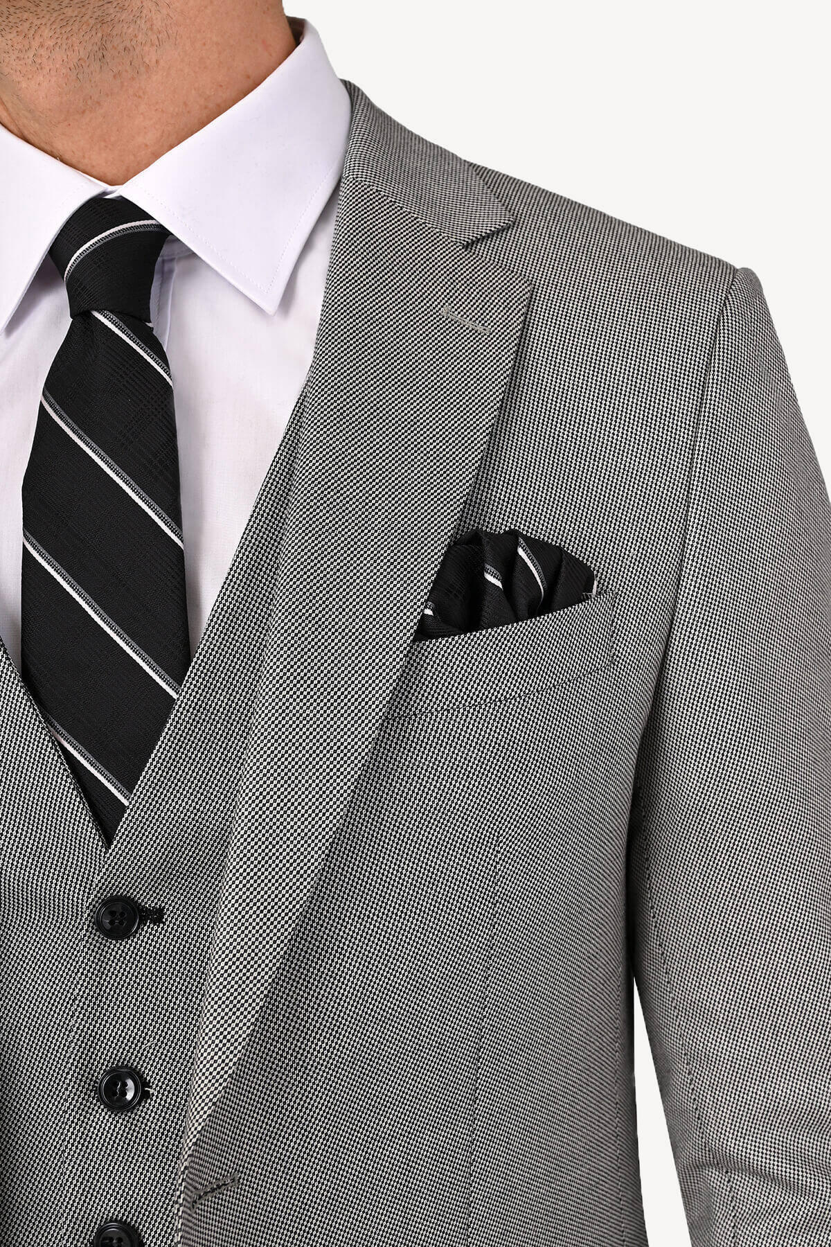 Erkek Siyah Gri Slim Fit Yelekli Desenli Takım Elbise