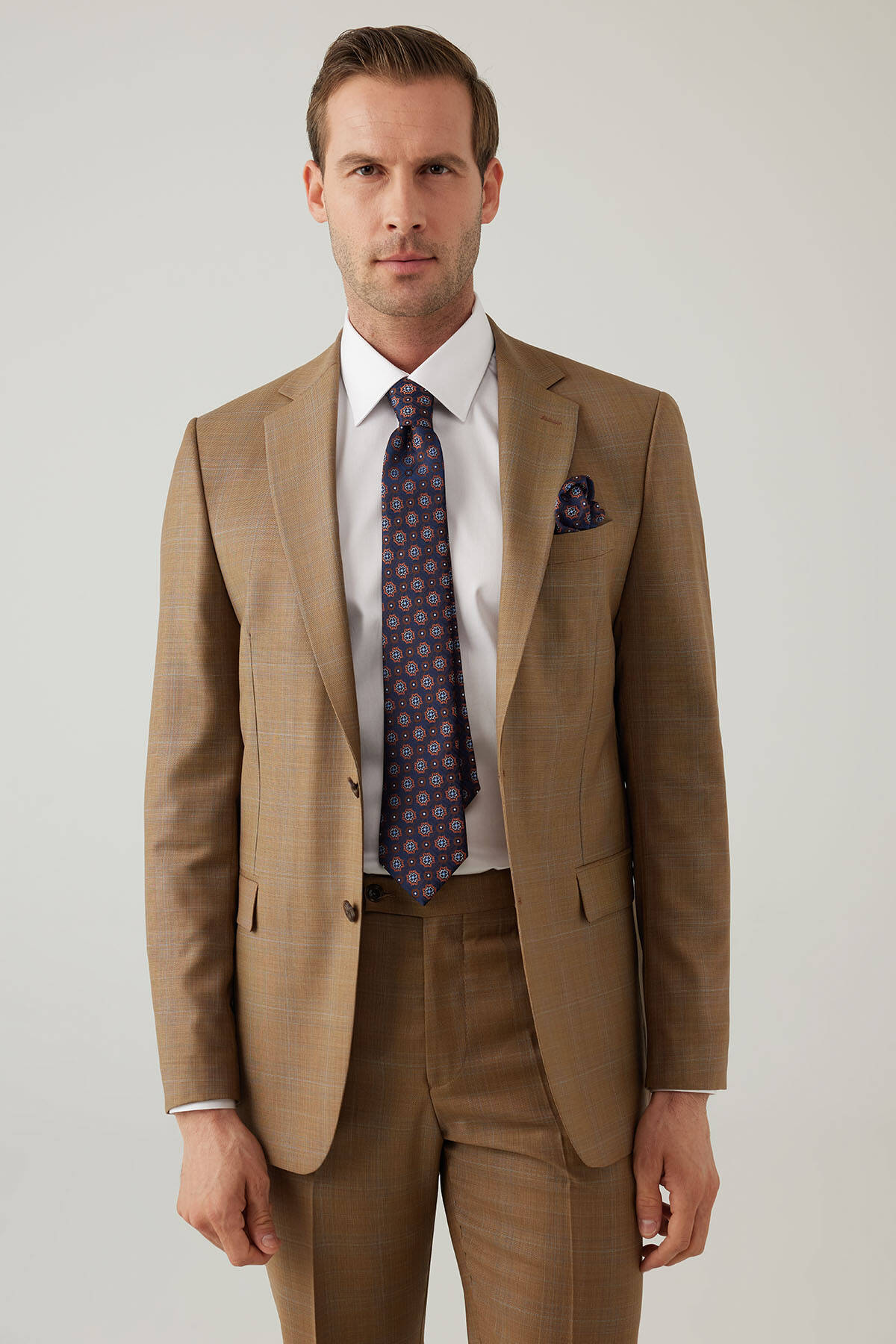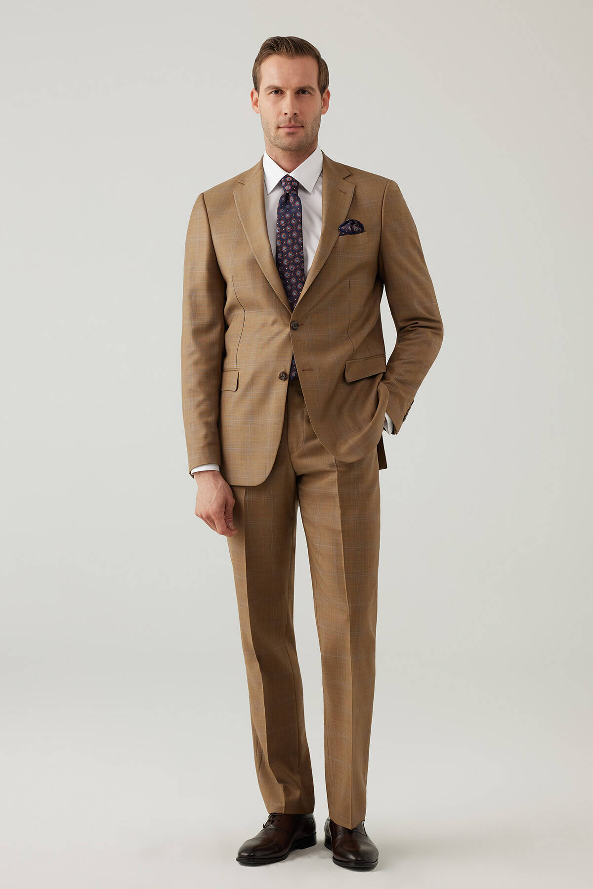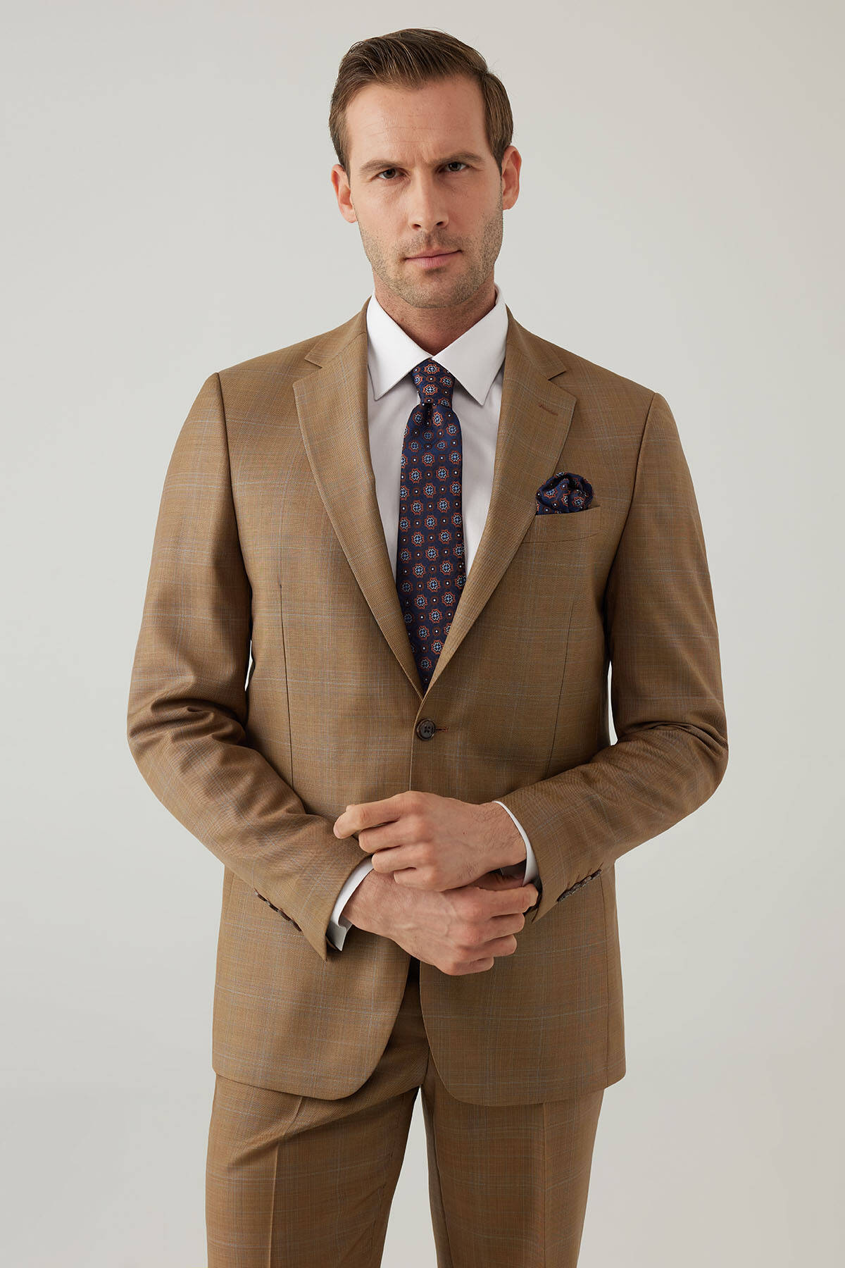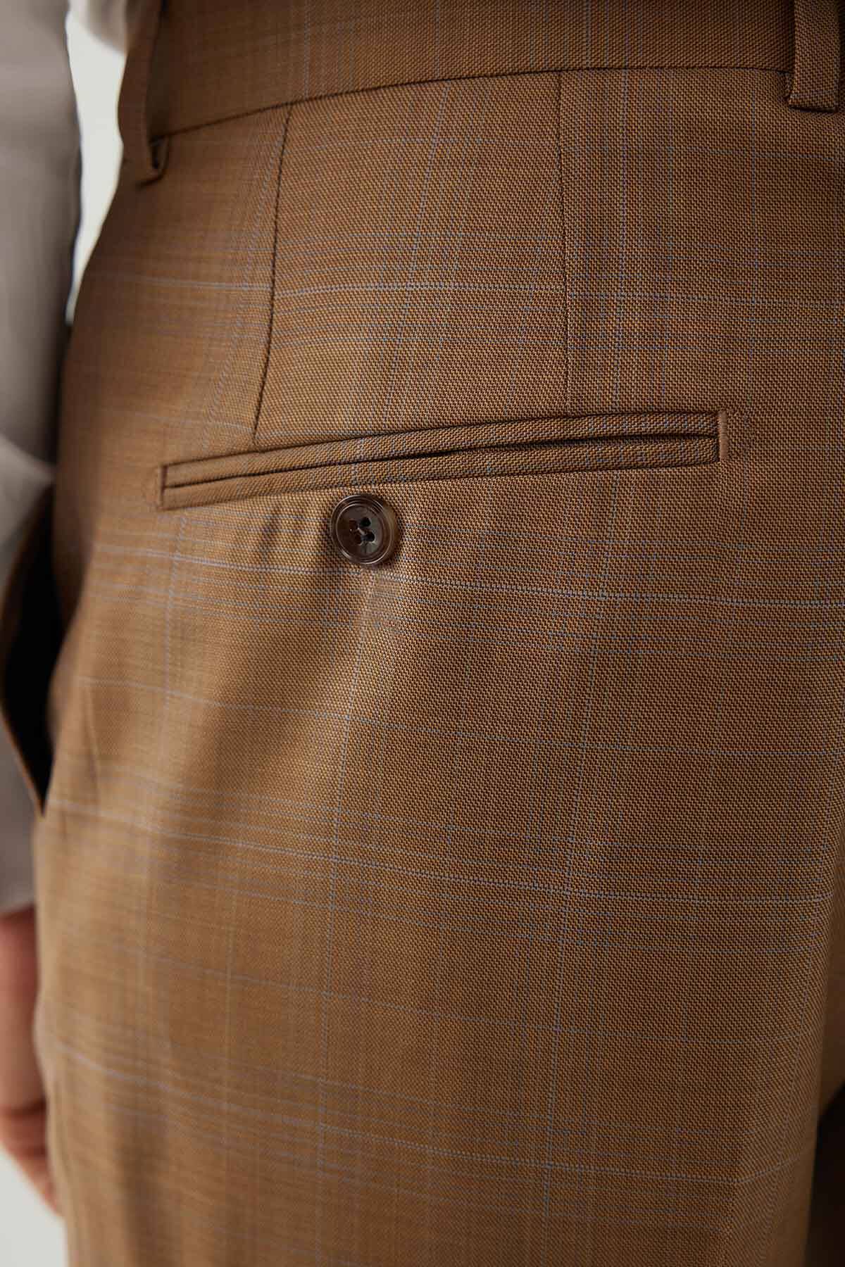 Erkek Taba Regular Fit Mono Yaka Kareli Takım Elbise