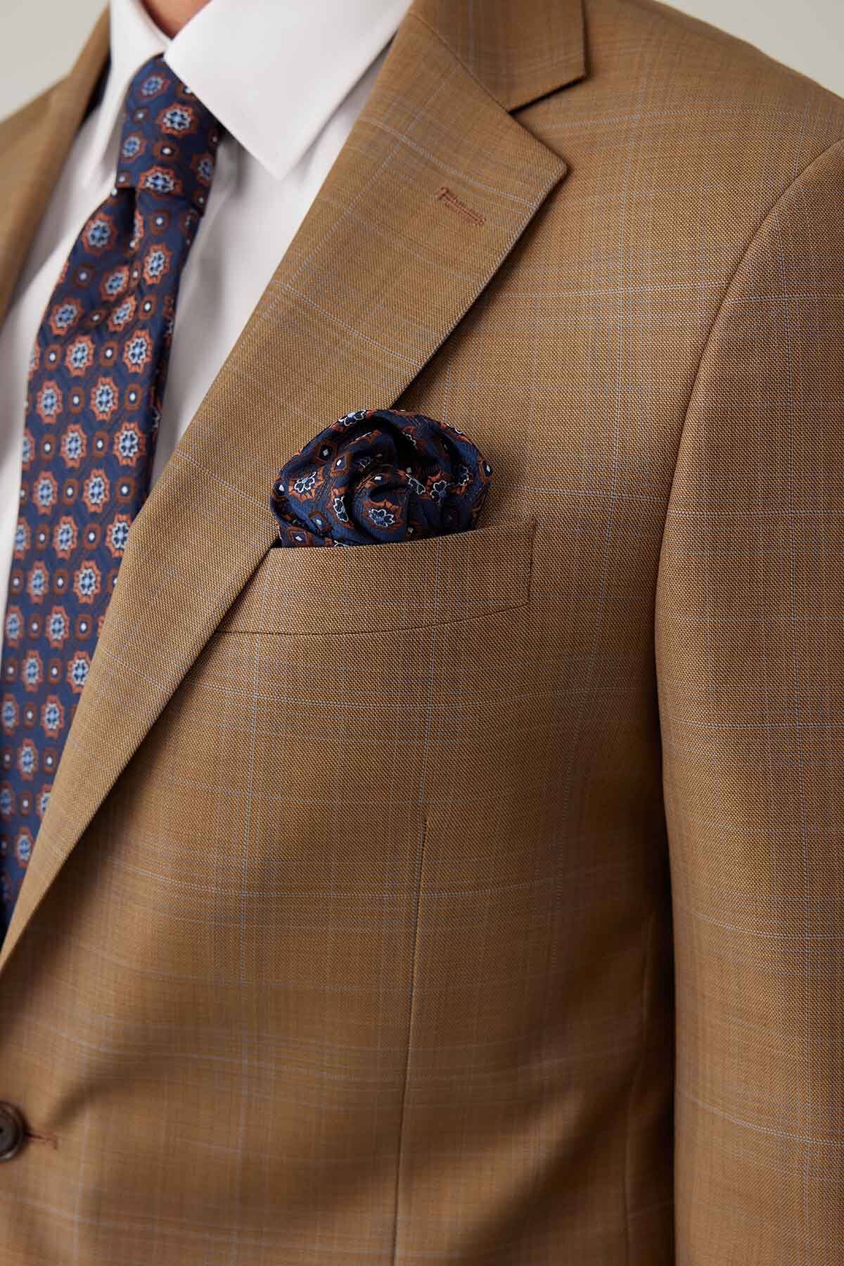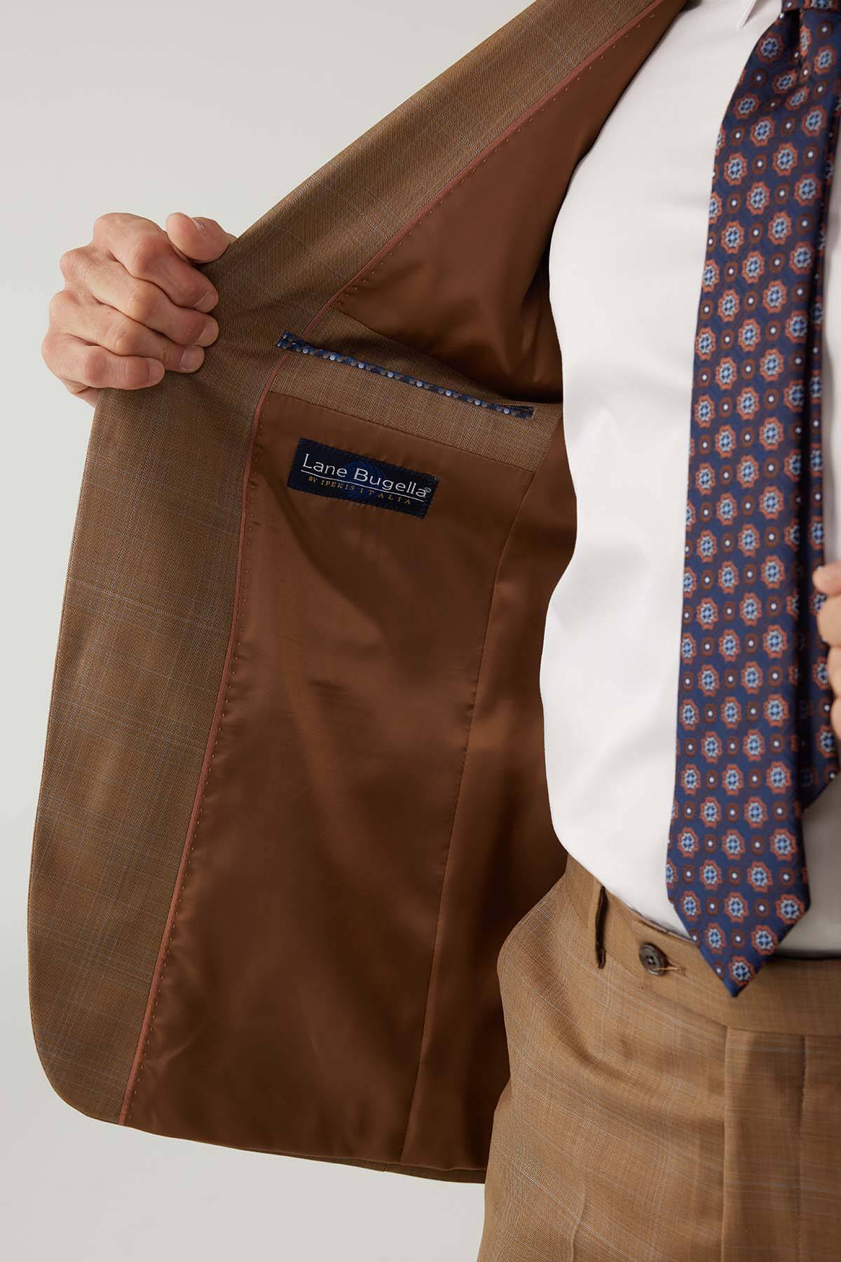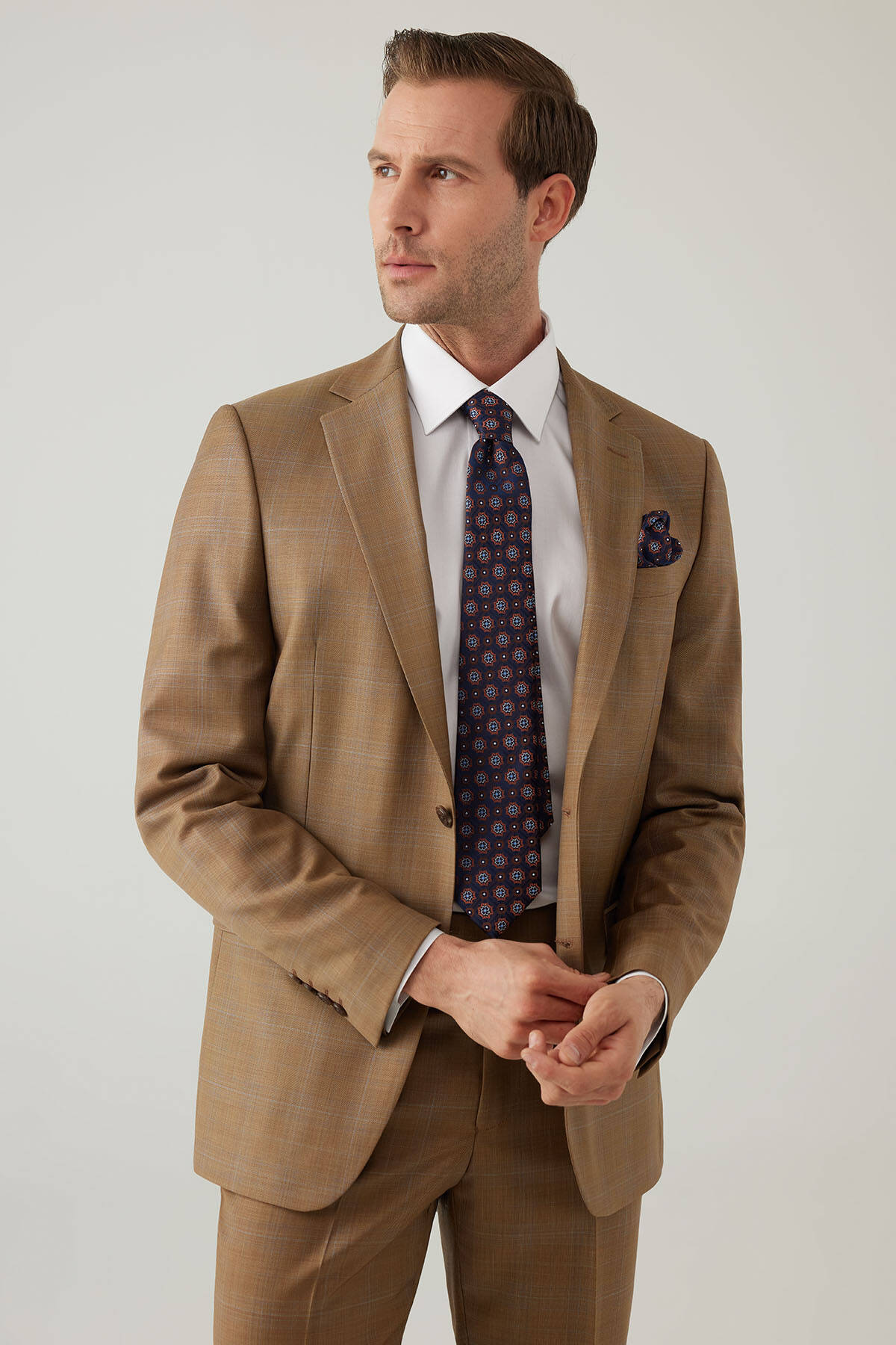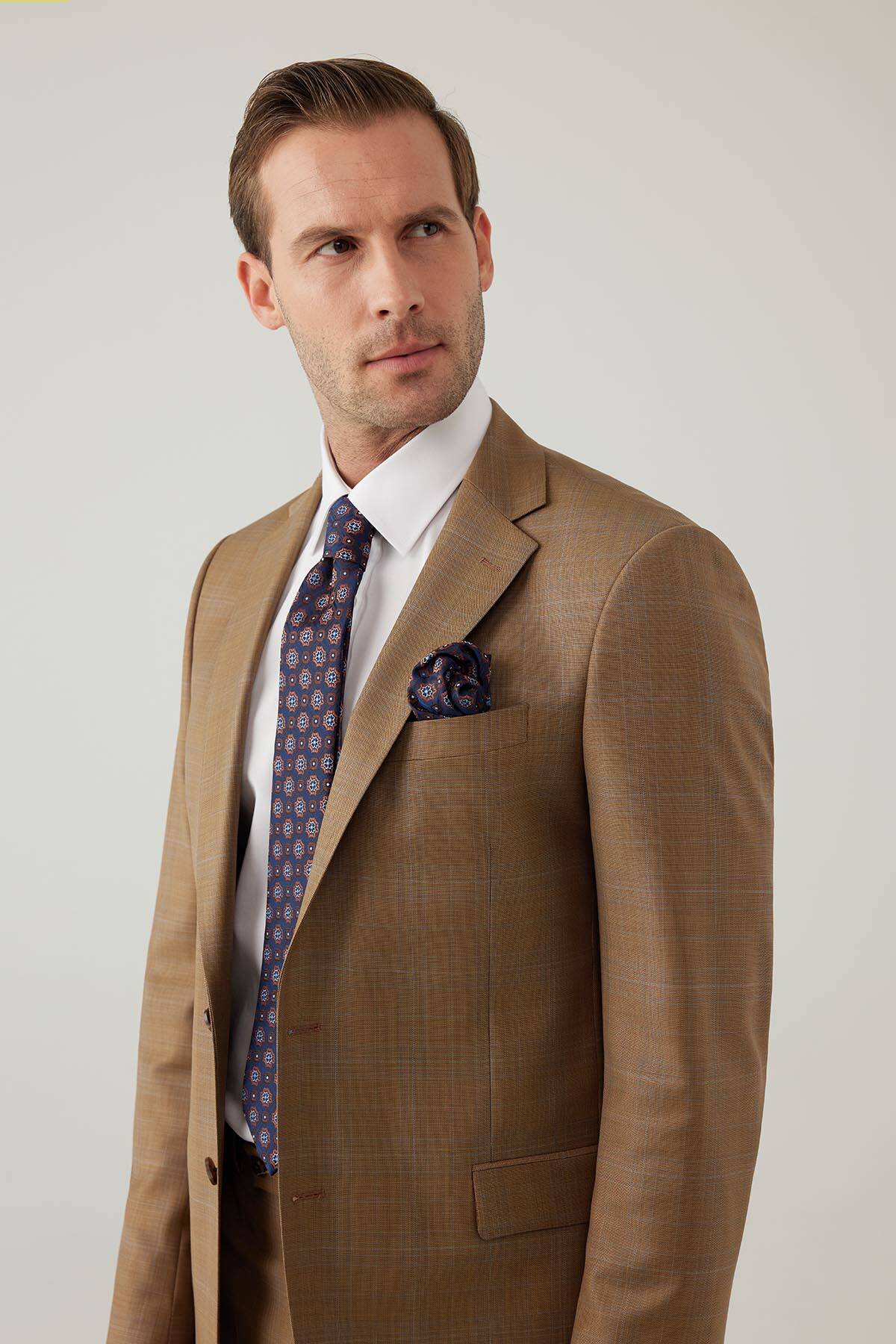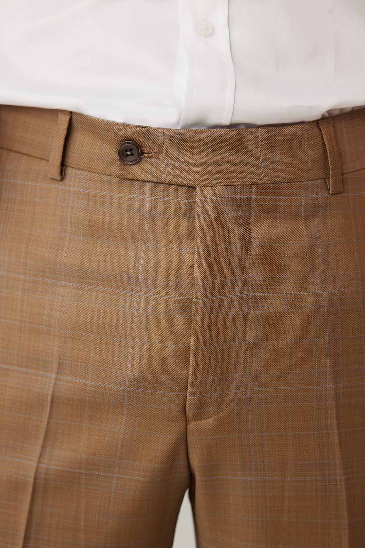 Erkek Taba Regular Fit Mono Yaka Kareli Takım Elbise