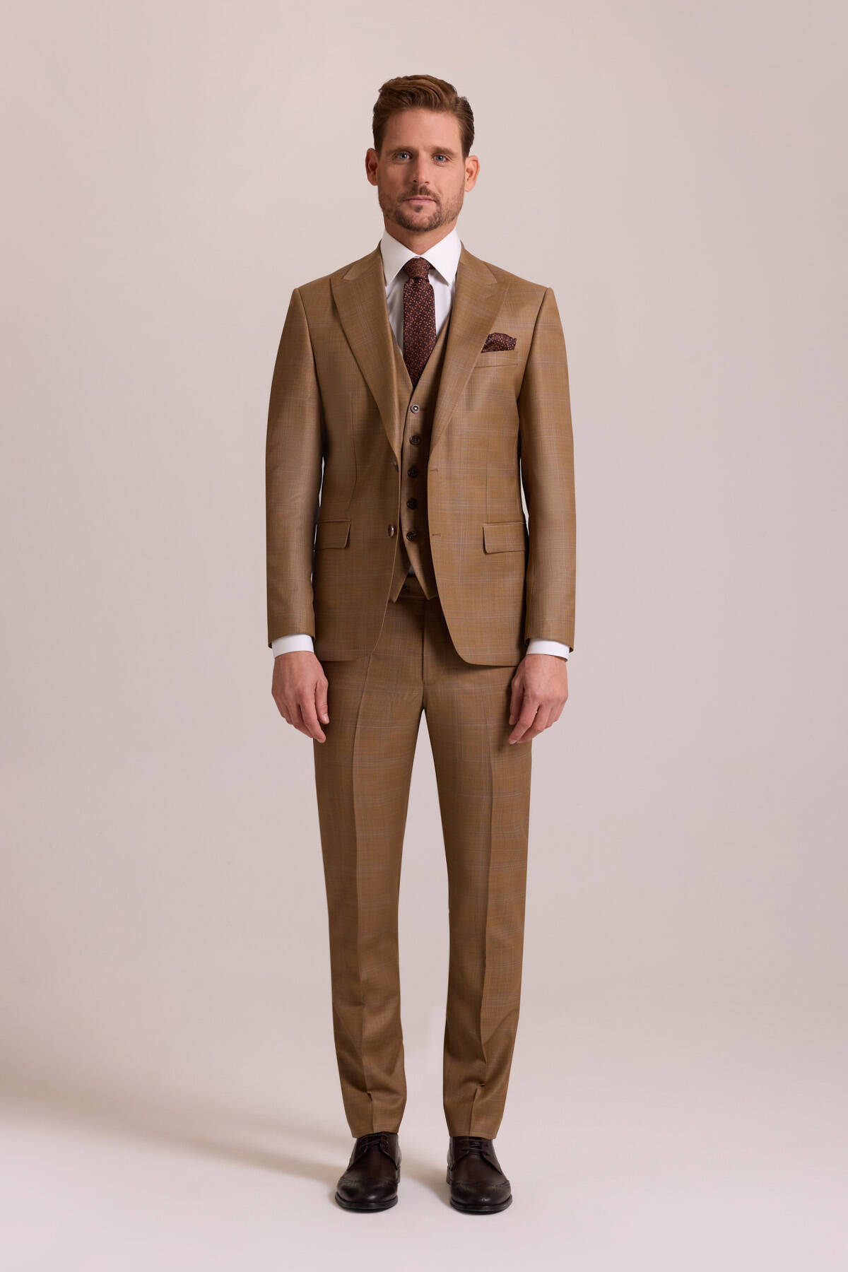 Taba renginin zamansız ve iddialı silüetine eşlik eden ekose desenler bu şık yün takım elbise modelinin her dönem havalı bir seçim olmasını sağlar. İster önemli iş toplantılarına ister sonbahar düğünlerine katılın, üçlü takım her ortamda stilinizle bir adım önde olmanızı sağlar. Ofis giyimi ya da özel günler için beyaz gömlek, kahverengi deri ayakkabı, desenli kravat ve cep mendili gibi zarif parçalarla kombin yapabilirsiniz. Resmî giyim rotasyonunuzu canlandırmak için en klas slim fit takım elbise modellerini YSF Giyim’in avantajlı fiyatları ile koleksiyonunuza ekleyebilirsiniz!