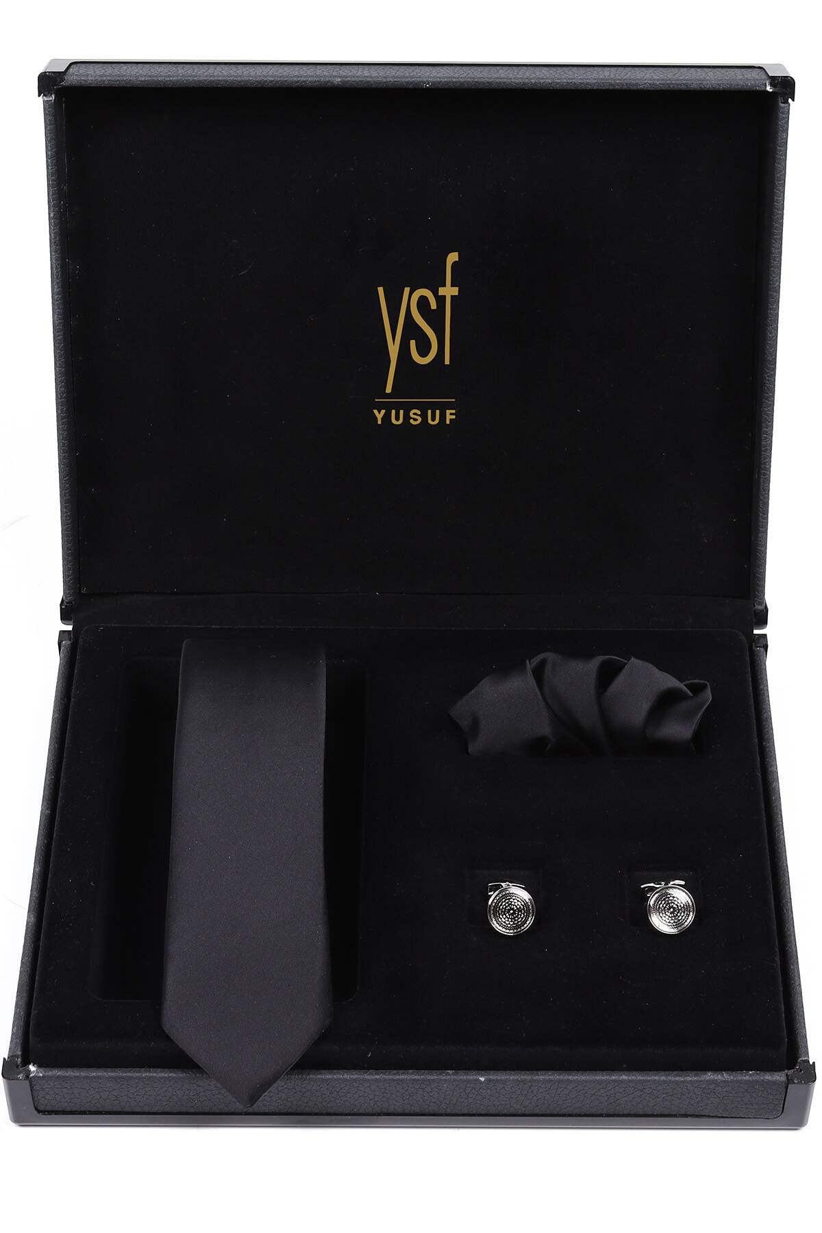 Erkek Siyah Kravat Mendil Kol Düğmesi Set