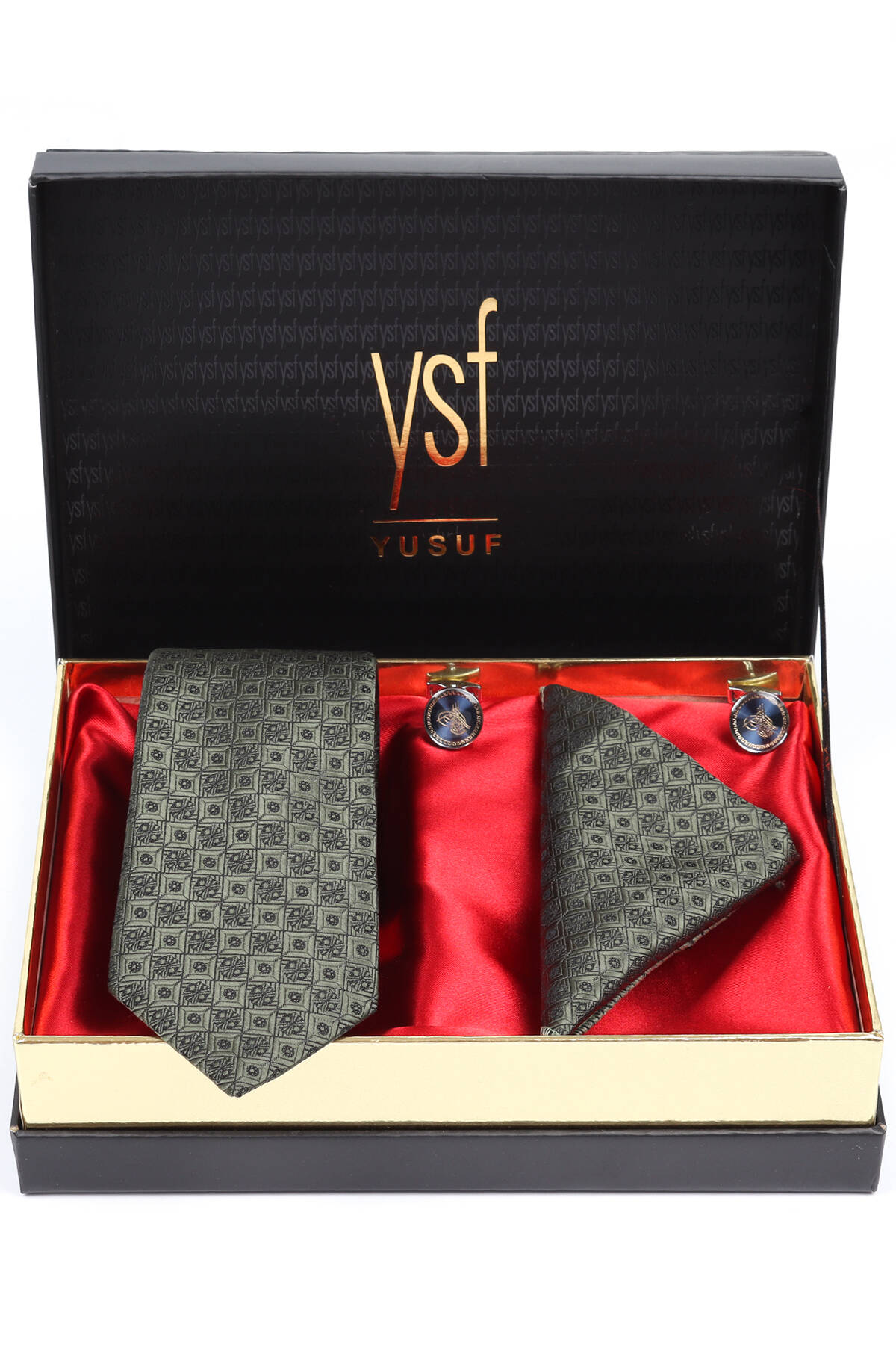 Erkek Yeşil Kravat Mendil Kol Düğmesi Set