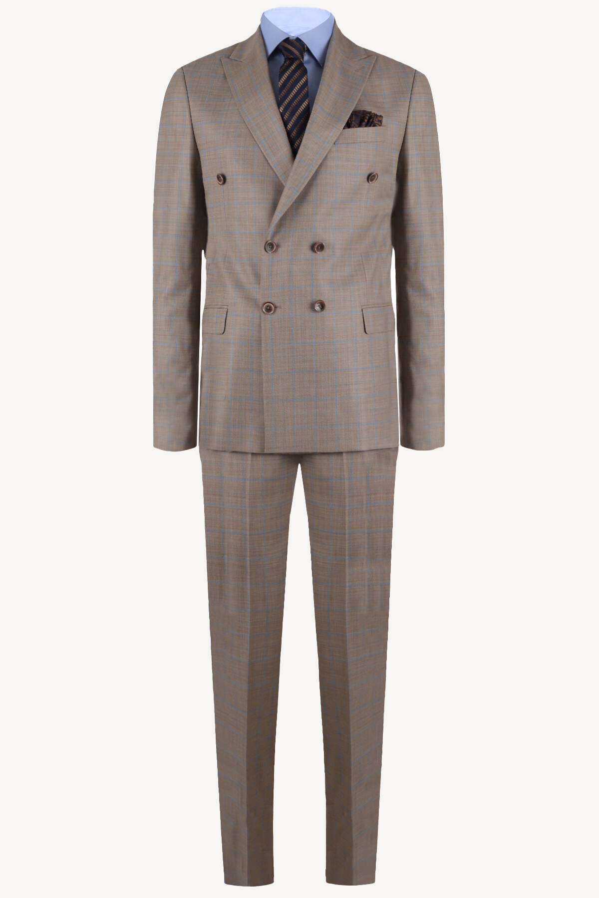 Erkek Kahverengi Çizgili Regular Fit Kruvaze Takım Elbise